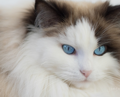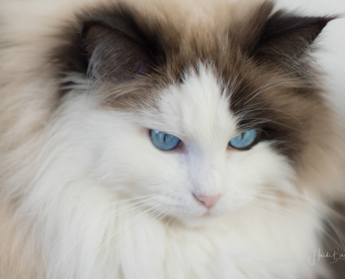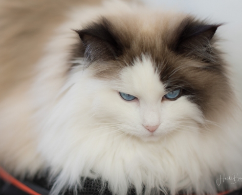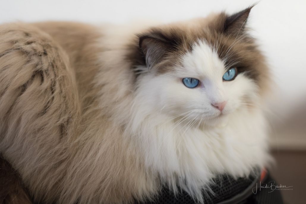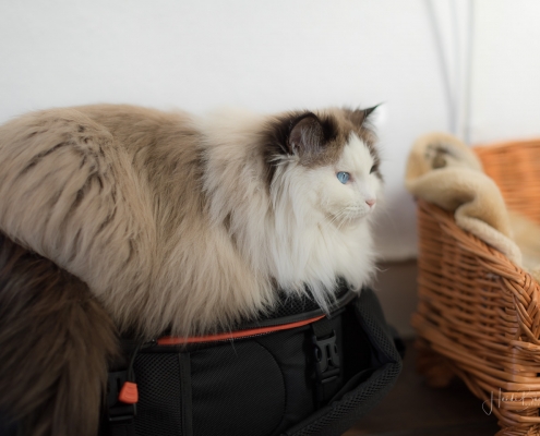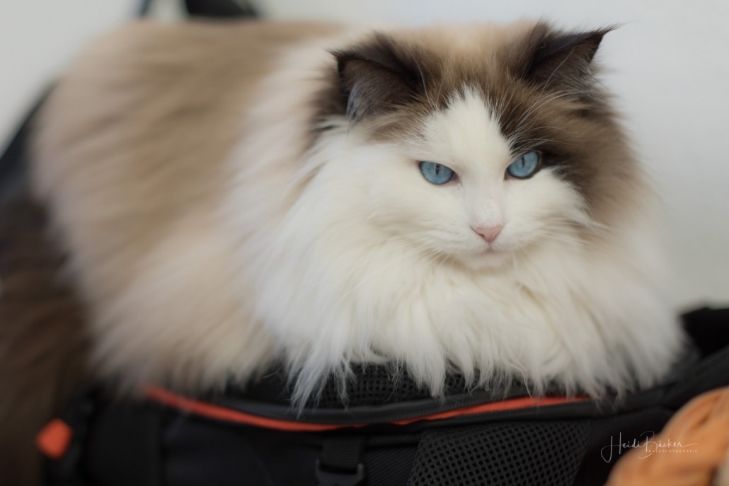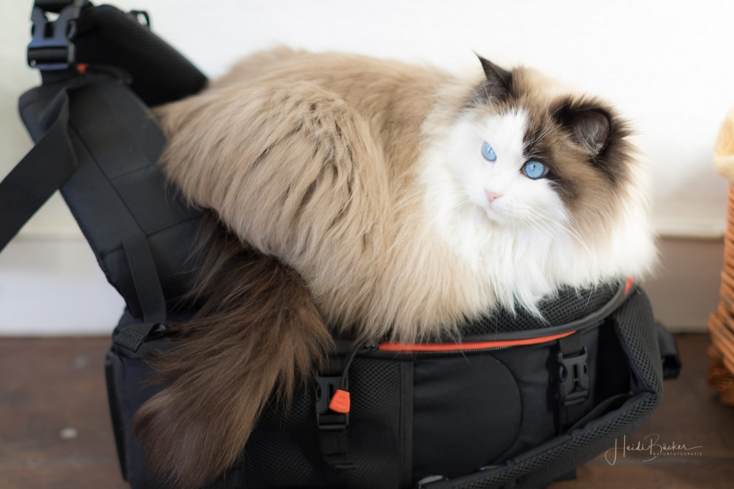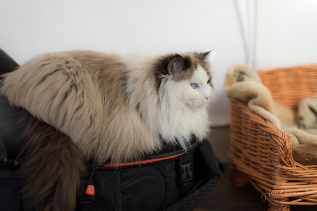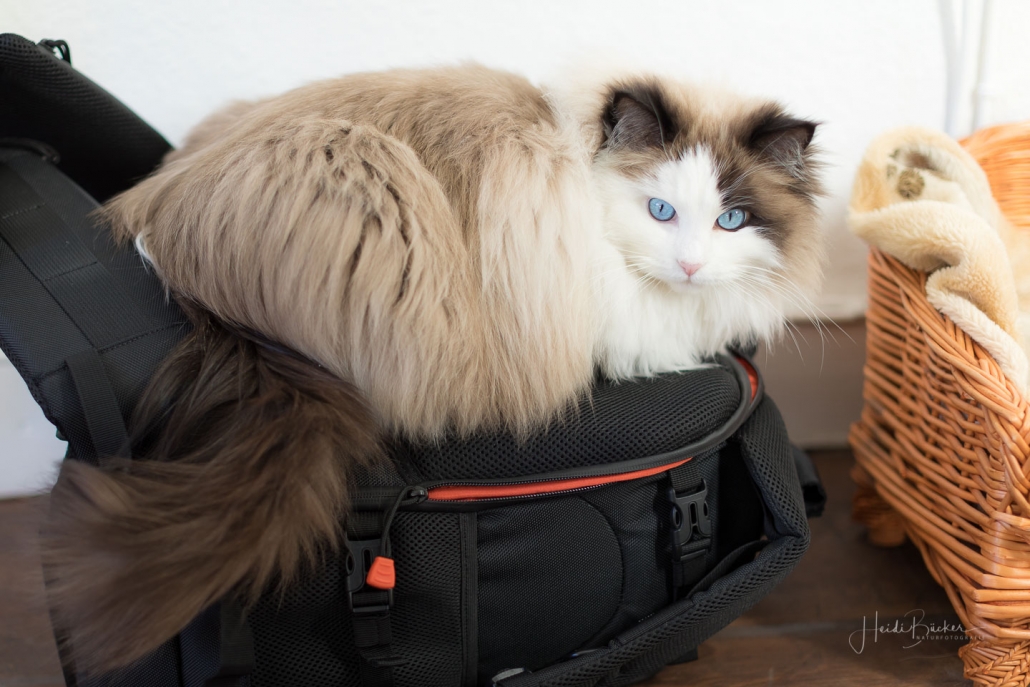 Es ist noch nicht lange her, da habe ich hier von einem Fototermin berichtet, bei dem mich die Katze des Hauses nicht aus den Augen ließ und dabei Interesse an meinem Foto-Equipment zeigte. Vor einigen Tagen hatte ich wieder das Vergnügen mit einem Hauskätzchen namens Anni. Sie machte es sich sofort auf meinem Fotorucksack bequem, dessen Rückenteil weich gepolstert ist, obwohl ihr Körbchen direkt daneben stand. Und wie sie mich dann so treu anschaute, hätte ich sie glatt in den Rucksack packen und mit nach Hause nehmen können … ich habe noch nie eine Katze mit so schönen blauen Augen gesehen.