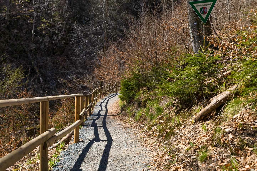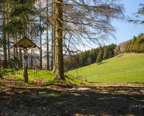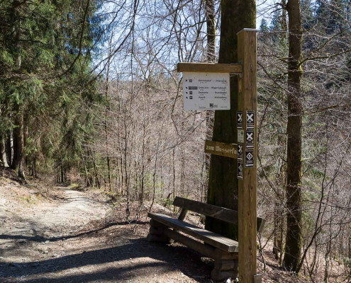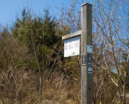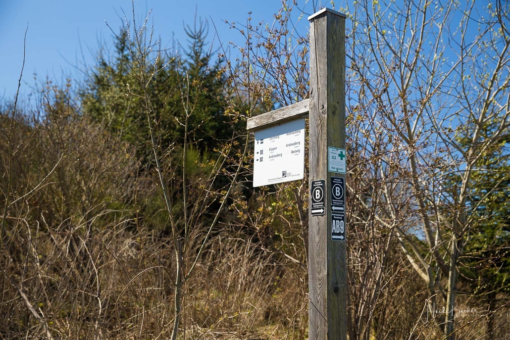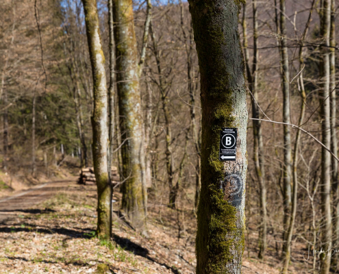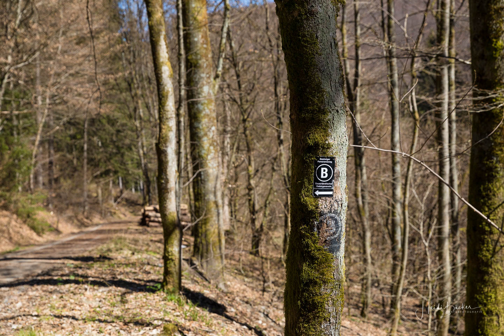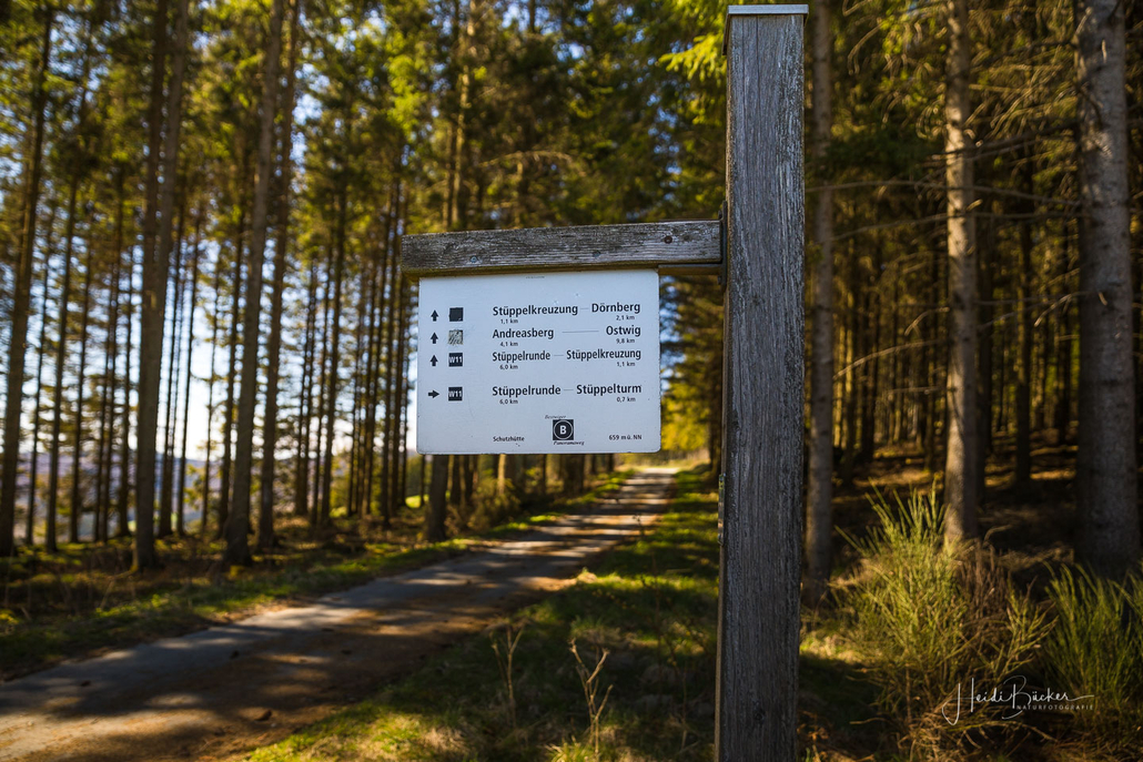 Wir starteten am Ortsausgang von Bestwig-Andreasberg in Richtung Wasserfall und fuhren zuerst ein Stück über die Straße. Direkt hinter einem Parkplatz, der am rechten Straßenrand liegt, bogen wir nach rechts in einen Wirtschaftsweg ab und folgten diesem eine ganze Weile stets bergauf. Der eigentliche Wanderweg führt teils über steile Pfade direkt auf den Stüppel, die wir mit dem Rad umfahren mussten. Die Wegmarkierung ist ein eingekreistes weißes B auf schwarzem Grund und so angebracht, dass die Pfade auch umwandert, bzw. umfahren werden können. Zusätzlich sind wir die ausgewählte MTB-Tour nach Navi gefahren, was in diesem Fall sehr hilfreich war.