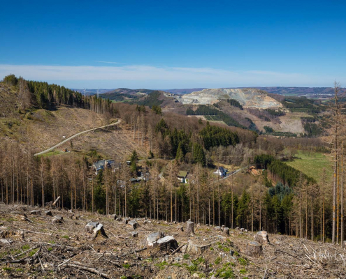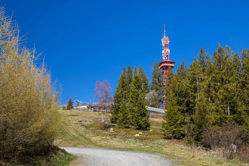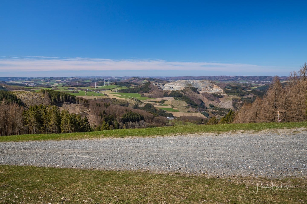 So ging es auf Zick-Zack-Wegen den Stüppel hinauf. Immer wieder erhielten wir tolle Aussichten auf die Umgebung. Auch den Diabas-Steinbruch Halbeswig, den ich vor ein paar Jahren für einen WOLL-Bericht schon von Innen kennenlernen durfte, konnte man von dieser Seite richtig gut sehen, was ich sehr imposant fand …und überhaupt: Die erste Strecke gefiel mir wirklich gut und ich war zu diesem Zeitpunkt sehr euphorisch und freute mich auf das, was da noch kommen sollte. Der Weg hinauf zum Stüppel war schon recht steil und anstrengend, um so mehr die Vorfreude auf den Turm, der einer der höchsten Aussichtstürme im Sauerland ist und von dessen Plattform man eine grandiose Aussicht haben soll. Der Turm selbst befindet sich auf dem Gelände des Freizeitparks FORT FUN und kann nur in den Öffnungszeiten betreten werden, doch laut Aussagen einiger Wanderer und Mountainbiker, die ich im Internet gefunden habe, kann man ihn auch über den Panoramaweg direkt erreichen …Satz mit X: das war wohl nix!