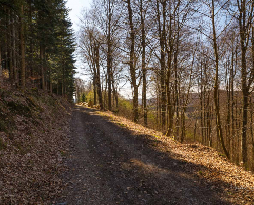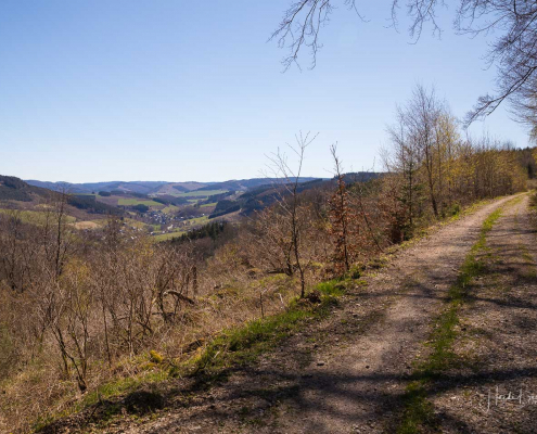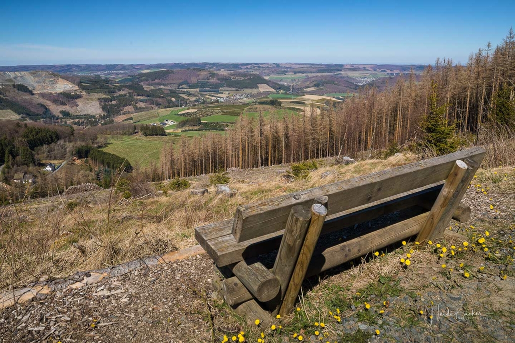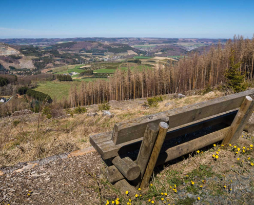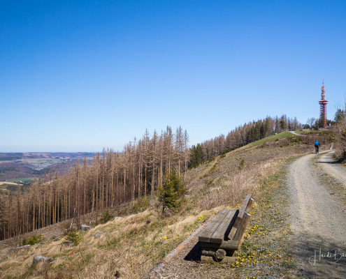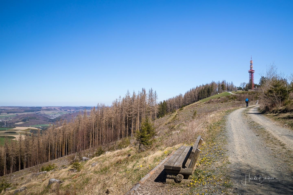 Die Markierung des Bestwiger Panoramerwegs führte uns dann von der Plästerlegge weiter …mitten in den Wald … ENDE. Da war nix mit „drumherum fahren“ oder „andere Strecke fahren“. Ursprünglich sind wir ja der Mountainbike-Route gefolgt, aber irgendwie passte da so einiges nicht. Keine Ahnung! Ein Trampelpfad quer durch den Buchenwald führte uns auf einen darüber liegenden Wald- und Wirtschaftsweg, der wiederum weiter sehr steil bergauf in Richtung Heinrichsdorf führte. Da verlies mich dann irgendwann die Lust. Teils schlechte Wege (nicht nur wegen der Borkenkäferarbeiten) und komische Wegführung! Und so ging es dann auch weiter. Im Großen und Ganzen sehr anstrengend, teils unwegsames Gelände, wenige Einkehrmöglichkeiten und auch sonst nix. Mit dem Fahrrad nicht zu empfehlen und um ehrlich zu sein: Wandern möchte ich die Strecke auch nicht. Ich denke, da gibt es schönere Kurzstrecken, wie zum Beispiel den Bergbauwanderweg in Ramsbeck (10km).