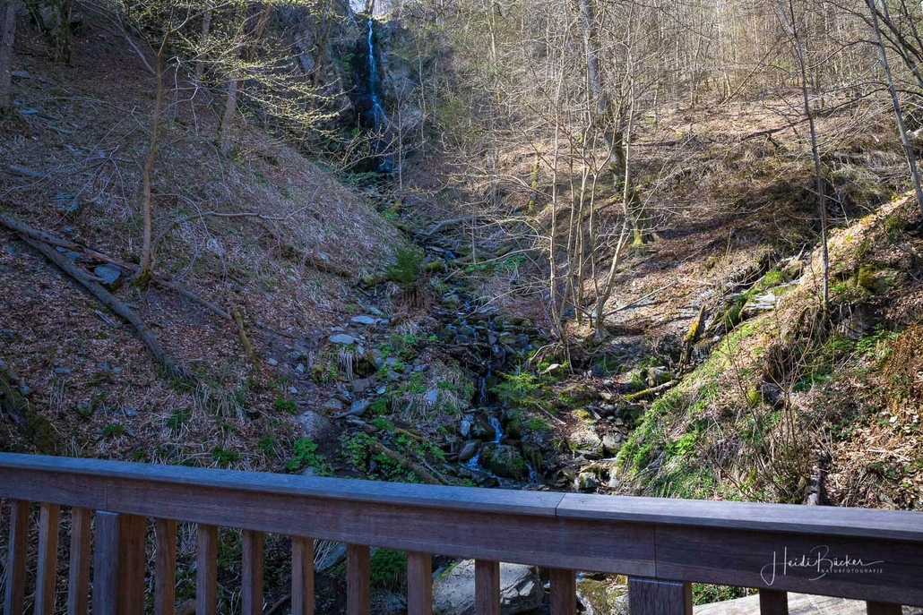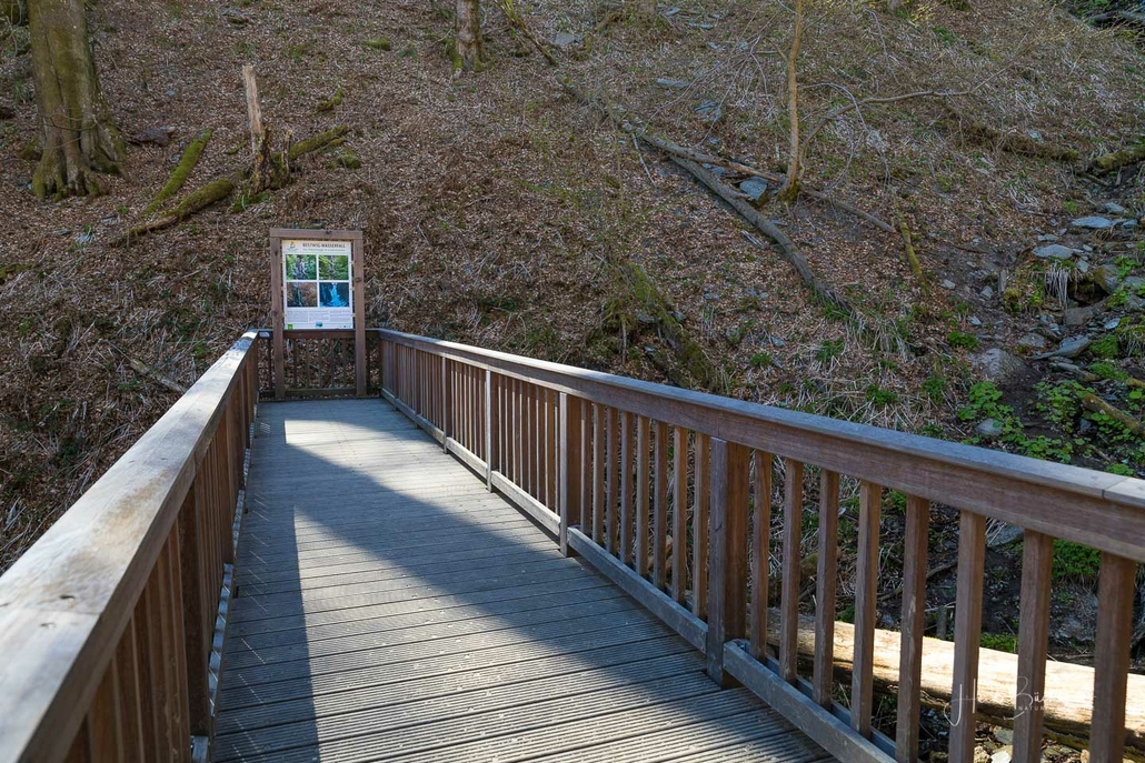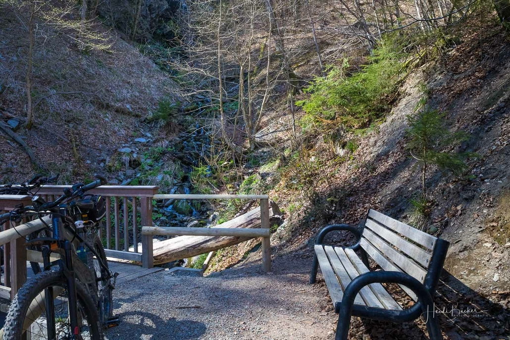 Vom Stüppel führte unsere Radtour hinunter – am FORT FUN vorbei – in das kleine Dörfchen Wasserfall. Dort herrschte reger Wanderbetrieb. Viele Familien mit Kind und Kegel und Hund und Kinderwagen und Oma und Opa etc. …waren unterwegs zu einem Hotspot! Denn in Wasserfall befindet sich ein Wasserfall, auch Plästerlegge genannt – der einzige natürliche Wasserfall in NRW – und dieser wurde im letzten Jahr touristisch aufgewertet und dementsprechend beworben. Aufgrund der Borkenkäferplage und den damit verbundenen Holzfällerarbeiten sind die Wege allerdings so kaputt gefahren, dass Eltern ihren Kinderwagen nur tragen konnten, obwohl der Wagen schon eine sportliche Ausstattung hatte. Und auch anderen Wanderern stand nicht gerade die Begeisterung im Gesicht geschrieben. Jetzt könnte man ja überlegen: „Warum gehen die denn überhaupt los?“ Aber oft ist es ja so, dass, wenn man schon extra für so eine Touristen-Attraktion – die ja als Highlight stark beworben wird – angereist ist, man auch was sehen möchte und denkt: „Irgendwie wird´s schon funktionieren“. ツ Schließlich weiß auch jeder, dass unsere Wälder und die Wege zur Zeit durch die Waldarbeiten sehr stark in Mitleidenschaft gezogen sind und akzeptiert es so, wie es ist, denn die Waldbesitzer haben momentan andere Sorgen, als die Wanderwege wieder schön herzurichten. Und die Arbeiten sind auch lange noch nicht abgeschlossen. Allerdings ist momentan in Wasserfall der Weg zur Plästerlegge soooo schlecht, dass es echt keinen Spaß macht. Wir hatten Glück, dass es zumindest noch trocken war.