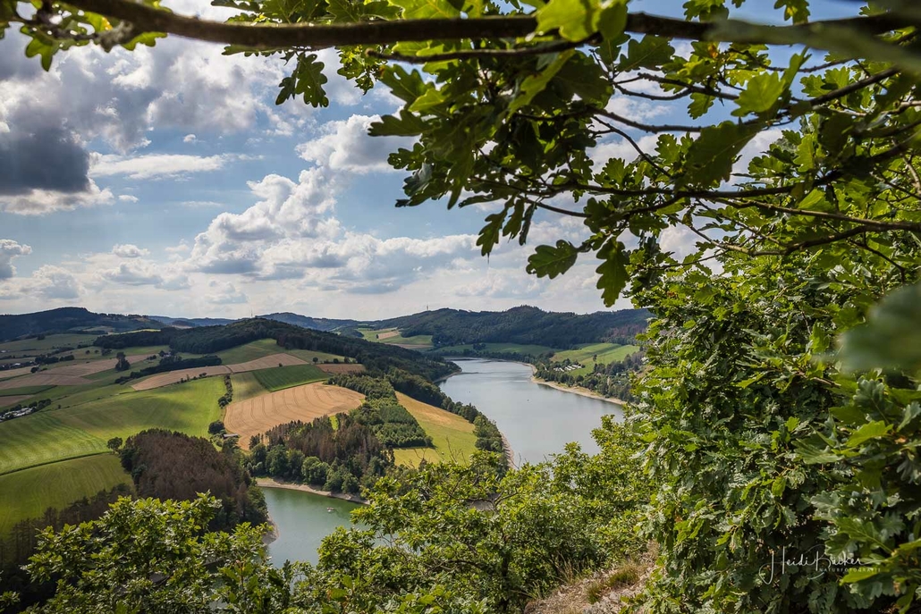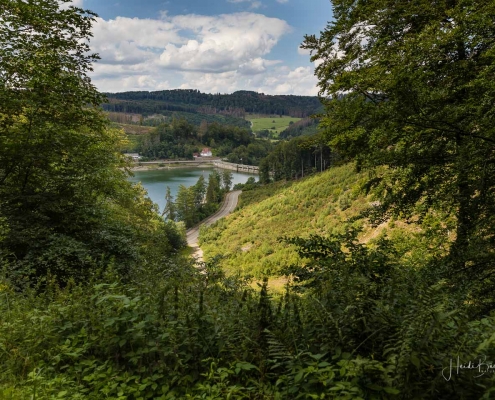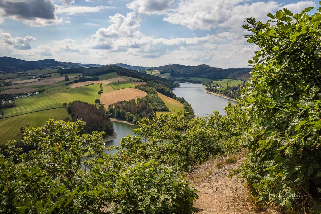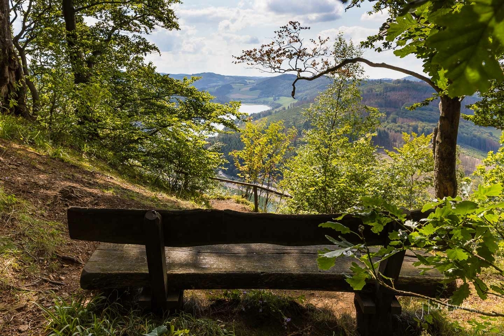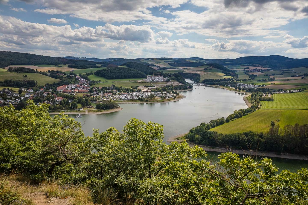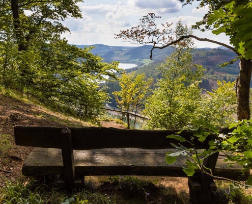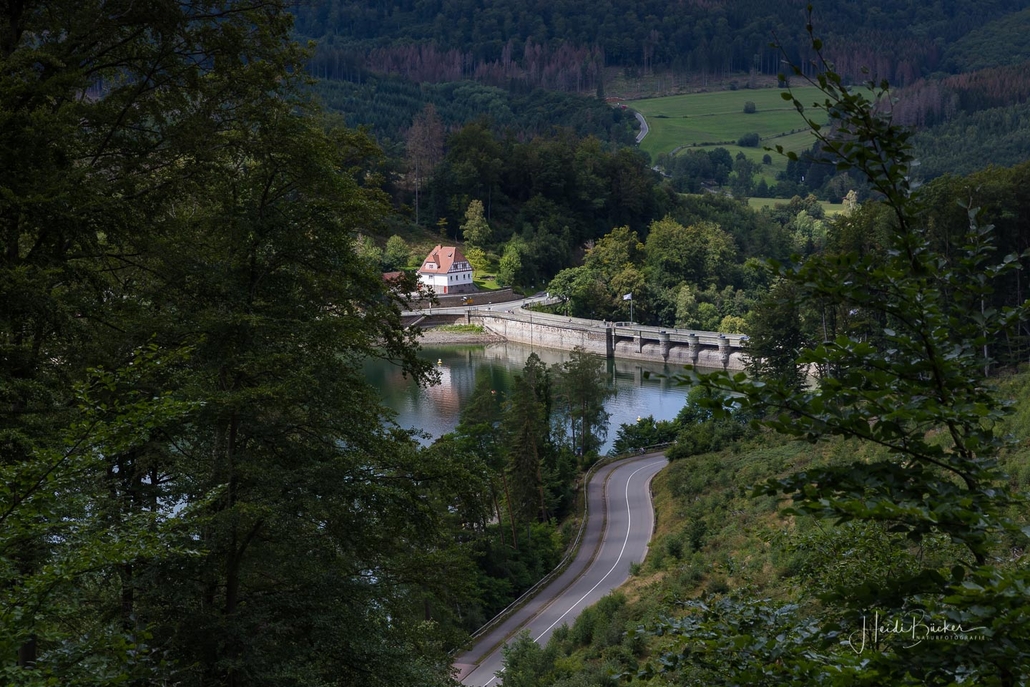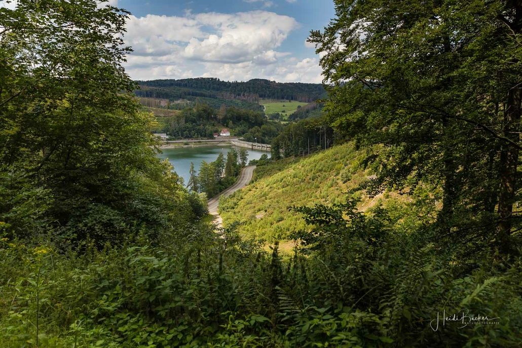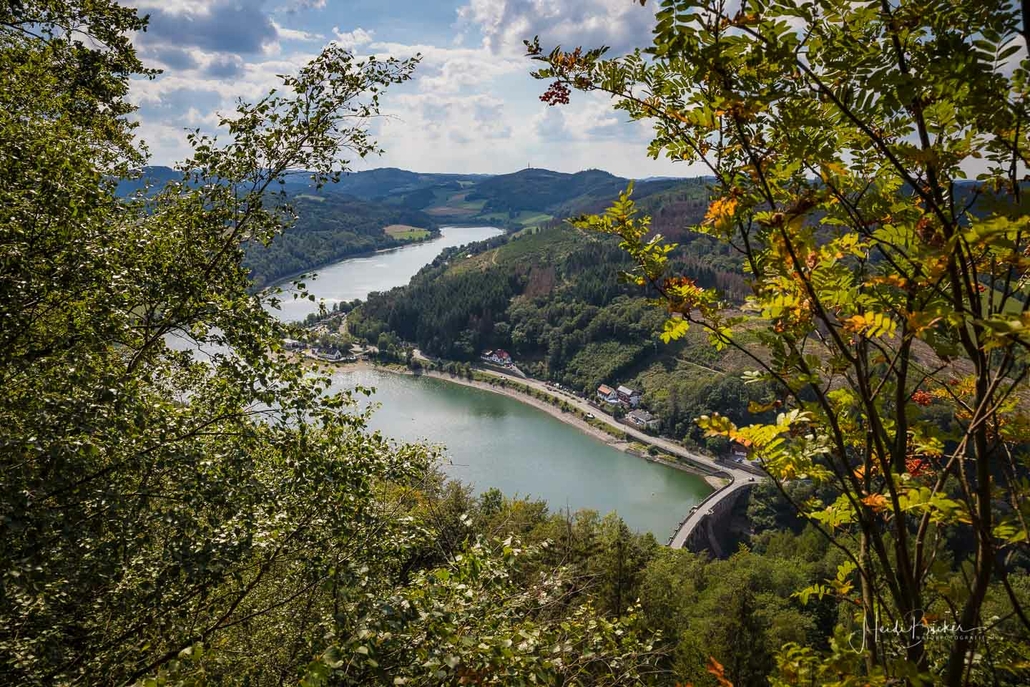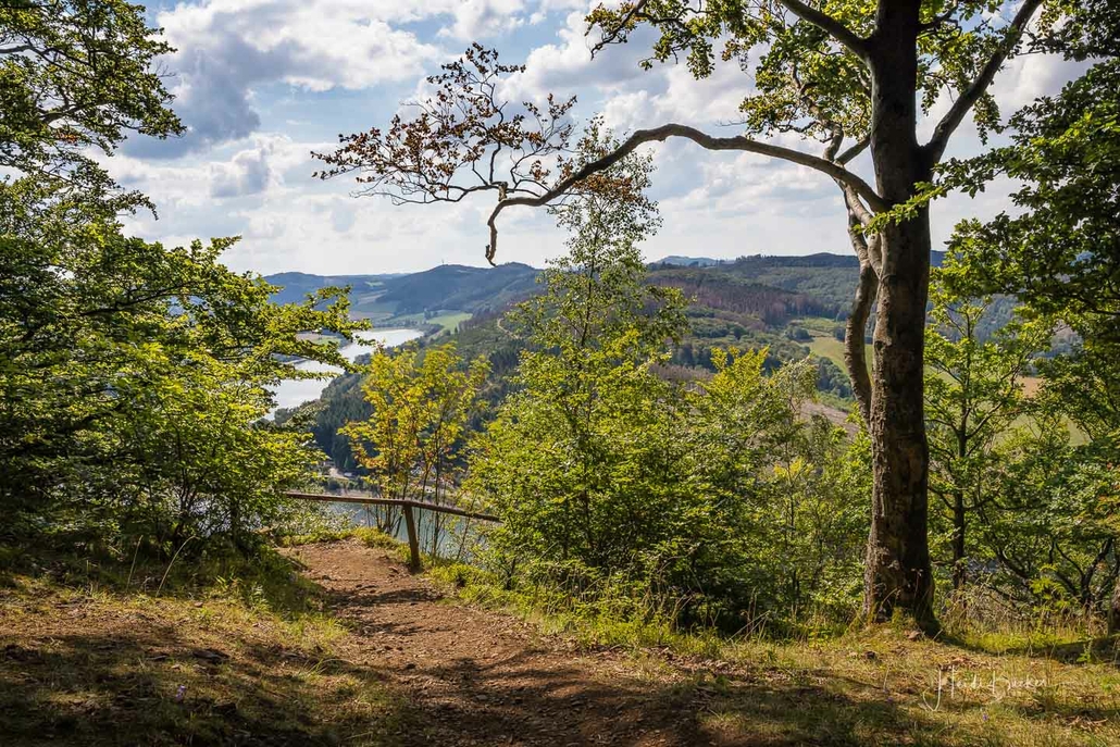 Anschließend ging es vom St. Muffert weiter zum Gipfel des Eisenbergs, der höchsten Erhebung der Stadt Marsberg. Dieser Punkt liegt, umgeben von hohen Buchen, an einem schattigen Plätzchen mitten im Wald. Nur ein kurzes Stück weiter, befindet sich ein weiterer toller Aussichtspunkt mit Blick auf den See und die Staumauer. Nach einer kurzen Pause ging es von hier über einen urigen Waldweg wieder hinunter ins Tal in Richtung Heringhausen. Ab Heringhausen fuhren wir wieder direkt am See entlang bis zur Stormbrucher Brücke und Endstation unserer Tour.