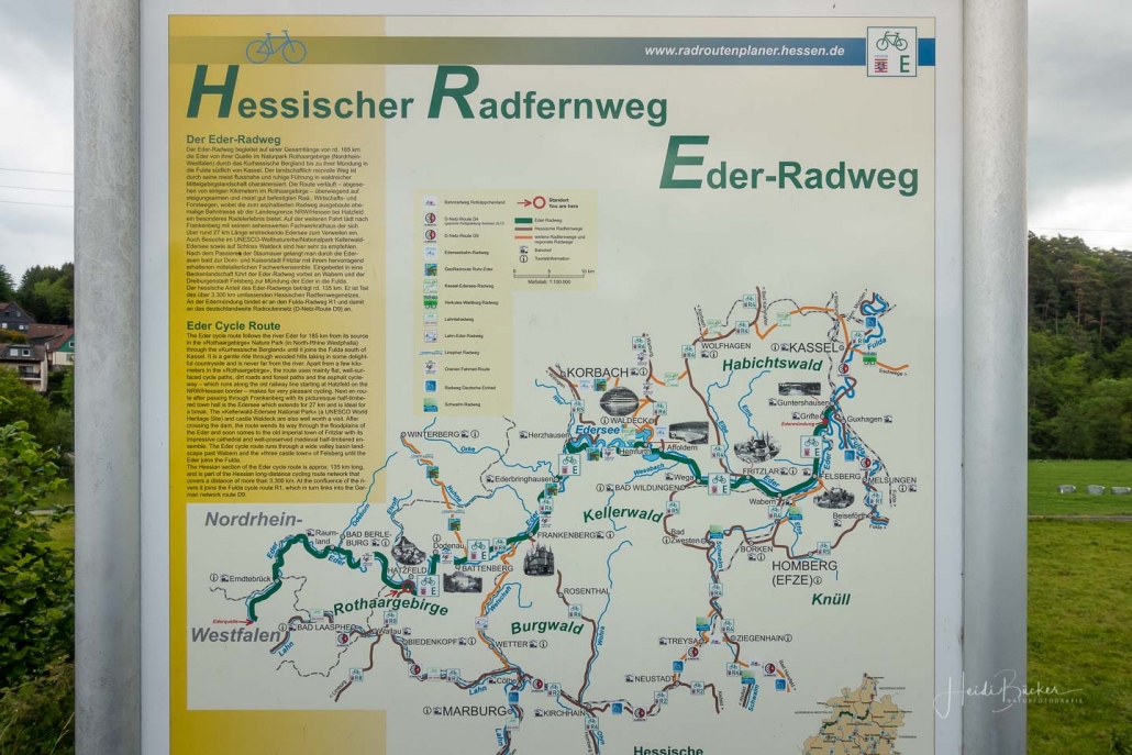 Der Eder-Radweg (auch Ederauen-Radweg genannt) begleitet die Eder auf ihrem wunderschönen Weg von Erndtebrück im Naturpark Rothaargebirge, durch das Waldecker Land und den Schwalm-Eder-Kreis bis zur Mündung in die Fulda. Die Route verläuft über ruhige Rad- und Wirtschaftswege durch eine sehr reizvolle Landschaft. Unsere Tour startete in Raumland am Wanderparkplatz in der Nähe des Schieferschaubergwerks Grube Delle. Die Route führte durch die Orte Arfeld, Schwarzenau, Bettelhausen, Hatzfeld, Reddinghausen, Battenfeld und Battenberg. Von Battenberg ging es wieder zurück nach Raumland …und weil es so schön war, werden wir bei Gelegenheit die Radtour von Battenberg fortführen. Der Radweg hat eine Gesamtlänge von 171 Kilometern und ist sehr empfehlenswert!