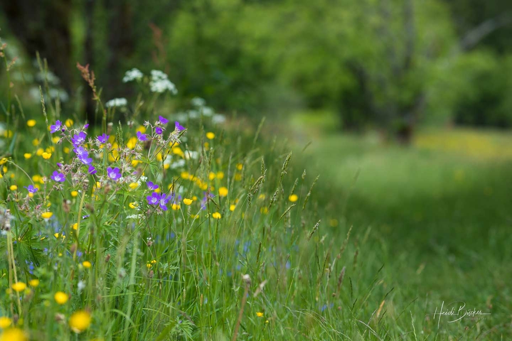 Während wir dem eingeschlagenen Weg folgen, schauen wir immer wieder in das offene Tal und dazwischen liegen Pferdeweiden und die prächtigen Bergwiesen. Der leuchtend violett blühende Waldstorchenschnabel fällt dabei direkt ins Auge. Bei genauerem Hinschauen erblicken wir auch Arnika, Teufelsgralle, Pippau, Schlangenknöterich, Wiesenkerbel, Goldhafer und vieles mehr. Im Gras zirpen Heuschrecken und verschiedene Schmetterlinge und andere Insekten schwirren an uns vorbei.