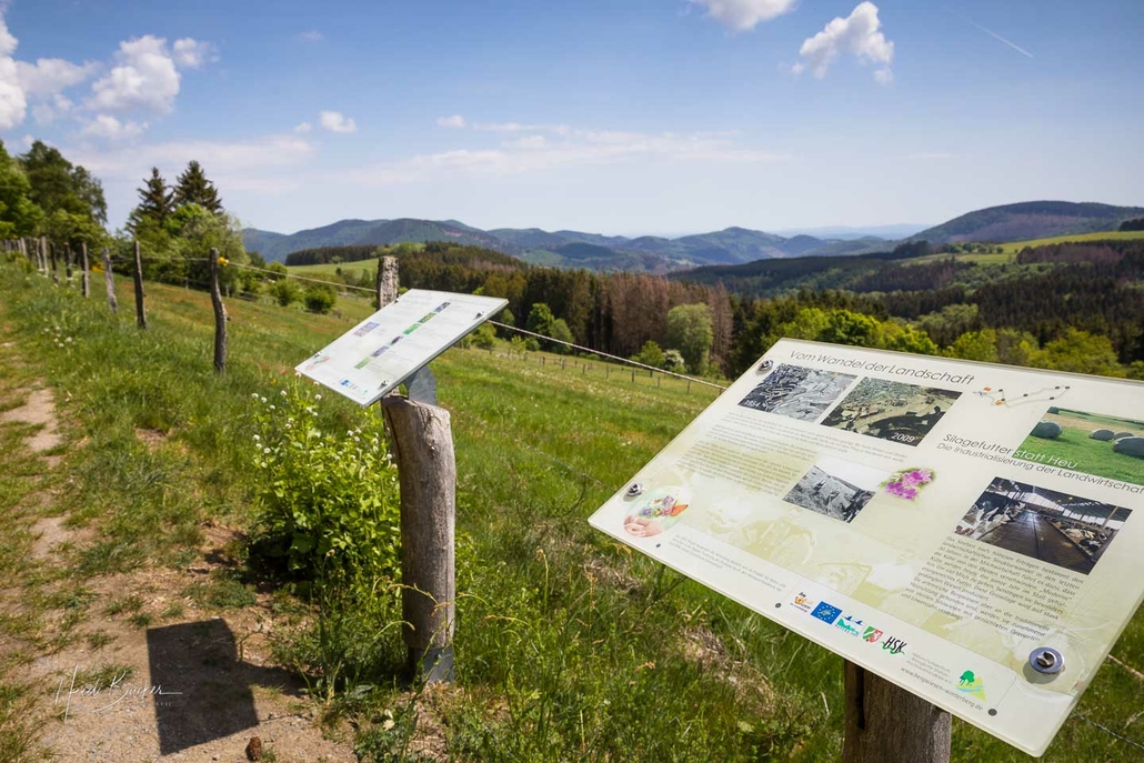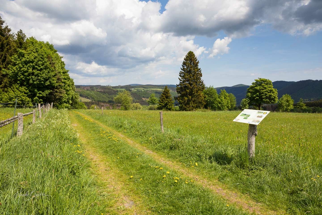 Der Einstieg befindet sich „Am Rad“ in Winterberg, nahe des Fernsehturms und der Kreuzbergkapelle. Bevor wir unseren leichten Wanderspaziergang starten, werfen wir kurz einen Blick auf die Informationstafel, die direkt neben dem Parkplatz steht. Hier erfahren wir vorab einiges über die Pflanzenvielfalt und den Erhalt der Wiesen und Weiden auf der Winterberger Hochfläche.