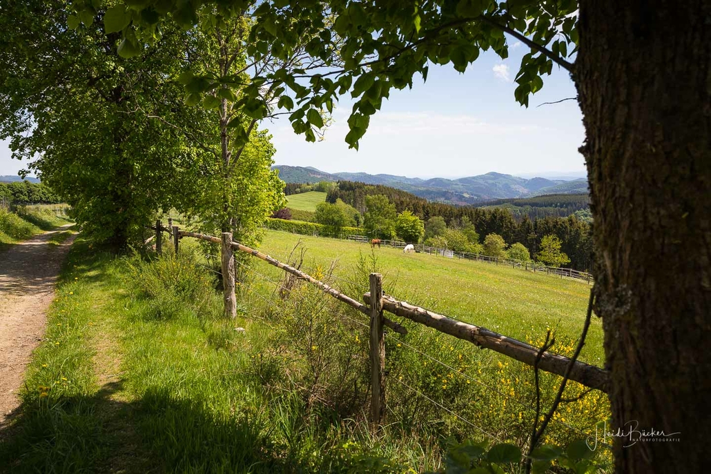 Vor lauter Freude an der Natur, dürfen wir natürlich nicht die Wegmarkierung aus den Augen verlieren. Es geht im leichten Zick-Zack-Kurs über weiche Wiesenwege, begleitet von Blicken auf die Stadt und in das idyllische Orketal mit dem kleinen Dörfchen Elkeringhausen. Am Wegesrand stehen in kurzen Abständen Sitzbänke. Auf einer von ihnen nehmen wir für einen Moment Platz und genießen die Ruhe und erholsame Atmosphäre.