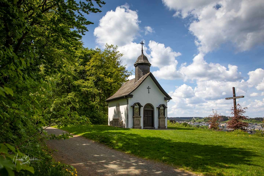 Nach ca. einer Stunde Gehzeit und vielen schönen Eindrücken erreichen wir wieder unseren Ausgangspunkt. Doch kurz vorher kommen wir noch an der Winterberger Kreuzbergkapelle vorbei. Von hier hat man nochmal eine tolle Aussicht über die Stadt.