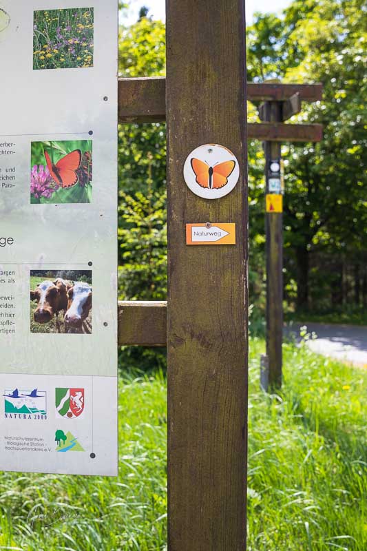 Ein leuchtend orangener Schmetterling auf weißem Grund weist uns den Weg. Als Vorlage für diese schöne Wegmarkierung diente wohl der Dukatenfalter, der hier das Goldstück unter der vibrierenden Artenvielfalt ist.