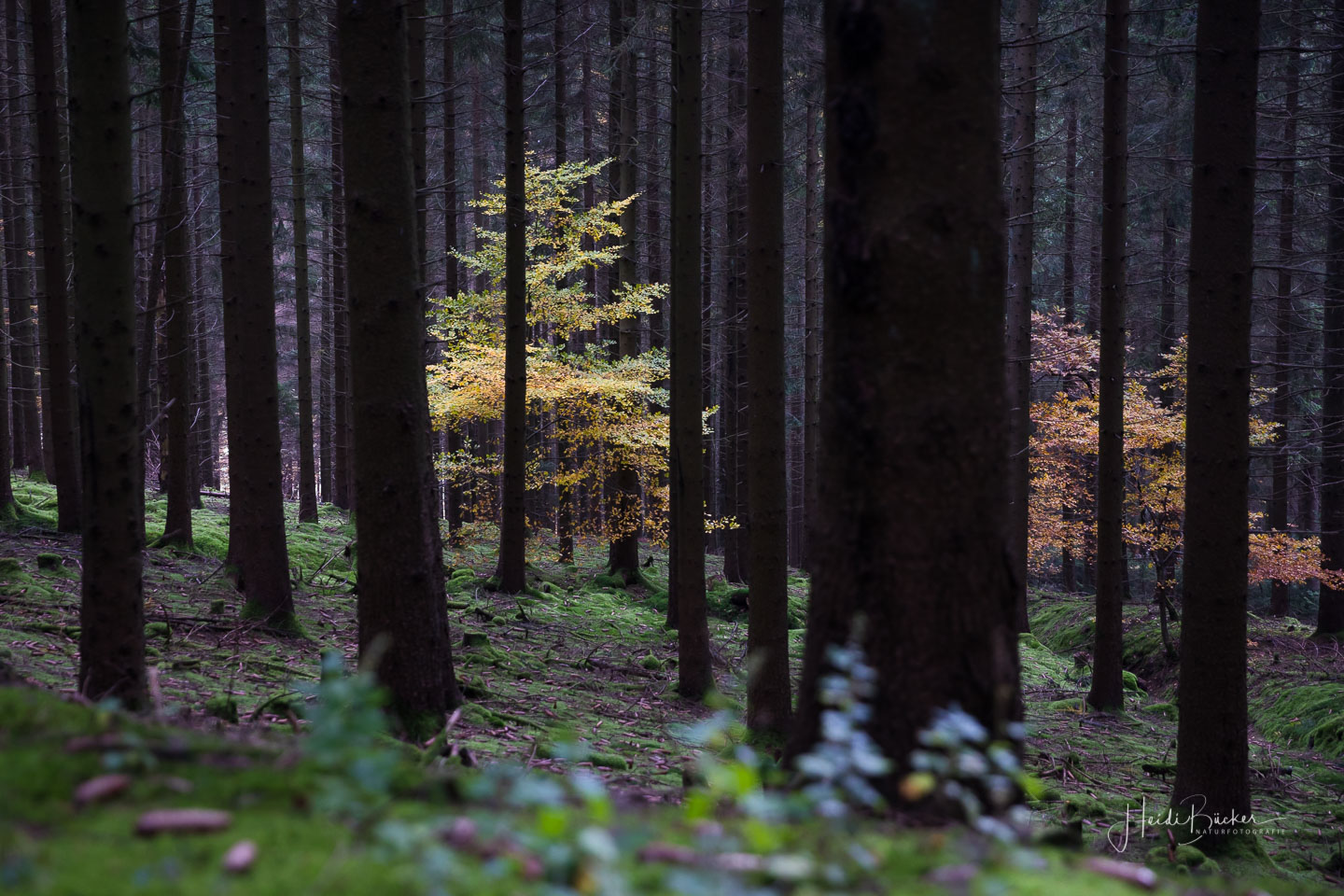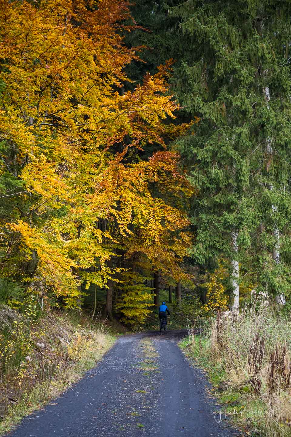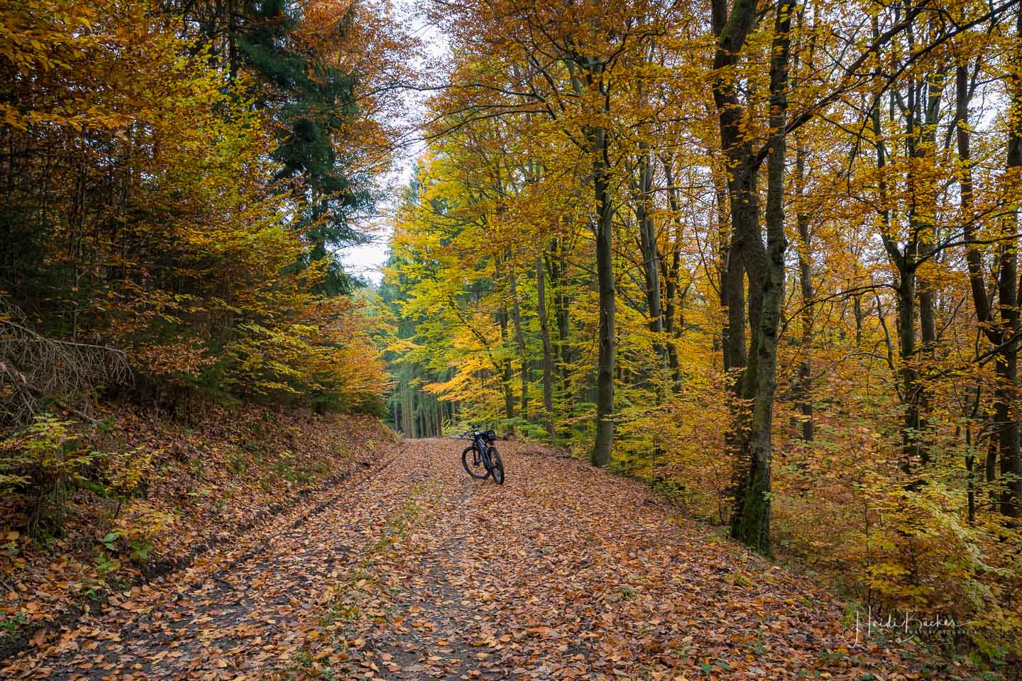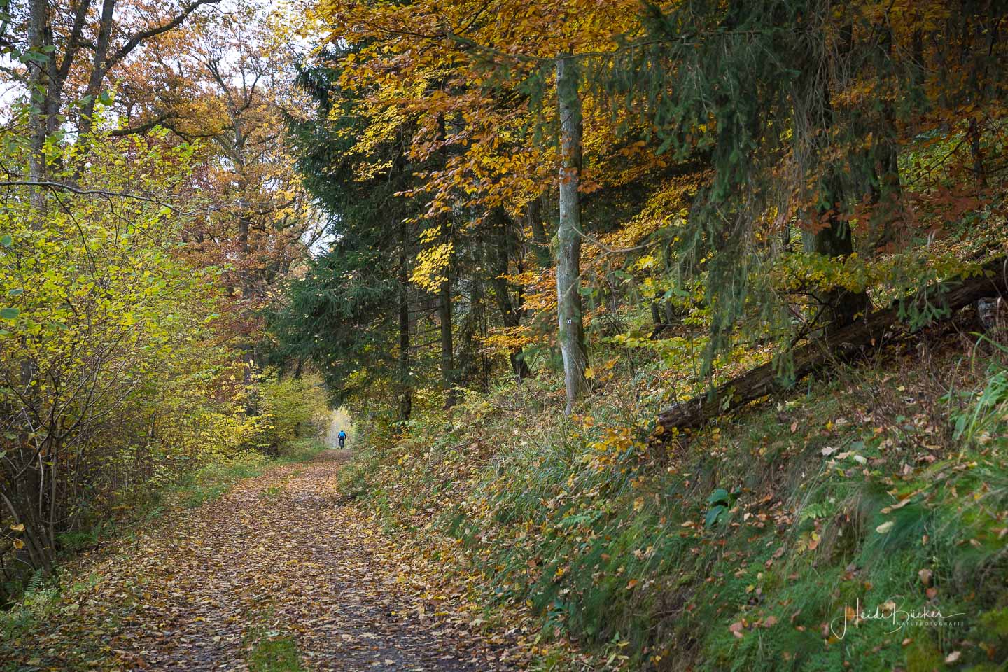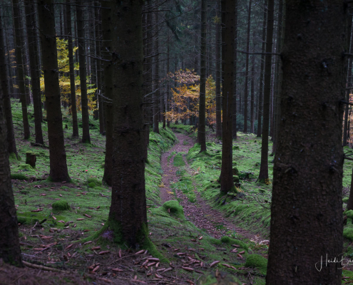 Für das nachfolgende Foto bin ich allerdings freiwillig vom Rad abgestiegen – da war mir der Matsch dann auch egal 🙂 Der Blick durch den dunklen Fichtenwald auf die bunt verfärbten Buchen war einfach genial.