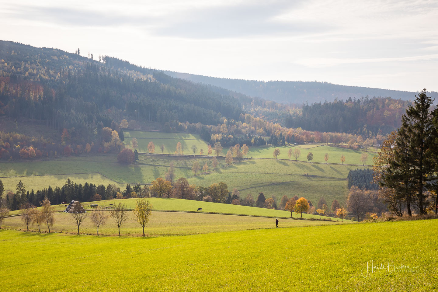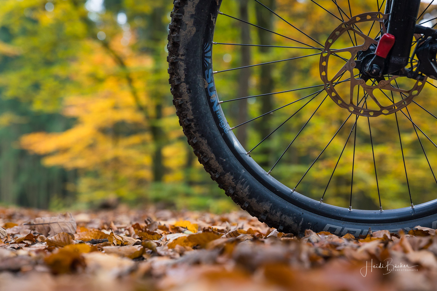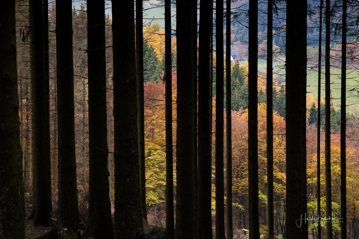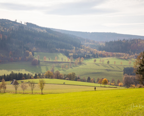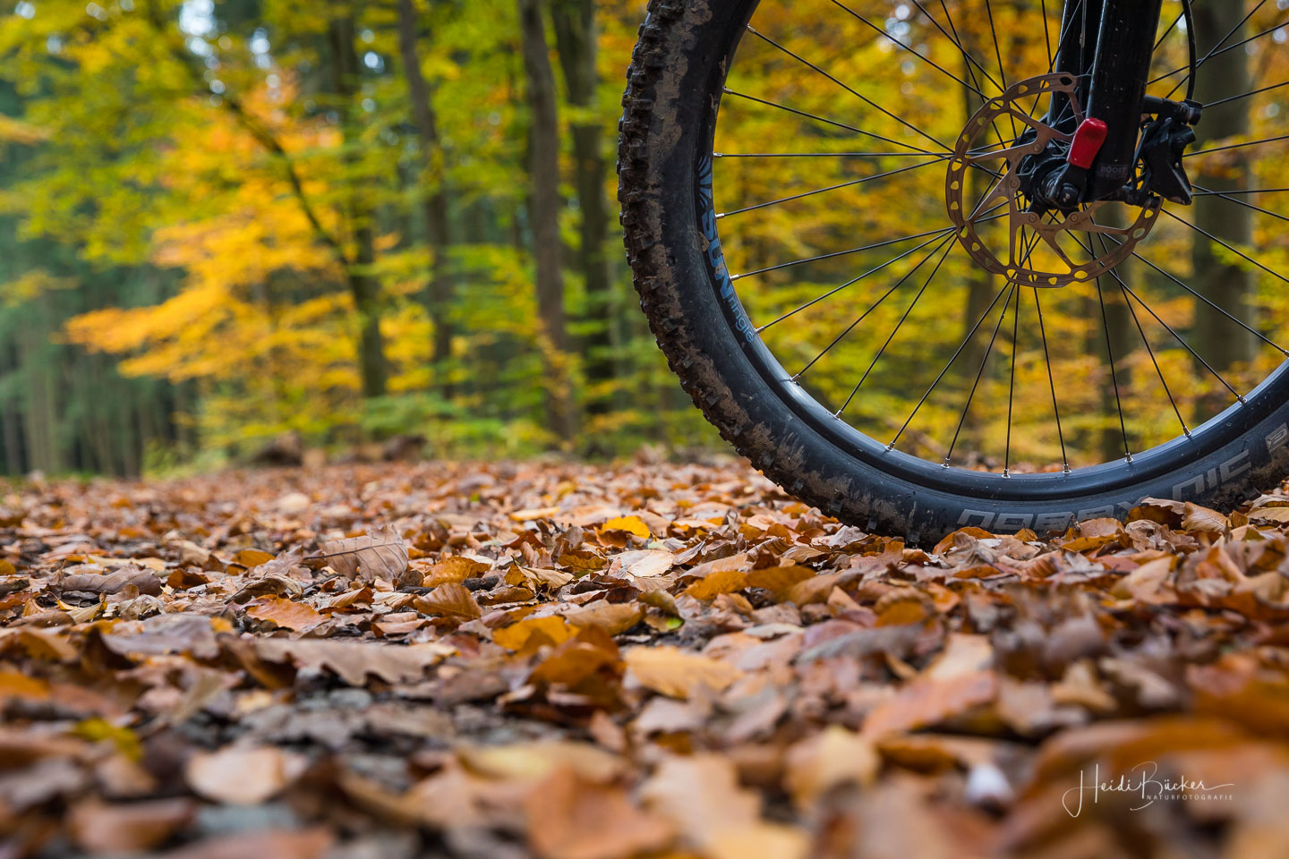 Für das nachfolgende Foto bin ich allerdings freiwillig vom Rad abgestiegen – da war mir der Matsch dann auch egal 🙂 Der Blick durch den dunklen Fichtenwald auf die bunt verfärbten Buchen war einfach genial.