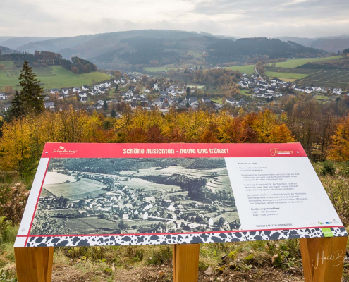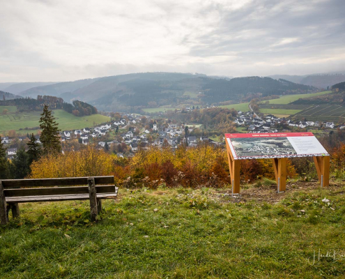 Kurz hinter dem Werper Kreuz – bevor es in den Beerenberg hineingeht – biegt rechts ein Wirtschaftsweg ab, über den man den Beerenberg umrunden kann. Das haben wir gemacht und erhielten tolle Aussichten auf die Orte Werpe, Harbecke und Fleckenberg. Am Wegende, kurz vor Fleckenberg, trafen wir dann wieder auf den Radweg, über den es zurück nach Schmallenberg ging. In Schmallenberg durchquerten wir ein zweites Mal den Lennepark, fuhren den Aberg hinauf und bogen direkt hinter dem Friedhof in den Talweg Richtung Grafschaft ein. Am Dorfende von Grafschaft folgten wir dem Waldskulpturenweg, an der Skulptur Blinker II vorbei, auf die Almert. Von der Almert radelten wir dann wieder nach Oberkirchen und über die Lenneroute zurück nach Westfeld.