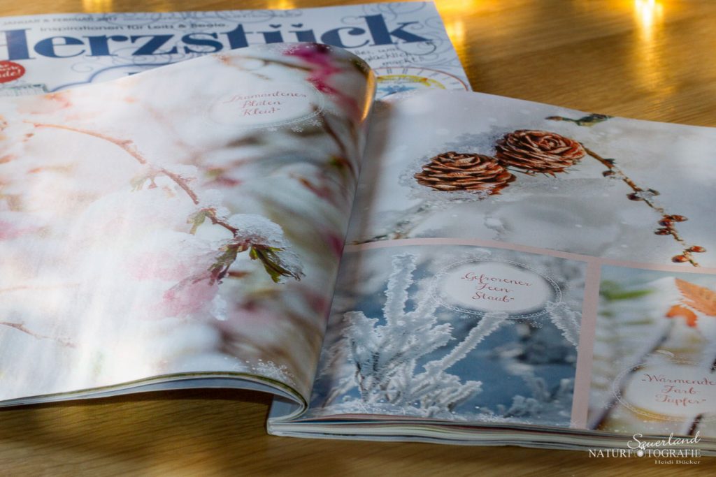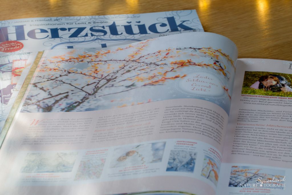 Es sind bereits einige Wochen vergangen, als die Redaktion der FUNKE Woman Group GmbH per Mail eine Bilderanfrage stellte. Sie benötigten für ihr neues Wintermagazin „HERZSTÜCK“ einige inspirierende Motive mit Eis und Schnee. Bei der Recherche im Internet waren sie auf meine Bilder aufmerksam geworden und fragten an, ob sie einige Motive zeigen und mich als Fotografin vorstellen dürften. Ich war total überrascht und mein Herz hüpfte vor Freude. Gerne habe ich zugestimmt … und nun, einige Zeit später, kann man über mich und meine Arbeit in der neuen HERZSTÜCK lesen. Die Aufmachung des Artikels ist sehr schön geworden und um ehrlich zu sein, erfüllt es mein Fotografenherz mit ein klein wenig Stolz … soviel Glück hat man nicht alle Tage.