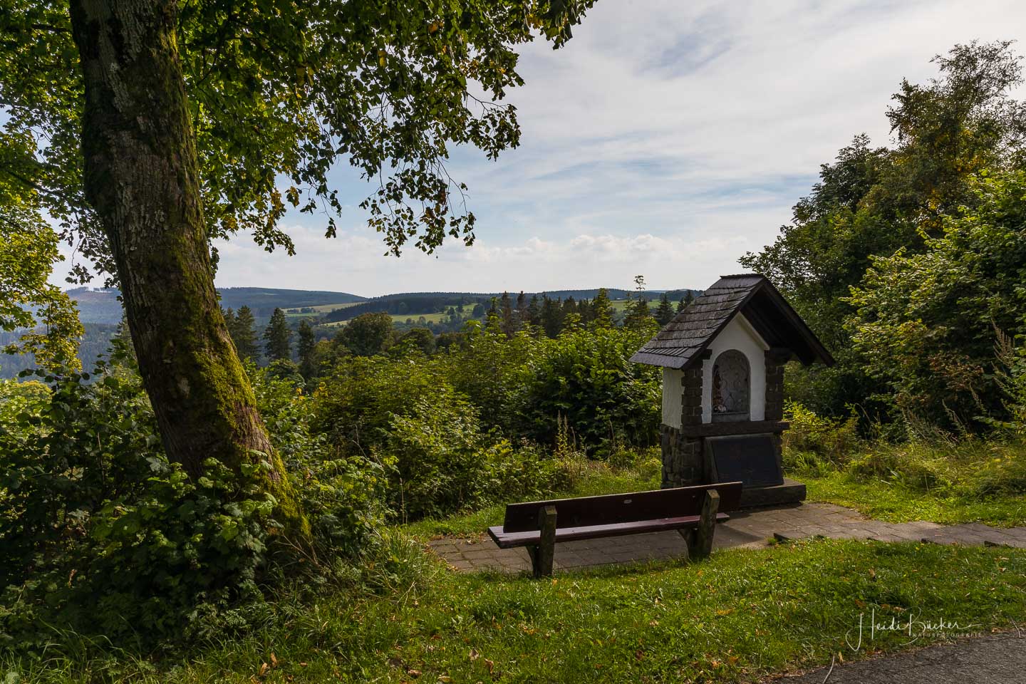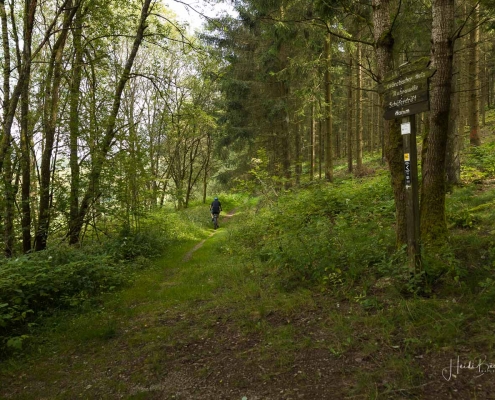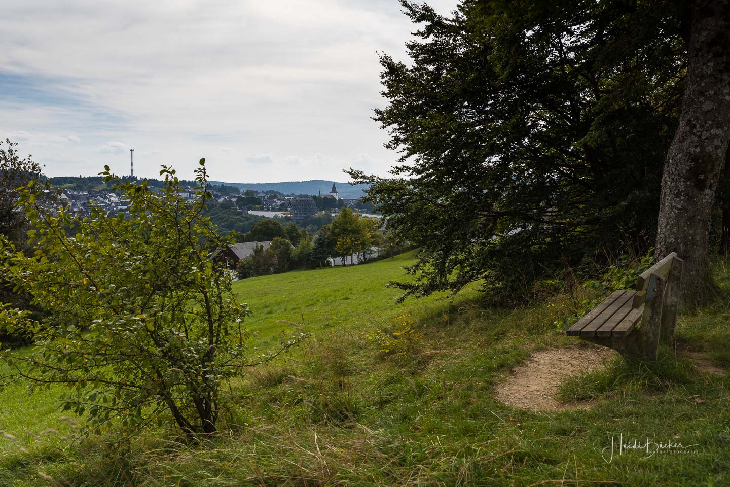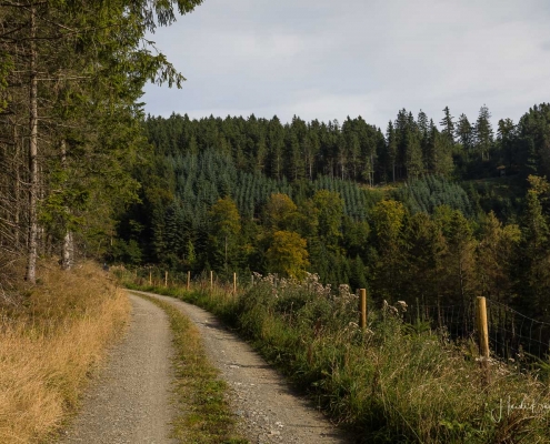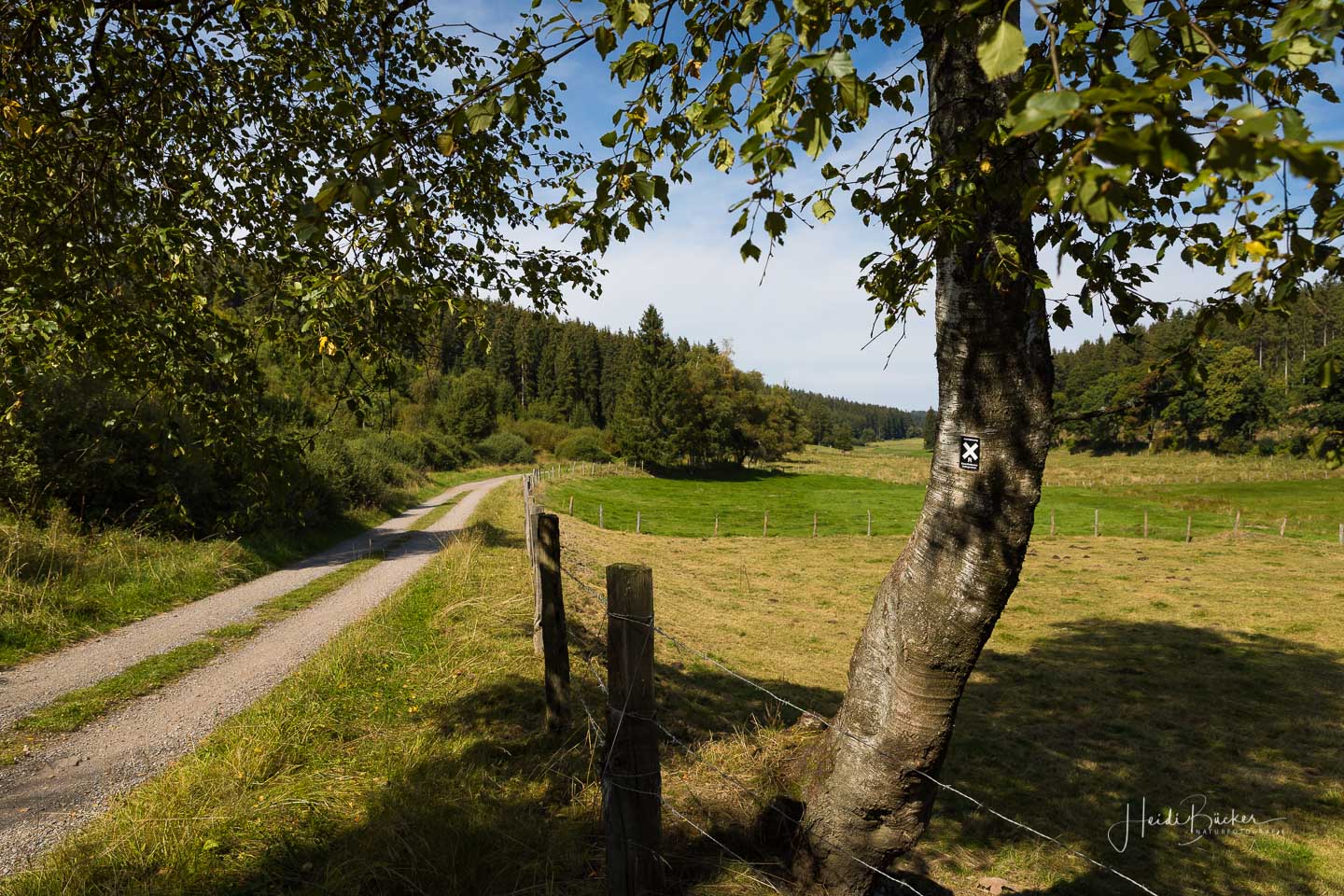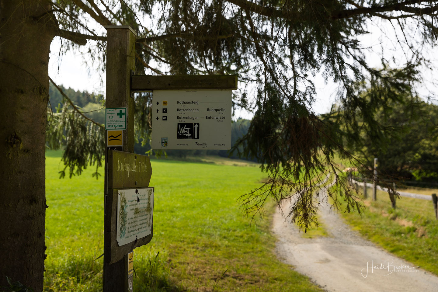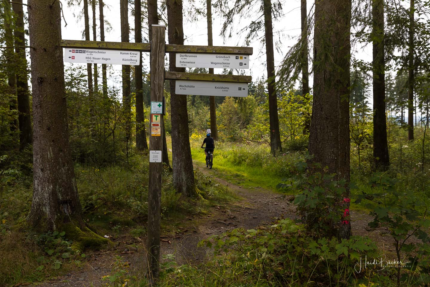 Nach einer kurzen Rast setzen wir unsere E-Bike-Tour fort. Es geht durch das Hilletal nach Grönebach – vorbei an der St. Lambertus-Kirche bis zum Dorfbrunnen in der Westernau. Ab hier folgen wir zuerst einem Rothaarsteig-Zubringerweg zum Botzenhagen. Dort treffen wir auf den Rothaarsteig und folgen diesem bis zur Ruhrquelle. Von der Ruhrquelle ist es nicht mehr weit bis zum Dumel in Winterberg. Wir radeln am Bahnhof vorbei und über den Marktplatz ( Untere Pforte ), bevor es dann – stadtauswärts – den Waltenberg in Richtung Bobbahn rauf geht. Von hier fahren wir über den Radweg zum Sahnehang und folgen dann ca. 150 Meter der L640 in Richtung Ohlenbach, bevor es in einer scharfen Rechtskurve links in einen Waldweg geht. Über diesen Weg radeln wir durch den Hohen Knochen zurück zu unserem Ausgangspunkt nach Westfeld.