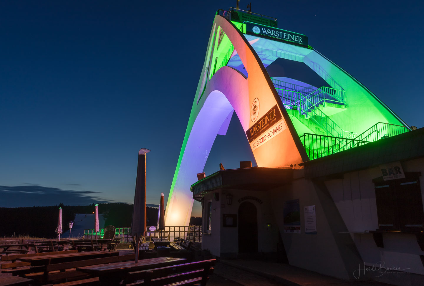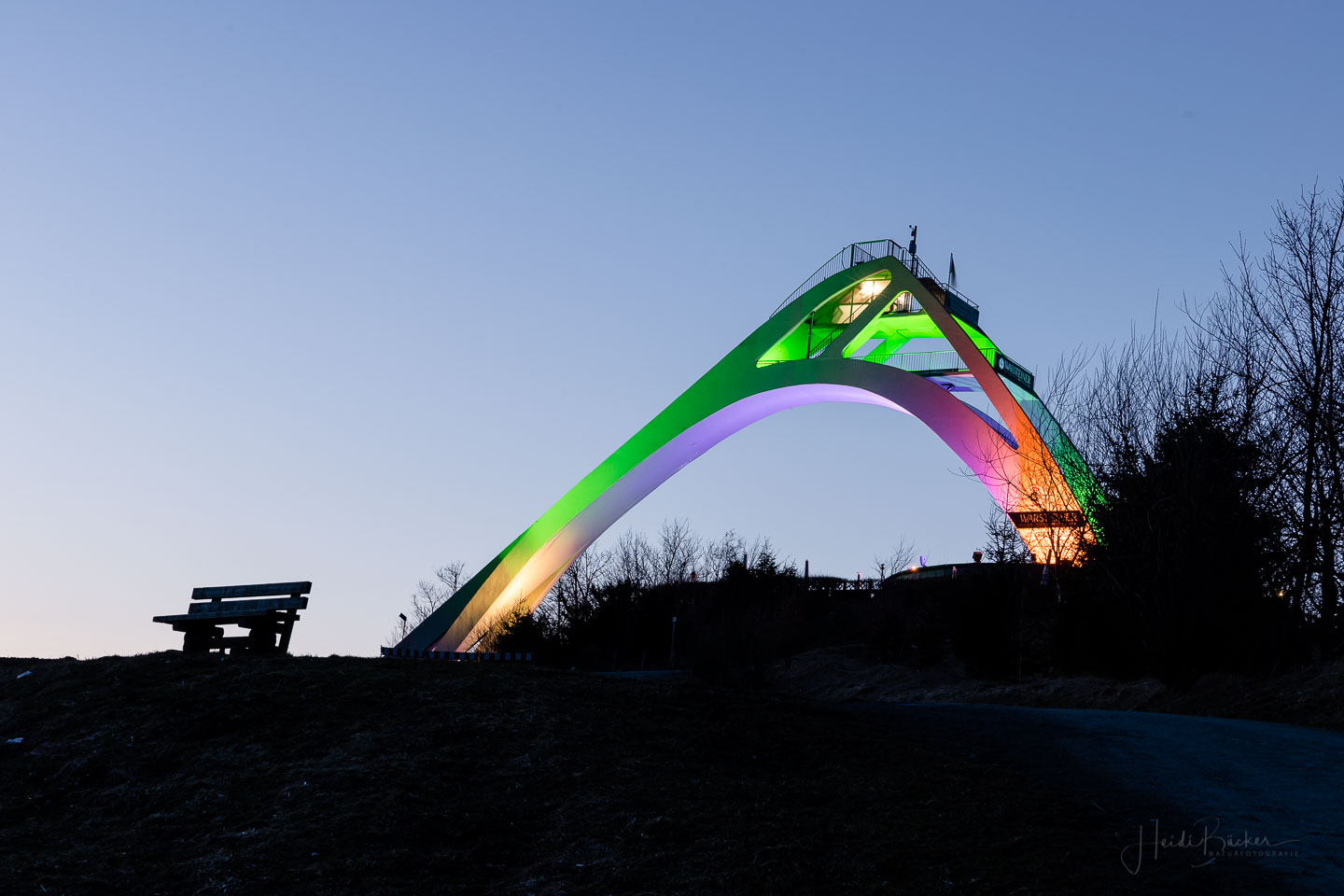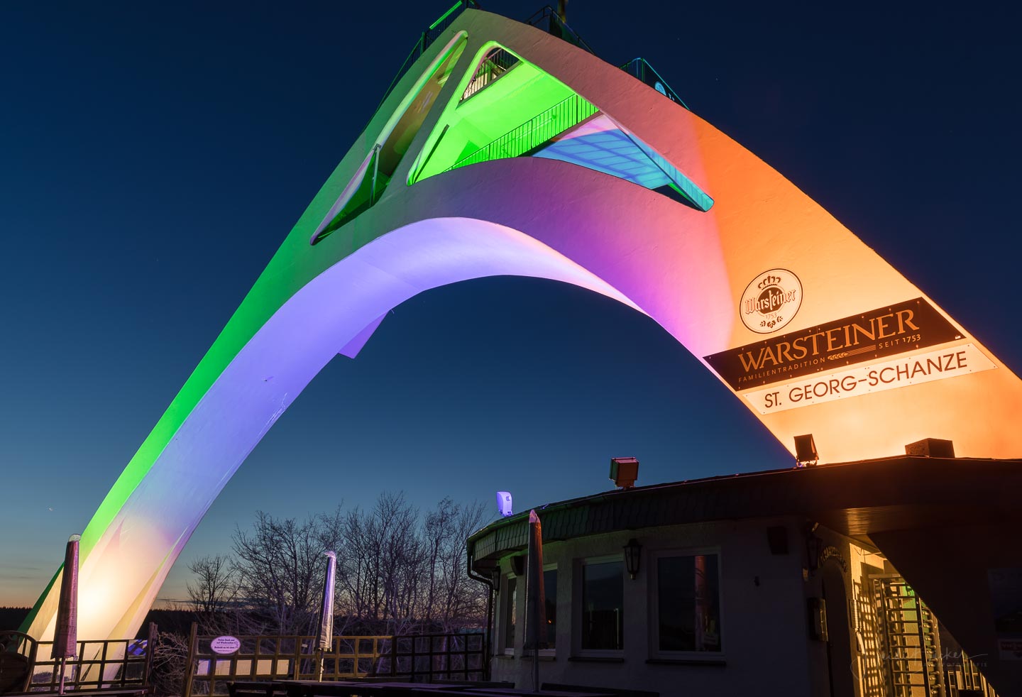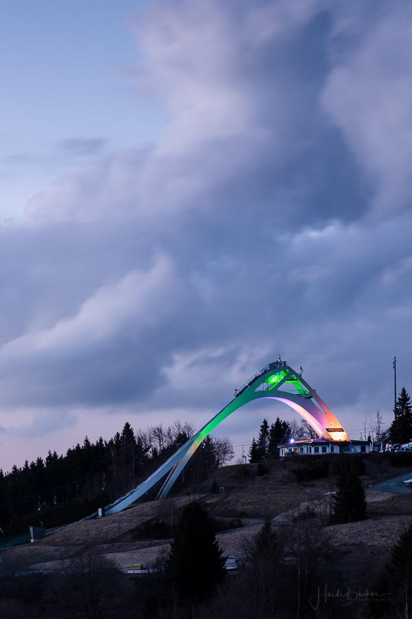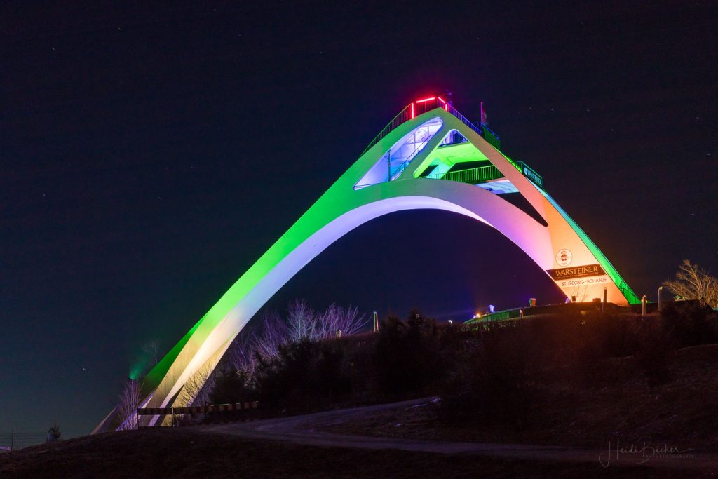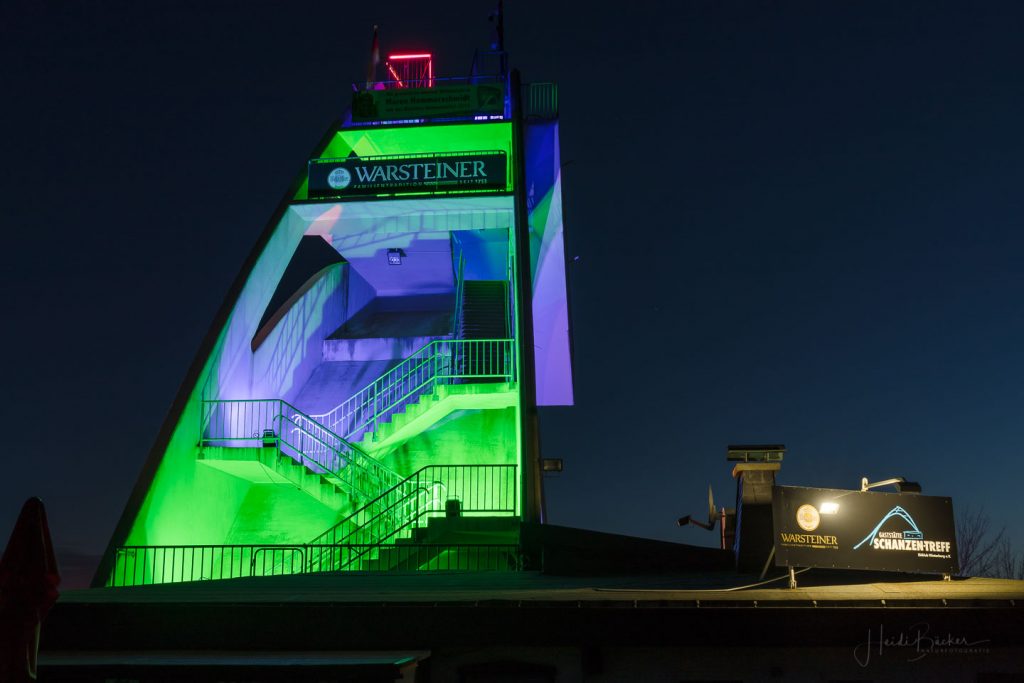 Passend zum Frühling und zur Osterzeit zeigt sich Winterberg –insbesondere die St. Georg-Schanze- ganz in BUNT! Seit gestern Abend leuchtet Winterbergs Wahrzeichen in verschiedenen Farben: Orange, Violett, Grün, Blau, Rot …und das sieht einfach genial aus! Für die Illumination sind Werner Bauerdick und sein Kollege Kevin Brandelik von der Westnetz GmbH, Regionalzentrum Arnsberg verantwortlich. Die beiden Ingenieure haben es sich zum Hobby gemacht, kunstvolle Beleuchtungen auf Wegstrecken und Gebäuden anzubringen. Und mit ihren kreativen Ideen erzeugen sie immer wieder echte „Hingucker“!