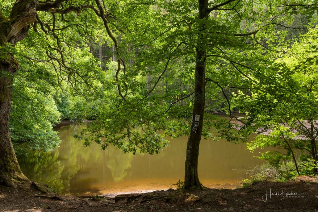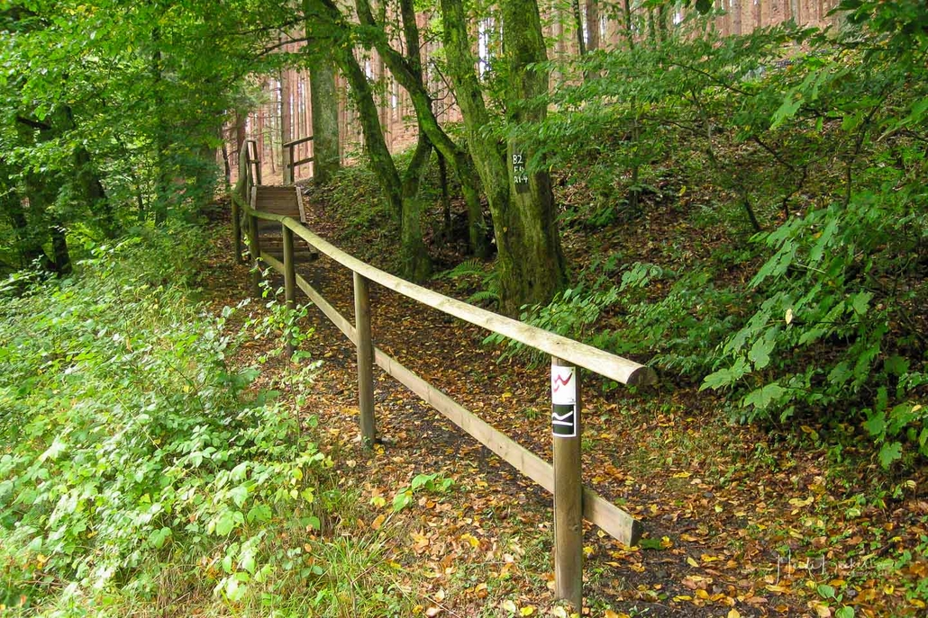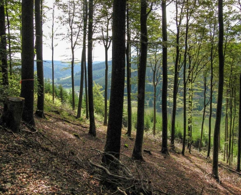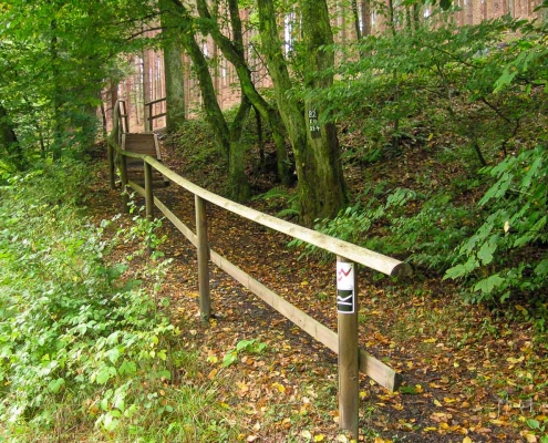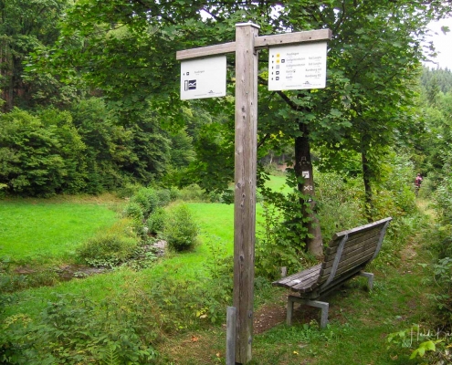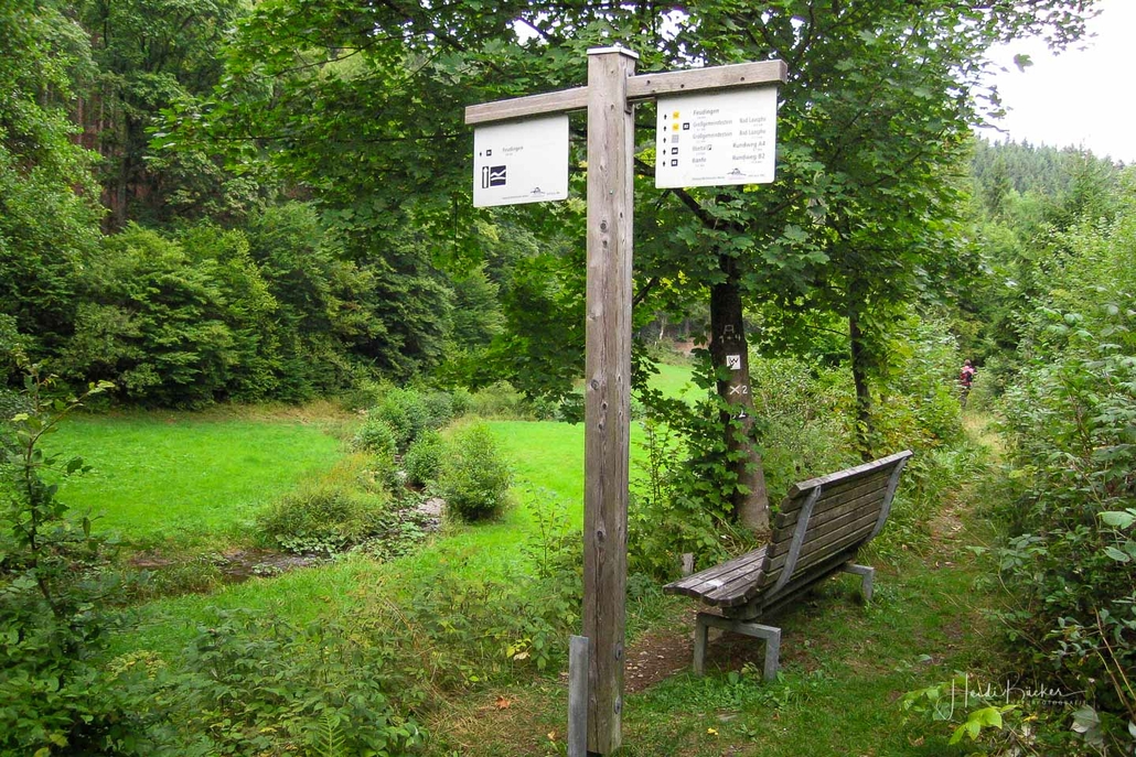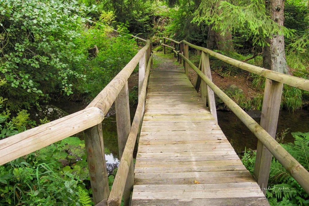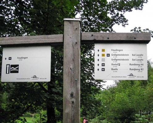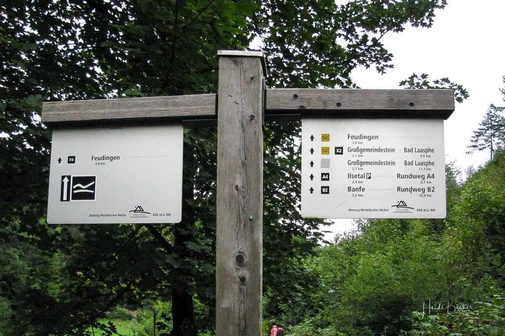 Über schmale Pfade und Waldwege geht es zum idyllisch gelegenen Weidelbacher Weiher. Ein Teich, mitten im Wald, umgeben von einer herrlichen Ruhe. Hier gibt es Bänke und eine Schutzhütte, um eine Rast einzulegen. Ab dem Weiher geht es durch hohen Fichten- und Buchenwald hinunter ins Tal der Ilse. Über eine schmale Holzbrücke geht es auf die andere Seite, wo ein uriger Pfad entlang des kleinen Baches führt. Später geht es über einen Wiesen- und Waldweg, vorbei an gewaltigen Felsformationen im Wald und schroffen Felswänden am Wegesrand in Richtung Feudingen.