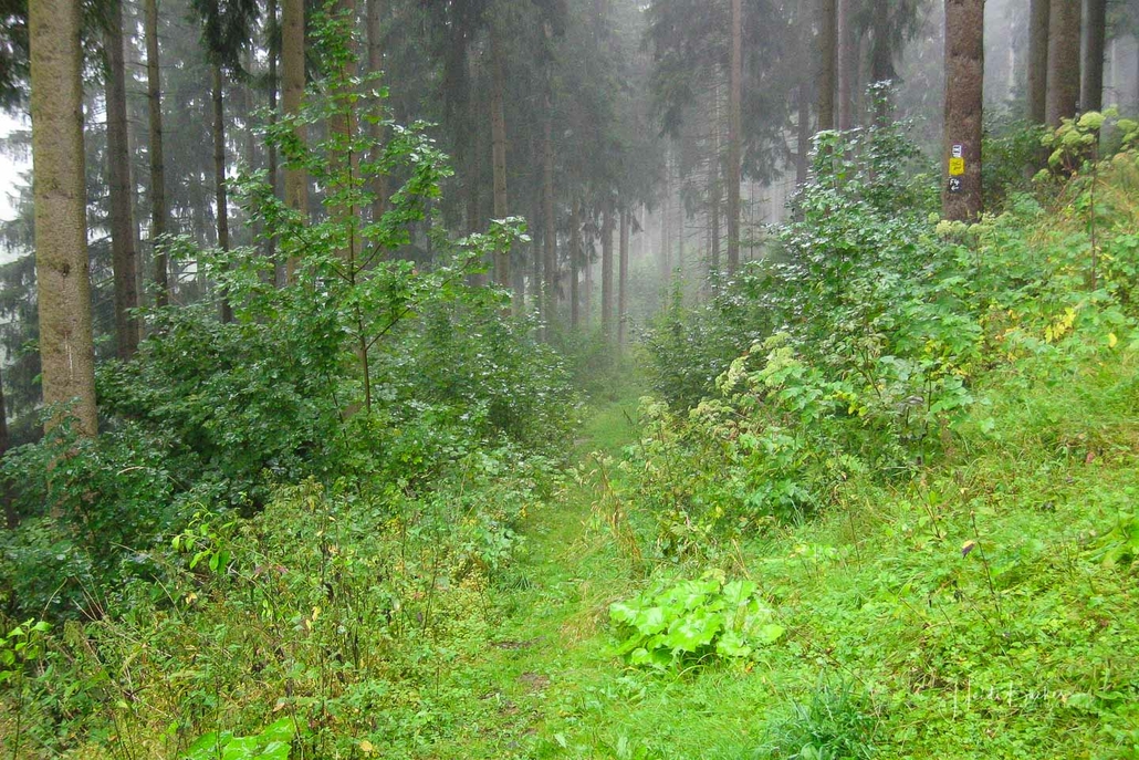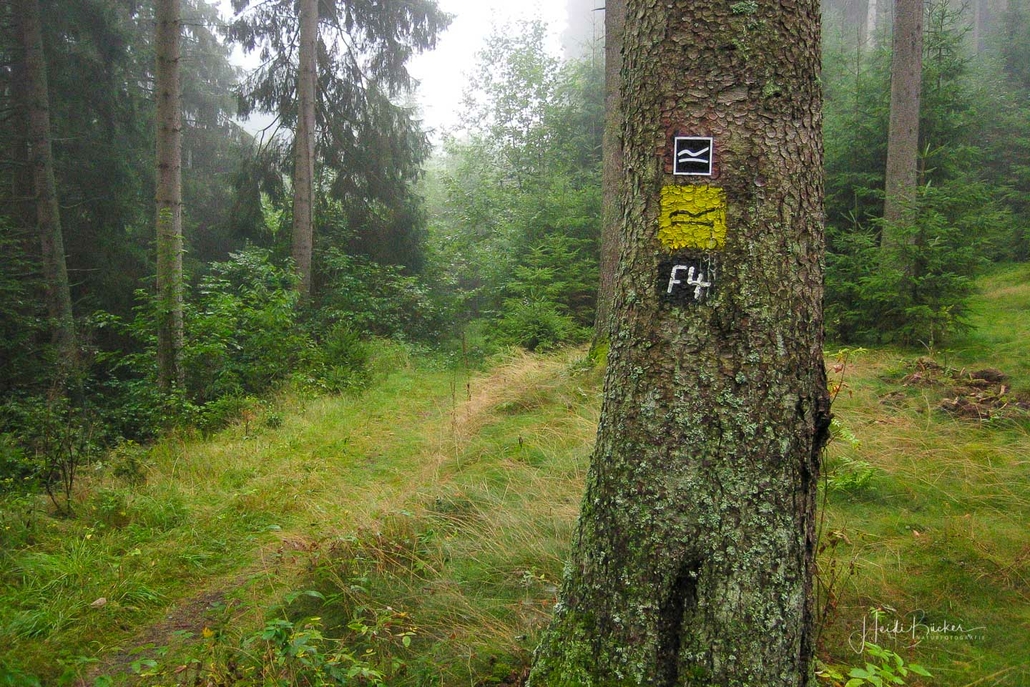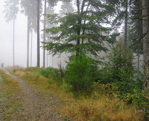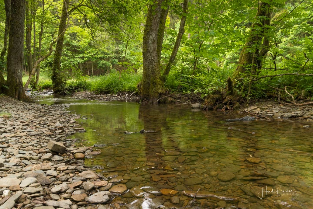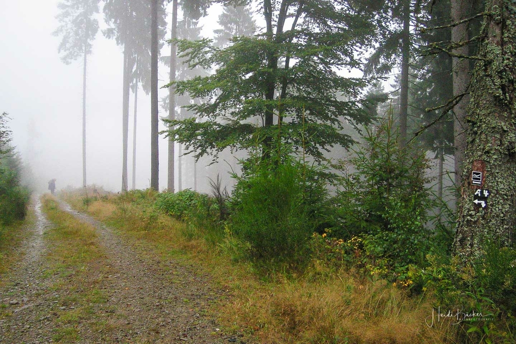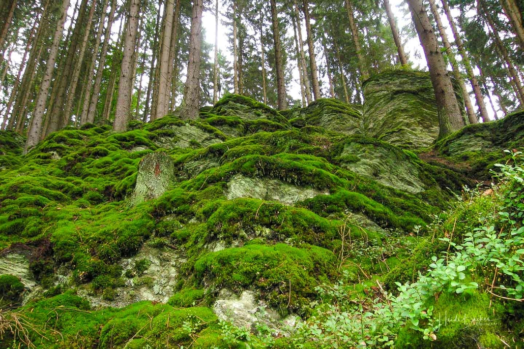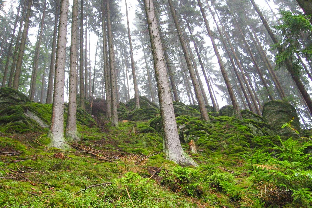Über schmale Pfade und Waldwege geht es zum idyllisch gelegenen Weidelbacher Weiher. Ein Teich, mitten im Wald, umgeben von einer herrlichen Ruhe. Hier gibt es Bänke und eine Schutzhütte, um eine Rast einzulegen. Ab dem Weiher geht es durch hohen Fichten- und Buchenwald hinunter ins Tal der Ilse. Über eine schmale Holzbrücke geht es auf die andere Seite, wo ein uriger Pfad entlang des kleinen Baches führt. Später geht es über einen Wiesen- und Waldweg, vorbei an gewaltigen Felsformationen im Wald und schroffen Felswänden am Wegesrand in Richtung Feudingen.