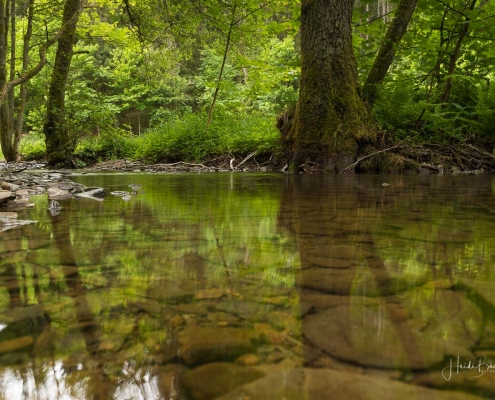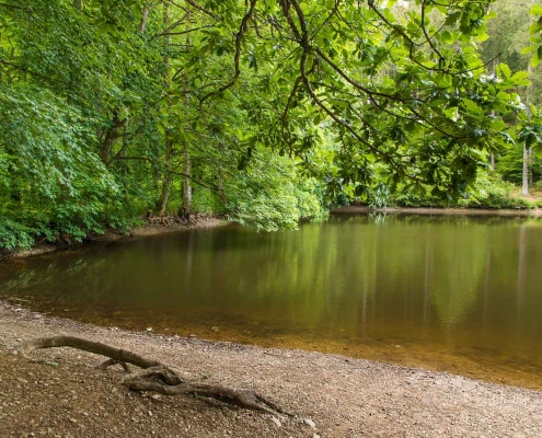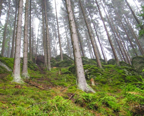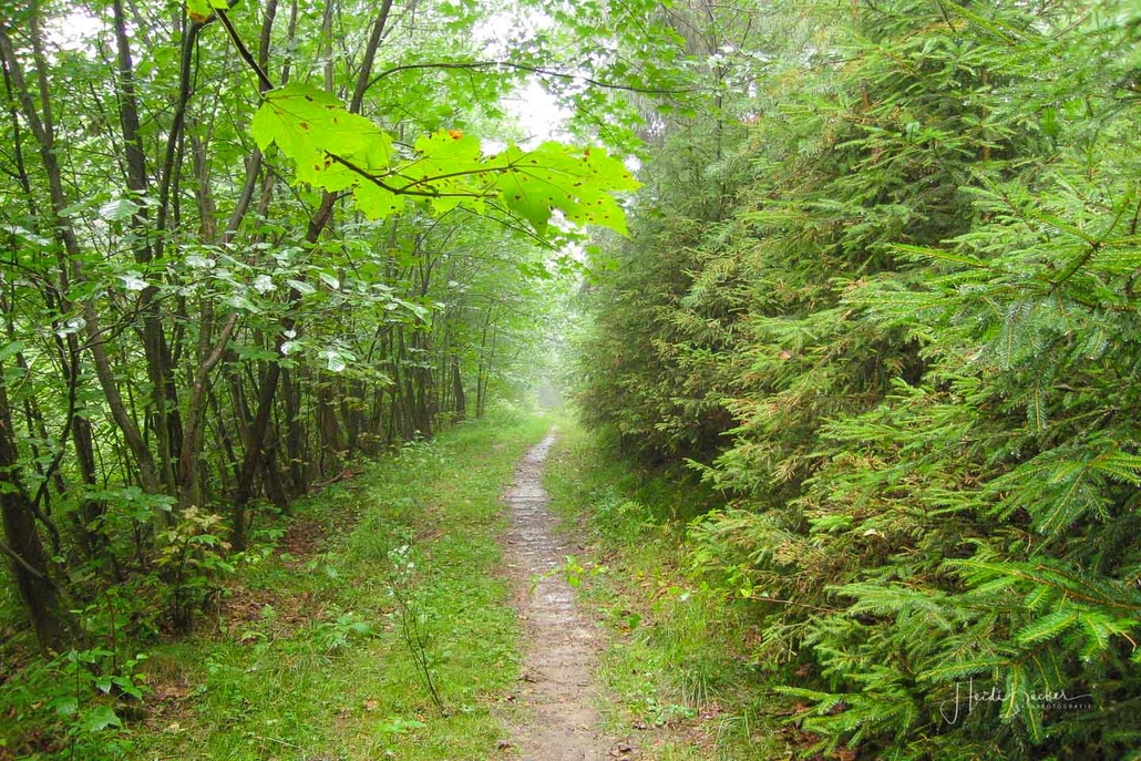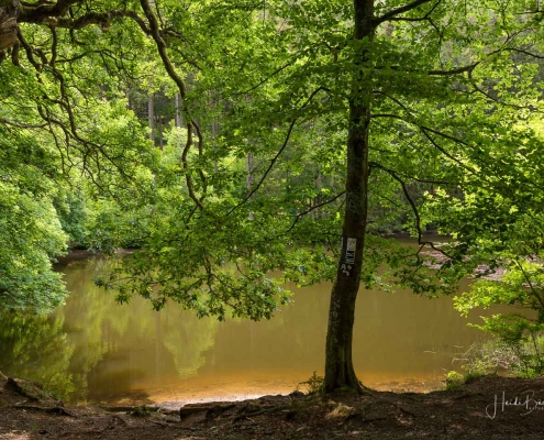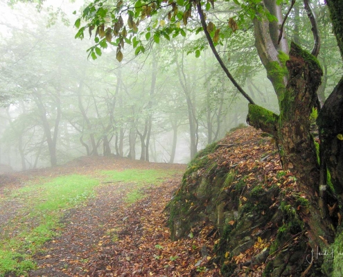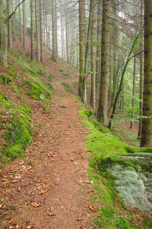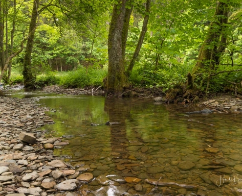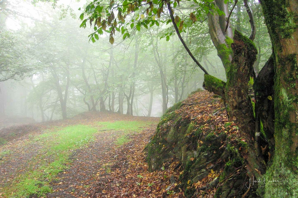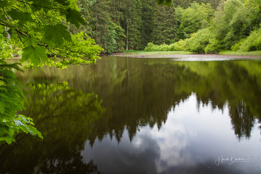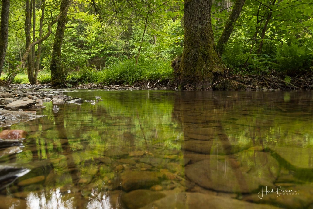 Über schmale Pfade und Waldwege geht es zum idyllisch gelegenen Weidelbacher Weiher. Ein Teich, mitten im Wald, umgeben von einer herrlichen Ruhe. Hier gibt es Bänke und eine Schutzhütte, um eine Rast einzulegen. Ab dem Weiher geht es durch hohen Fichten- und Buchenwald hinunter ins Tal der Ilse. Über eine schmale Holzbrücke geht es auf die andere Seite, wo ein uriger Pfad entlang des kleinen Baches führt. Später geht es über einen Wiesen- und Waldweg, vorbei an gewaltigen Felsformationen im Wald und schroffen Felswänden am Wegesrand in Richtung Feudingen.