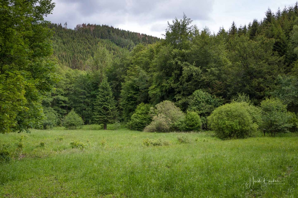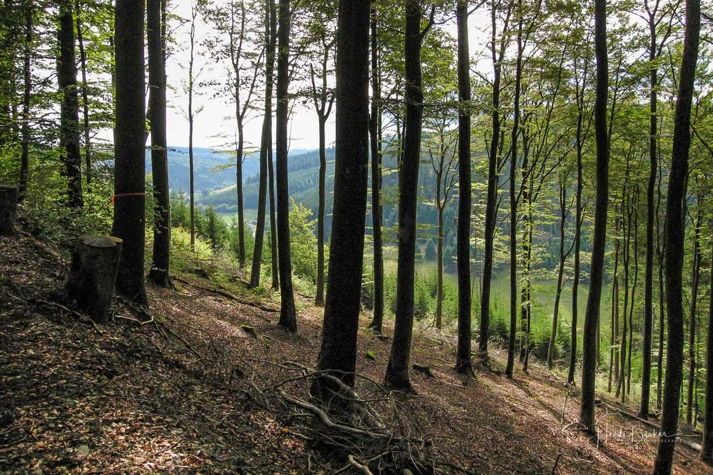 In Feudingen führt der Weg nochmal steil bergan. Oberhalb des Lahntals eröffnet sich wieder ein herrlicher Ausblick auf die Umgebung, bevor es durch Fichten- und Buchenwald – vorbei an Glashütte – zurück nach Volkholz geht.