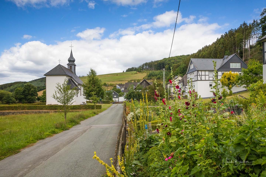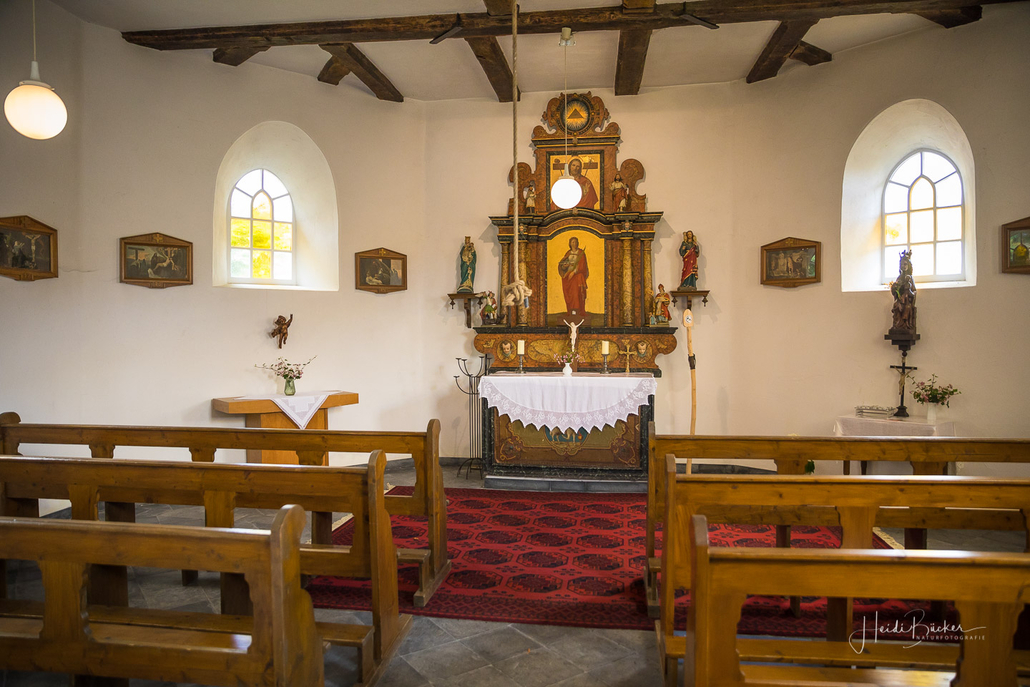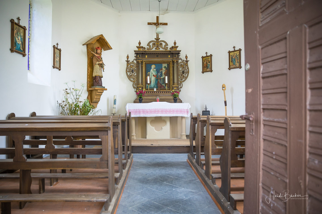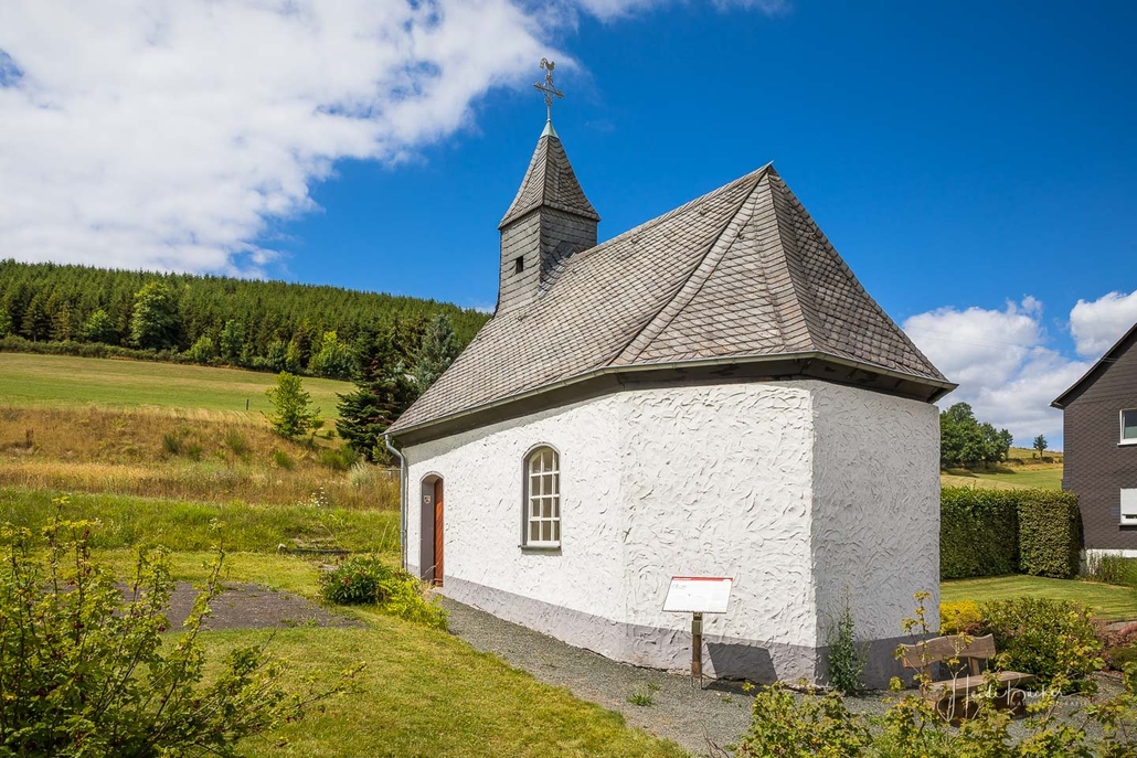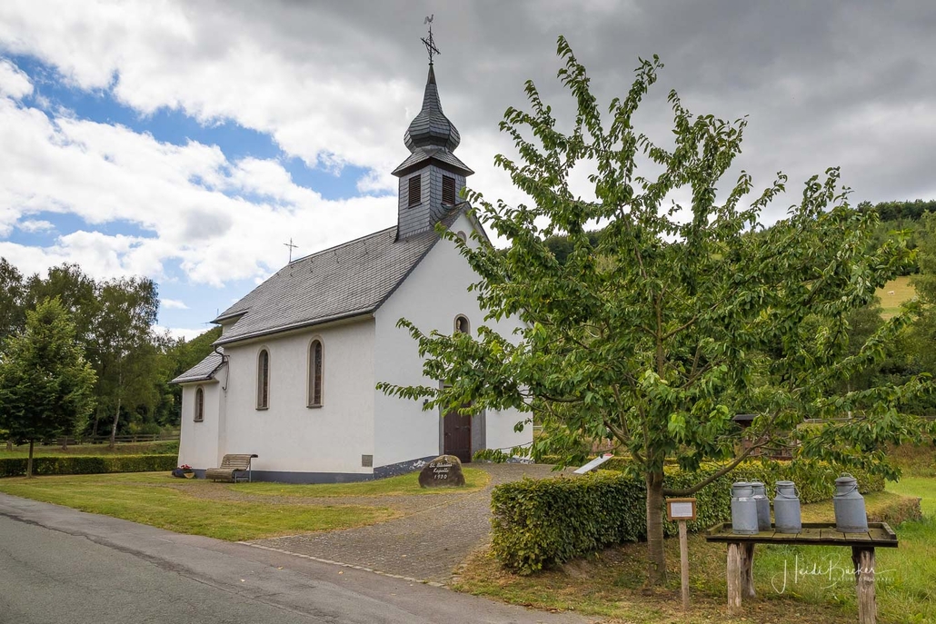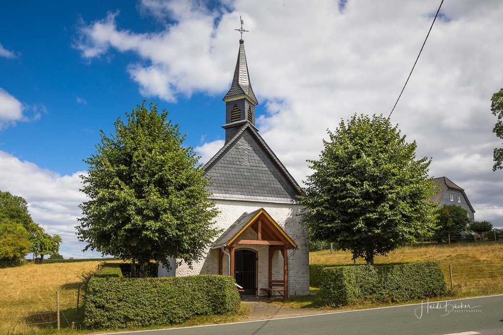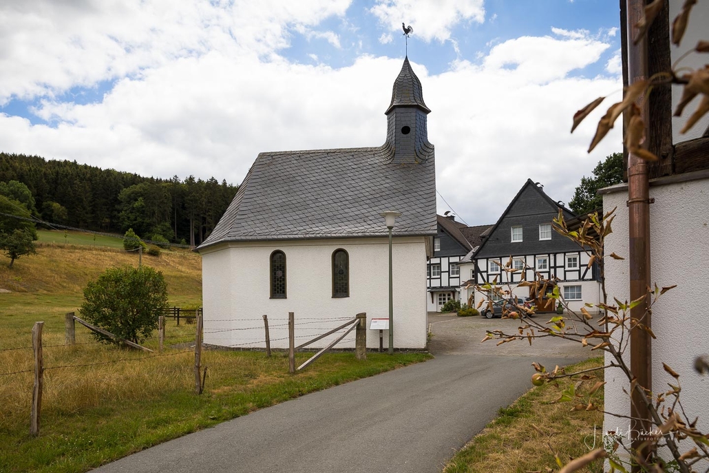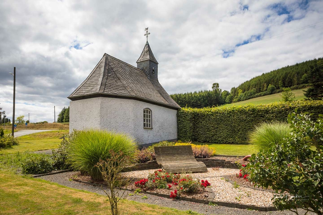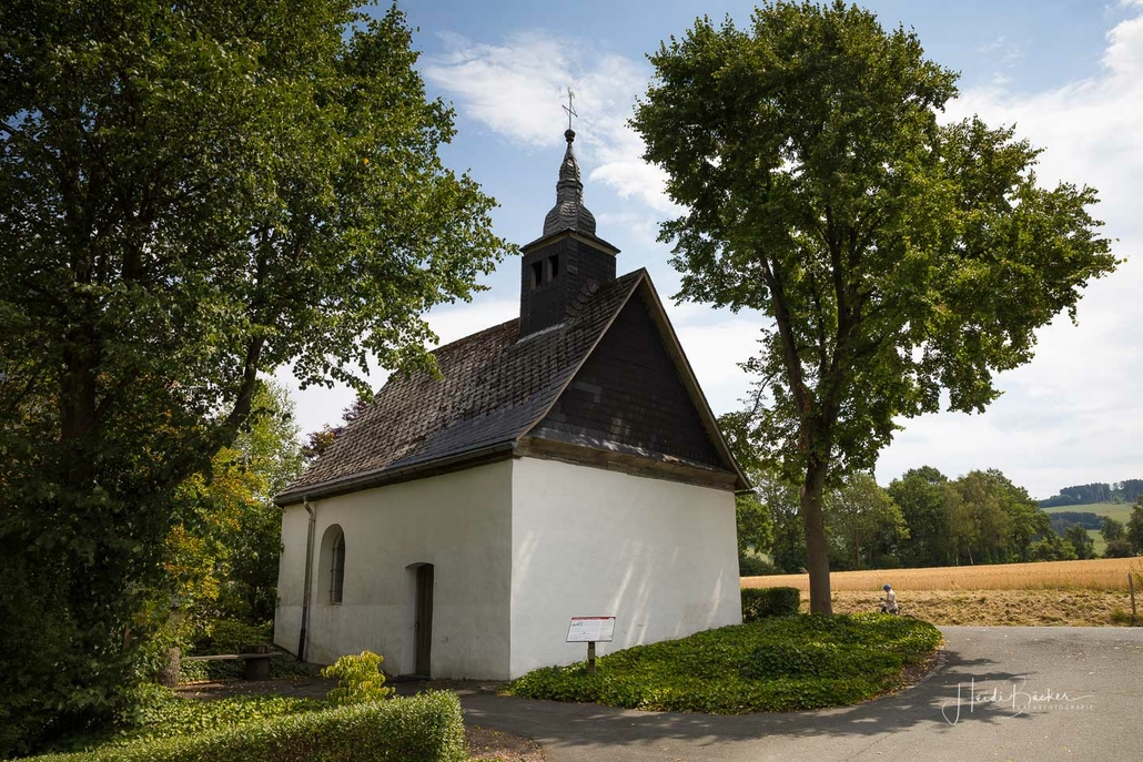 Der erste Pfad befindet sich kurz vor Sögtrop. Bevor es in den Ort geht, führt der Kapellenweg über einen Wiesenweg. Dieser Weg endet allerdings direkt an einer Kuhweide, die zu durchqueren ist. Die Weide betritt und verlässt man durch ein kleines Eisentor, durch das kein Fahrrad passt. Bevor es also auf den Wiesenweg geht, fährt man einfach runter auf die Landstraße und gelangt so direkt in den Ort und zur St. Blasius Kapelle.