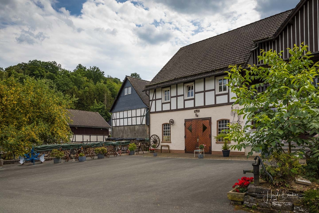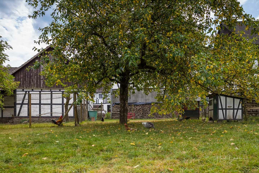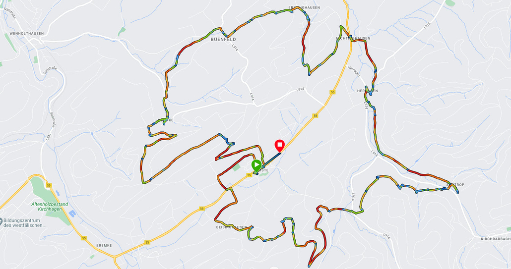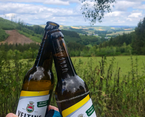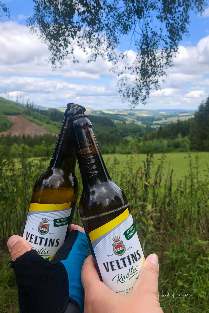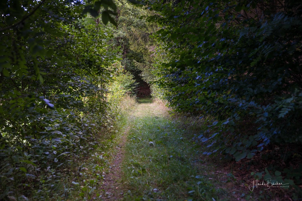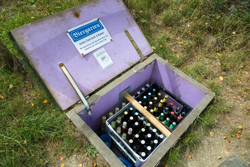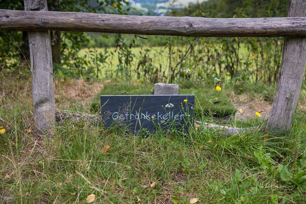 Der zweite Pfad befindet sich oberhalb von Büemke. Dort steht ein schönes Waldsofa und es gibt an der Stelle auch einen tollen Getränkekeller, an dem man sich gegen ein kleines Endgeld bedienen darf. Direkt hinter dem Waldsofa geht ein kurzer Pfad leicht bergauf und trifft oben wieder auf einen Wirtschaftsweg. Mit dem Rad fährt man einfach am Waldsofa vorbei und biegt in der ersten scharfen Kurve nach rechts ab. Wer im Sommer mit kurzen Hosen unterwegs ist und ungern Zecken einsammeln möchte, dem ist auch der unwesentlich längere „Umgehungsweg“ zu empfehlen. Der Pfad war zwar freigeschnitten, aber trotzdem wachsen rechts und links hohe Gräser und Brennnesseln.