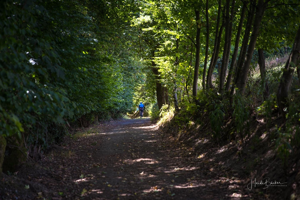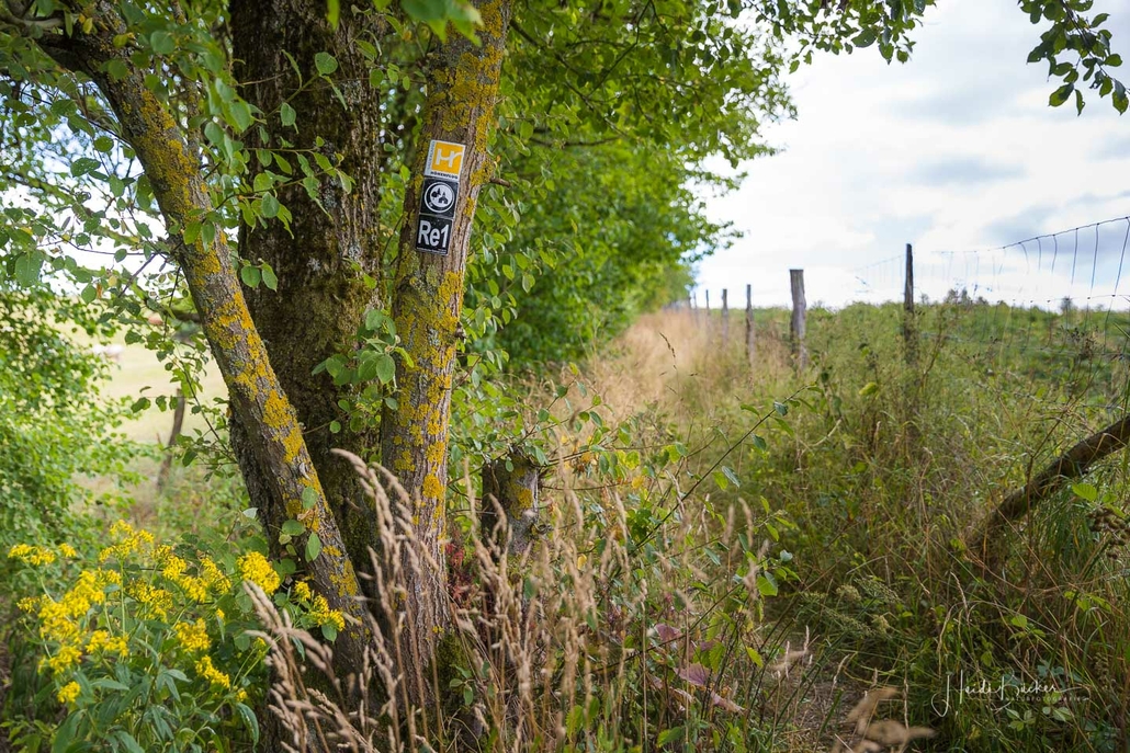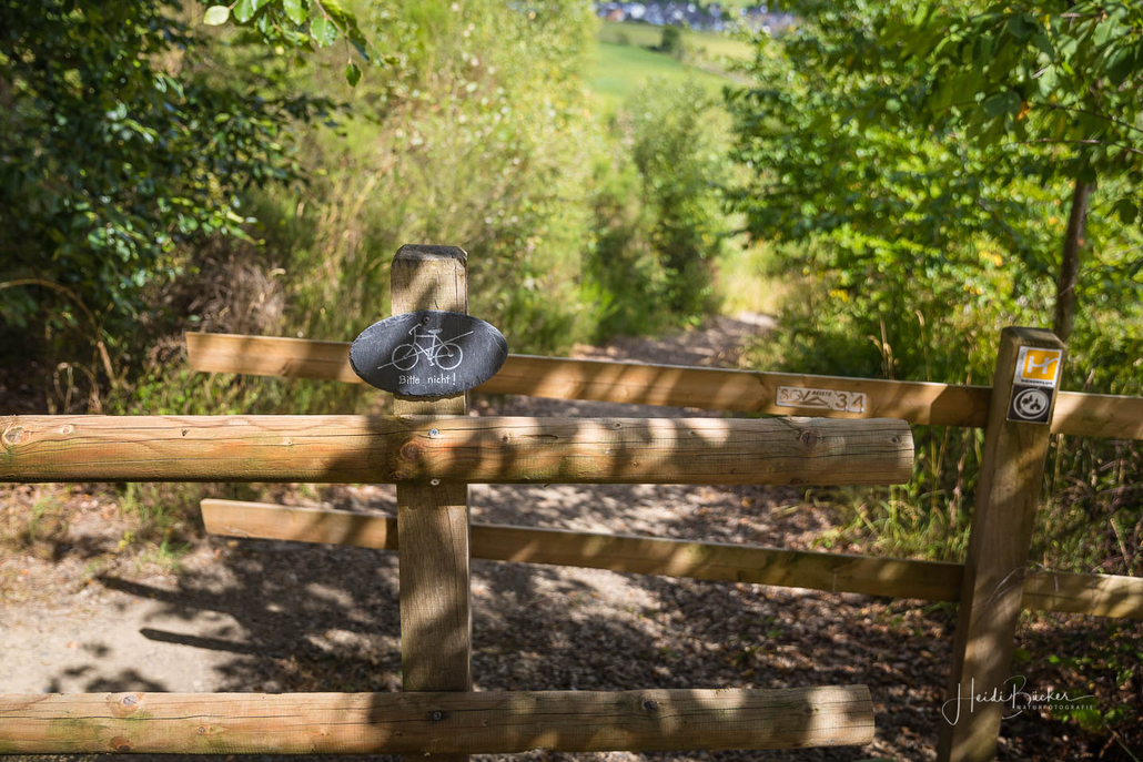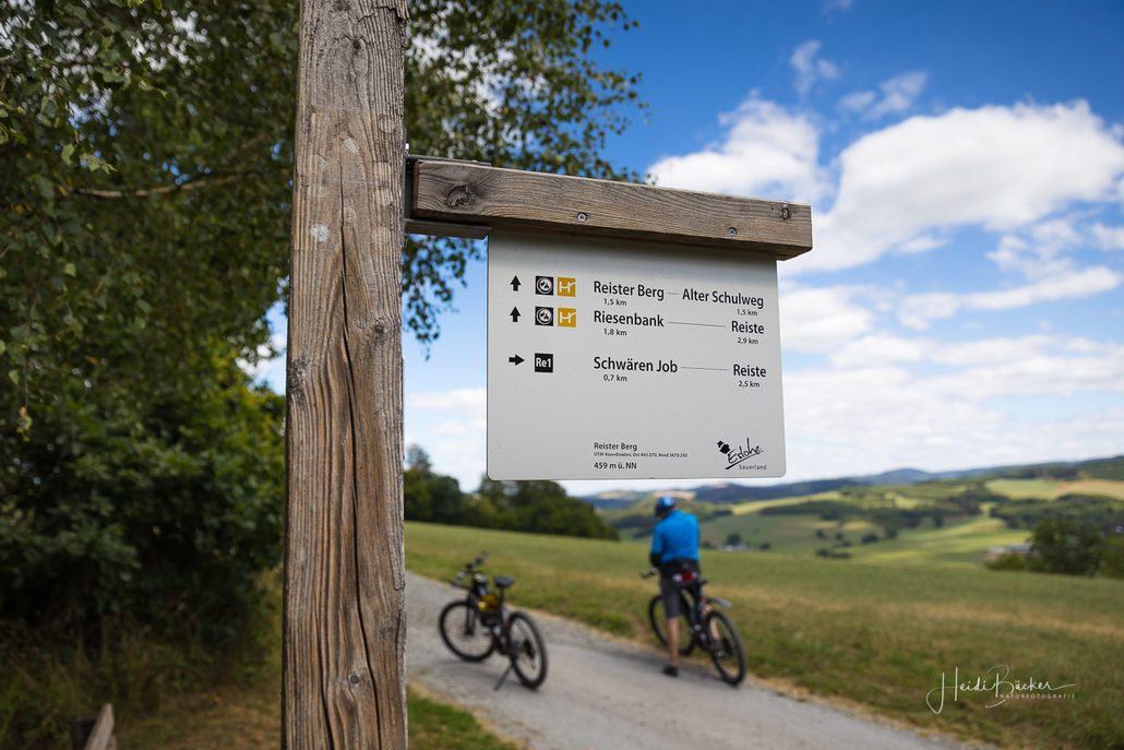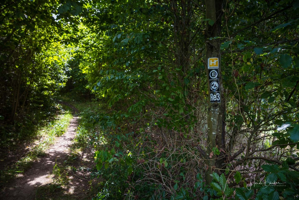 Der dritte Pfad führt von der Riesenbank, oberhalb von Reiste zu einer Streuobstwiese und danach wieder zurück in den Ort. Auch hier muss man mit dem Rad einen kleinen Umweg über einen breiteren Waldweg machen.