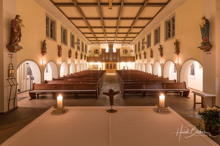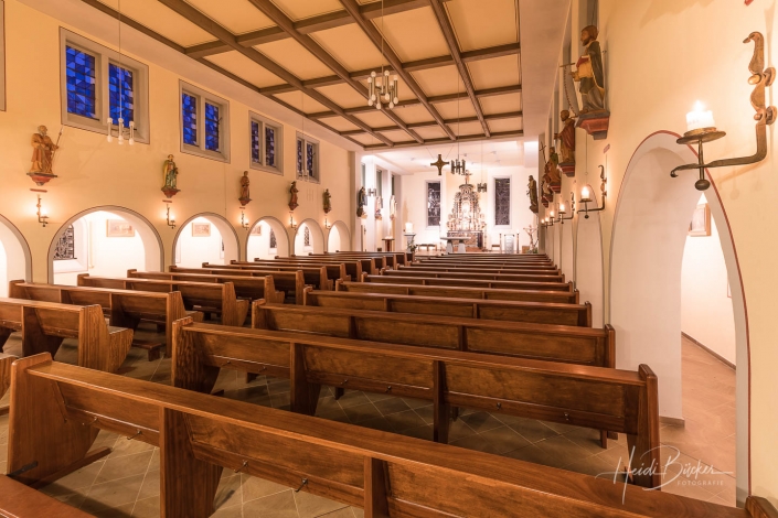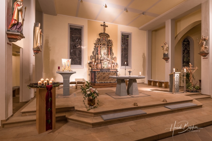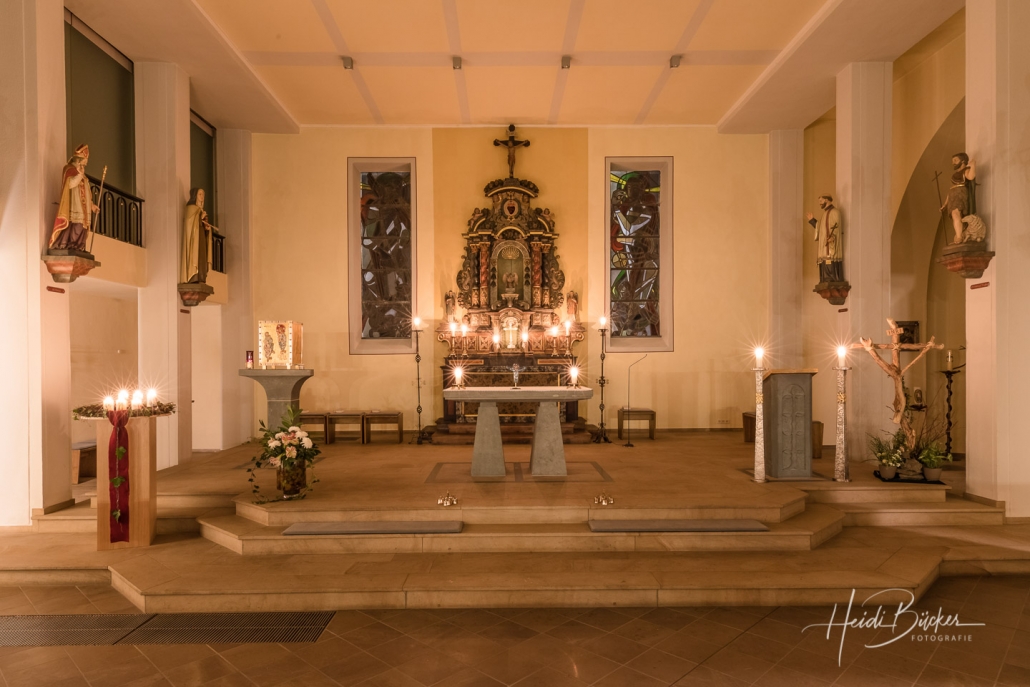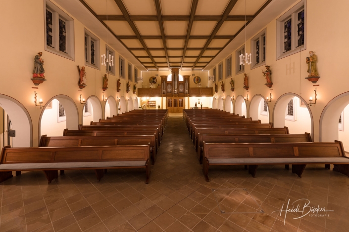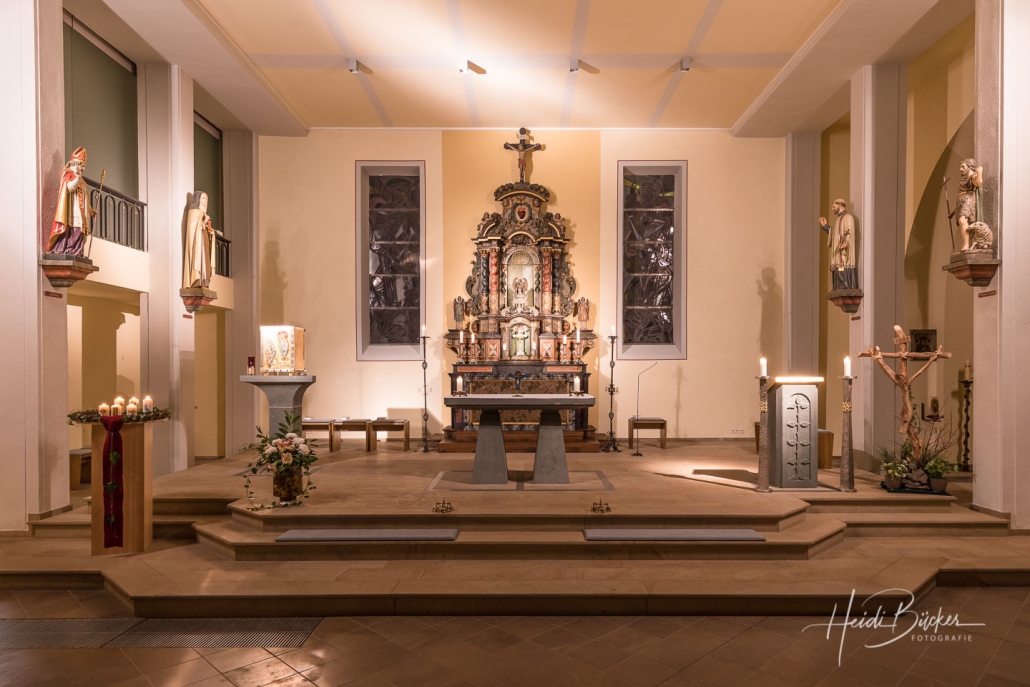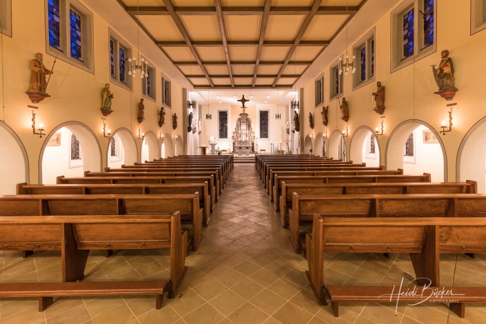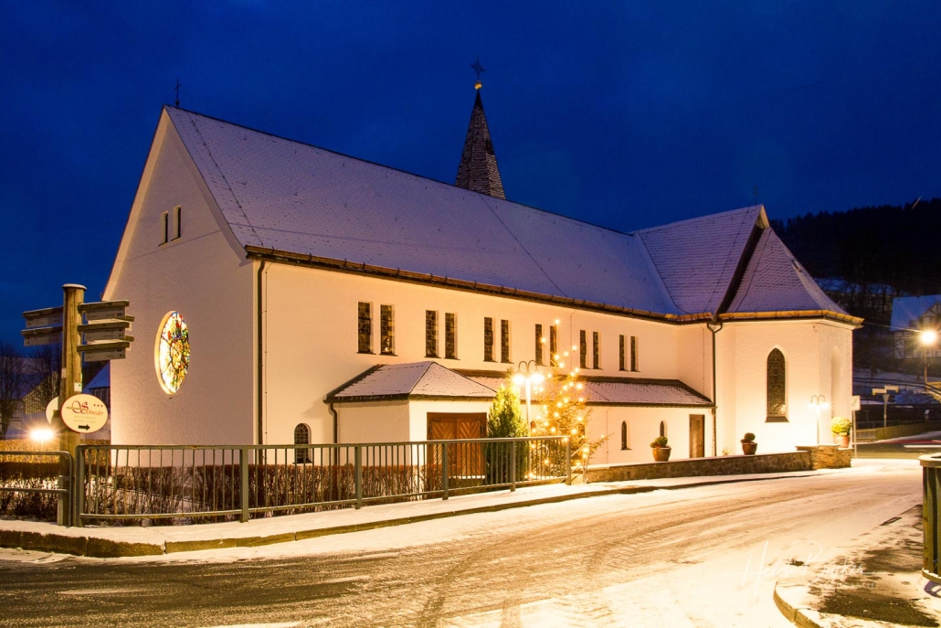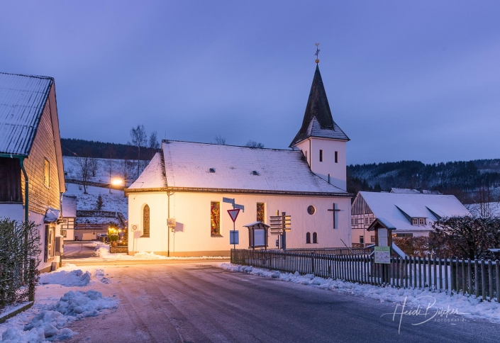 Ab und zu kommt es vor, dass ich für einen WOLL-Bericht eine Kirche fotografieren muss, was mir auch richtig viel Spaß macht! So sind bereits einige tolle Bilder verschiedener Kirchen und Kapellen entstanden, unter anderem von der St. Gertrudis Kirche in Oberkirchen und letztens von der St. Blasius Kirche in Westfeld. Während Pastor Stipp, der über viel geschichtliches Wissen von den Kirchen in seinen Gemeinden verfügt, von meiner Kollegin Heike befragt wurde, war ich fotografisch tätig. In Oberkirchen führte er uns sogar hoch bis in den Glockenturm ( siehe Bildergalerie Oberkirchen ). In Westfeld stand mir die Küsterin zur Seite …ich wußte gar nicht, dass es in unserer Kirche so viele Beleuchtungsstromkreise gibt, von den zahlreichen Kerzen ganz zu schweigen. Es hat eine Zeit gedauert, bis alle Fotos im Kasten waren: Licht an, Licht aus! Strahler vorne an/aus! Strahler hinten an/aus! Kerzen an/aus ….usw. 🙂 Aber die Mühe hat sich gelohnt und es sind schöne Fotos entstanden. Das Beste an der Sache ist, dass die Fotos teils in der blauen Stunde nach Sonnenungergang gemacht wurden. Deshalb leuchten die Kirchenfenster in einem tollen Blau, was keine nachträgliche Farbmanipulation mit einem Bildberarbeitungsprogramm am PC ist, sondern eine tatsächlich vorhandene Lichtstimmung. Der WOLL-Bericht ist bereits im Wintermagazin 2019 erschienen und ist auch auf der Website von Westfeld nachzulesen. Später werden die Fotos noch in einem Porspekt über die St. Blasius Kirche gedruckt.