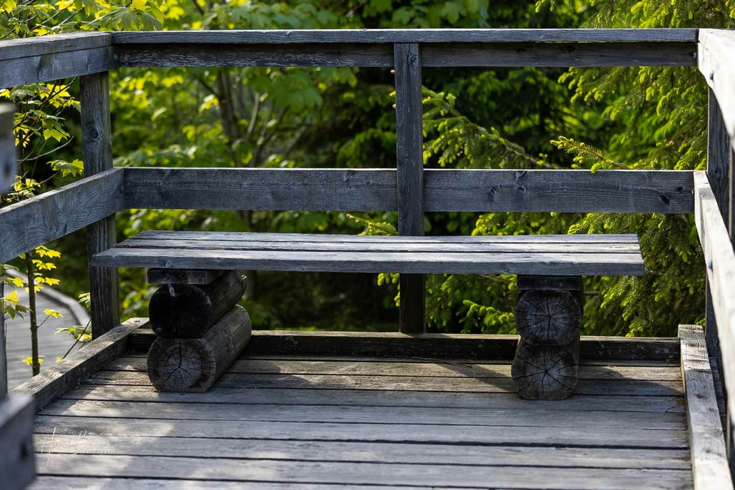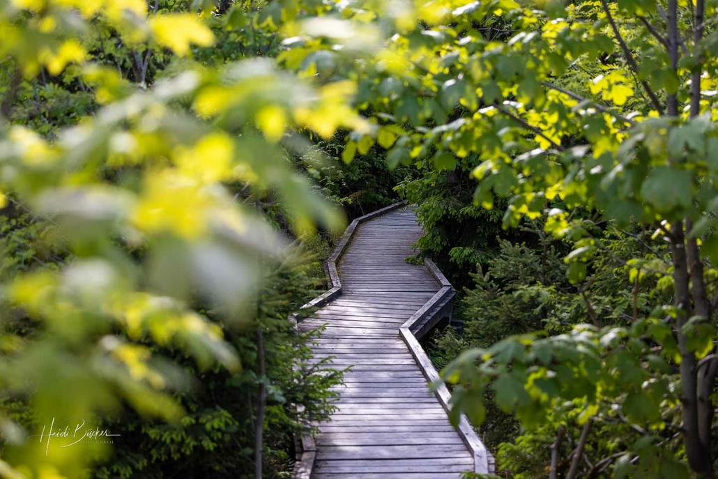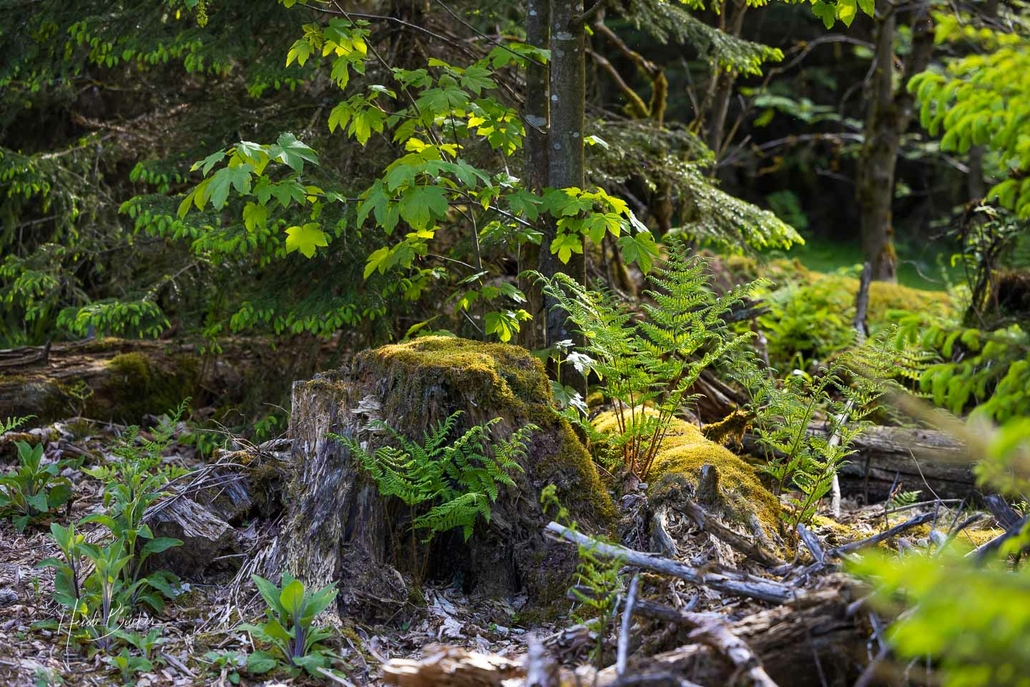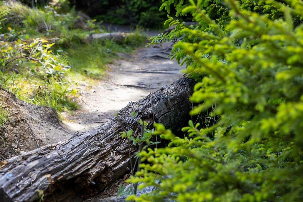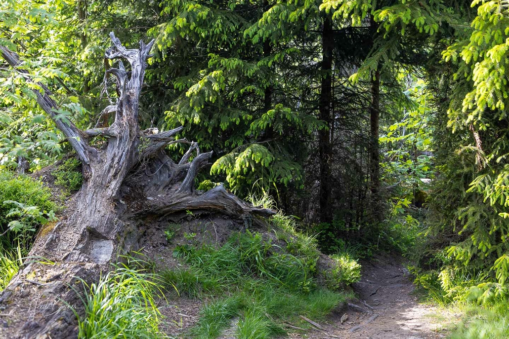 In den ersten Jahren konnte man von den Holzstegen fast noch über die gesamte verwüstete Fläche schauen. Doch im Laufe der Jahre hat sich ein neuer Wald mit vielen verschiedenen Pflanzen und Baumarten entwickelt …freie Sicht gibt es schon lange nicht mehr. Auf dem Boden liegen allerdings immer noch die dicken Baumstämme, die sich im Zersetzungsprozess befinden. Sie bieten Lebensraum für Moose, Pilze, Insekten und verschiedene Tierarten.