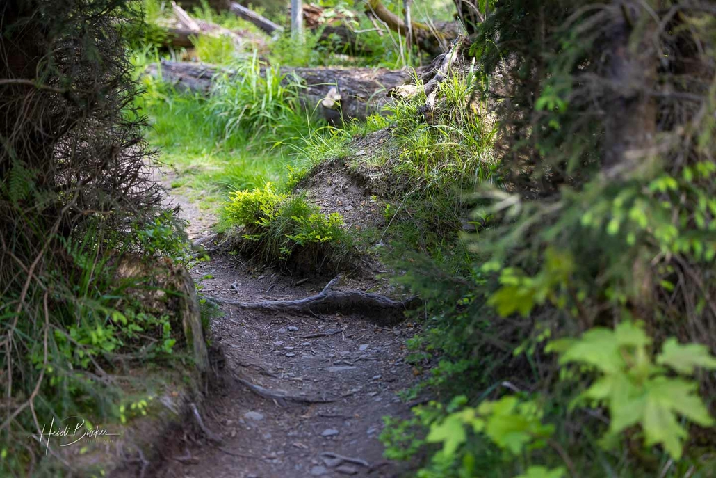 Puren Naturgenuss erleben Wanderer und Besucher auf dem 1000 Meter langen Kyrill-Pfad in dem kleinen Schmallenberger Dörfchen Schanze. Hier taucht man für kurze Zeit ab in eine ursprüngliche Natur. Ein schmaler Pfad schlängelt sich vorbei an wild gewachsenen Bäumen und Sträuchern und führt über entwurzelte und vermooste Baumstämme. Der Kyrill-Pfad ist einer von den 42 Seelenorten des Sauerlandes. Es ist ein Ort, wo man Vergänglichkeit und Neubeginn eines Waldes beobachten oder einfach nur für einen Moment innehalten und genießen kann.