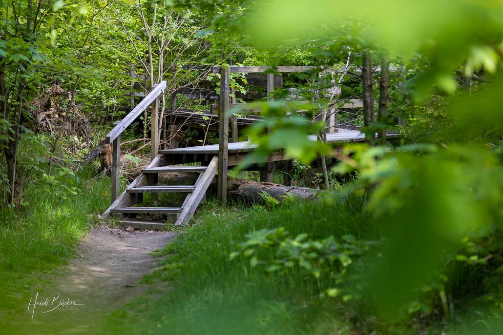Die Ranger bauten in Handarbeit mitten durch das Zentrum der vom Sturm beschädigten Fläche, Holzstege, Trittleitern und kleine Aussichtsplattformen. So entstand auf einer Länge von einem Kilometer ein besonderer Rundweg direkt am Rothaarsteig. Hier können die Besucher bis heute noch die Auswirkungen von Kyrill und die Veränderungen und Entwicklungen des Waldes ganz nah erleben.