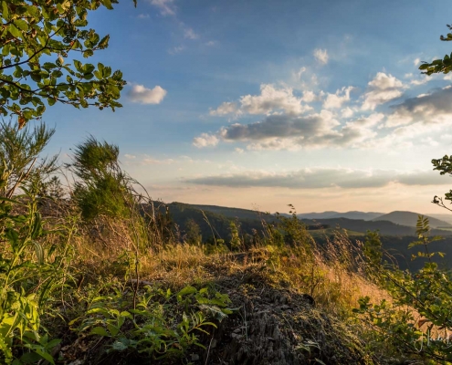 Anfang des Jahres habe ich für mich noch einen weiteren Lieblingsplatz entdeckt, an dem ich mich gerne aufhalte und der sich in unmittelbarer Nähe unseres Hauses in Westfeld befindet, so dass ich ihn leicht zu Fuß erreichen kann. Der Weg dorthin führt über den, im Frühjahr eingeweihten neuen „Westfelder Antoniussteig“, der inzwischen mit dem Deutschen Wandersiegel ausgezeichnet wurde. Man wandert über urige Pfade und schöne Wege, auf denen sich immer wieder tolle Panoramablicke bieten. Die Rundtour beginnt an der Westfelder St. Blasius Kirche, führt durch die Eitmecke hinauf auf den Sattel zwischen Hirschberg und Graftenberg zum Antonius-Häuschen und weiter durch das Naturschutzgebiet Kalte Kirche. Oberhalb der Wachholderheide geht es weiter zu Döpp´s Scheune. Einige Meter hinter der Scheune beginnt für mich eine der schönsten Wegepassagen, denn von dort zweigt ein uriger Pfad direkt bis auf die Ennest ab. Er führt über eine kleine Felsformation, von der man einen herrlichen Blick ins Schmallenberger Sauerland hat und bei schönem Wetter erlebt man hier wundervolle Sonnenuntergänge. Wer es etwas bequemer mag, der findet 50 Meter weiter ein gemütliches Waldsofa. Ein schönes Plätzchen, um sich mit einem Sundowner den Abend zu versüßen und den Sonnenuntergang zu zweit zu erleben … ein Geheimtipp für Romantiker!
