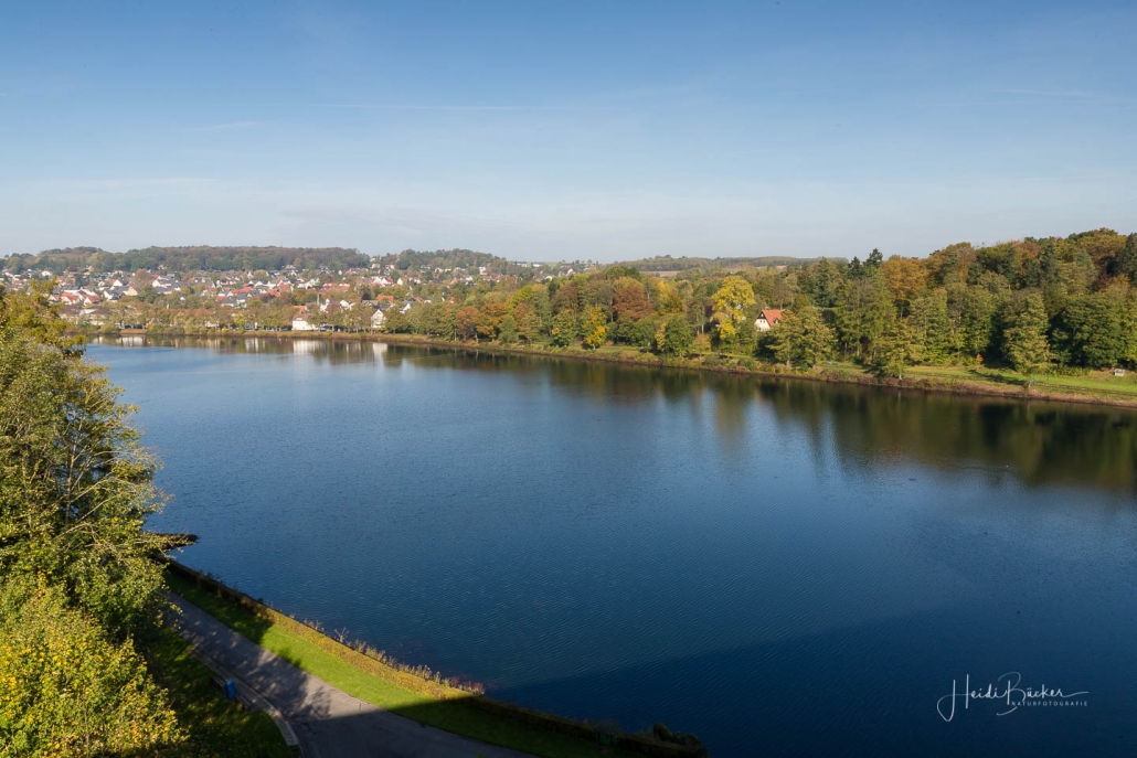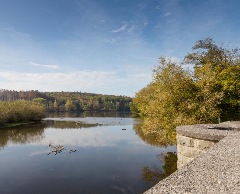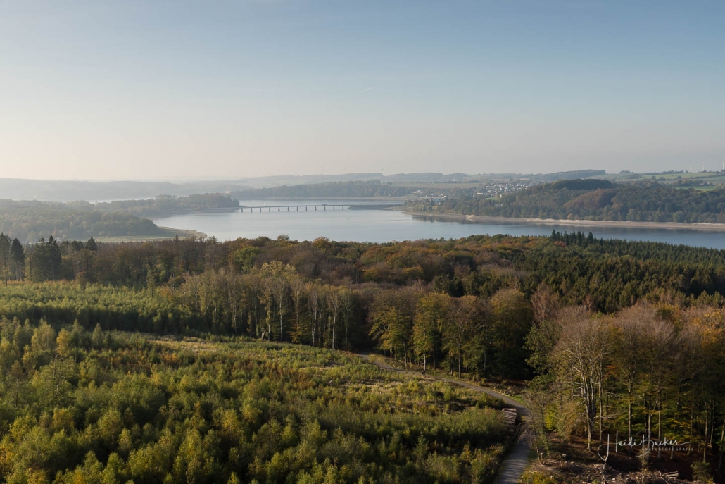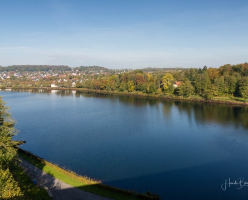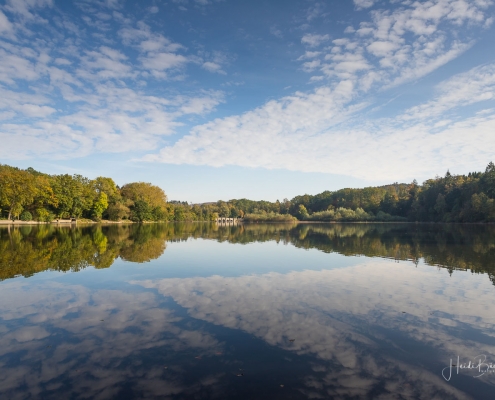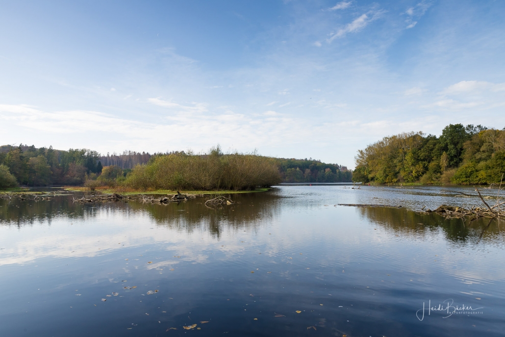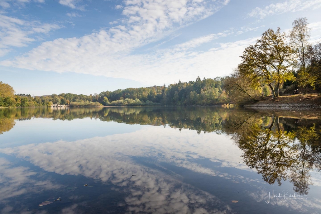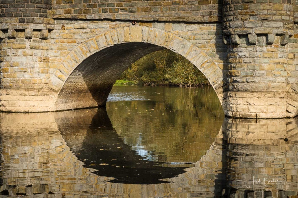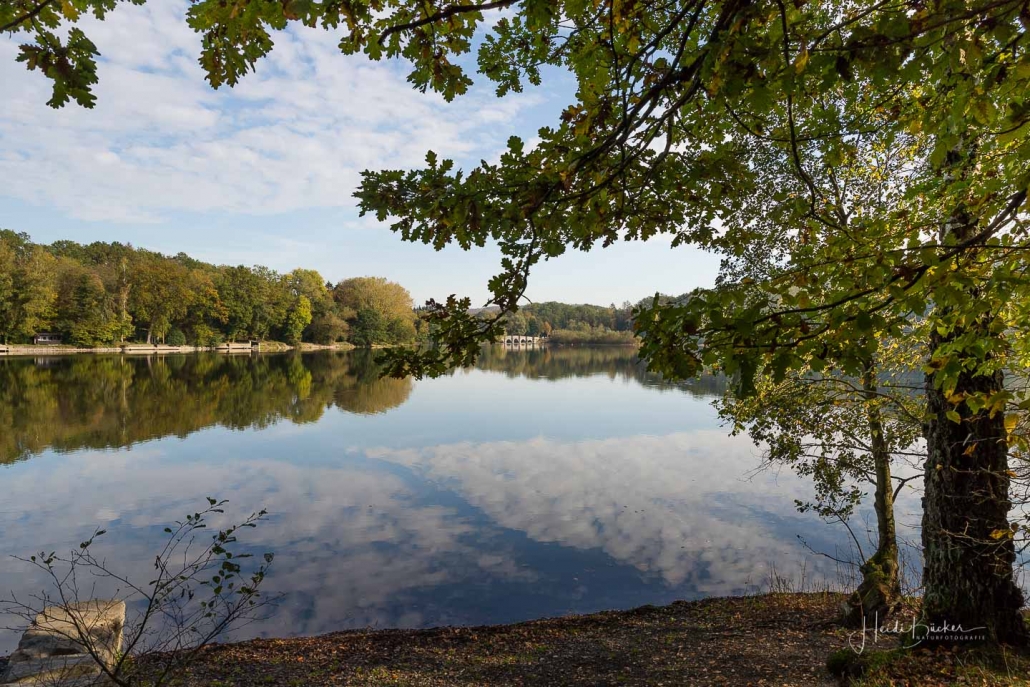 Vergangene Woche sind wir nochmal mit dem Rad um den Möhnesee gefahren. Der See war nur zu 65% gefüllt, was man im Uferbereich deutlich erkennen konnte. Auch in den Möhneauen war viel weniger Wasser, als im Frühjahr. Deshalb hatte ich die Möglichkeit, näher an die denkmalgeschützte Kanzelbrücke heranzukommen, um sie aus einer anderen Perspektive zu fotografieren. Außerdem war der See an diesem Tag besonders ruhig und die glatte Wasseroberfläche funktionierte wie ein Spiegel –optimale Bedingungen für Fotos.