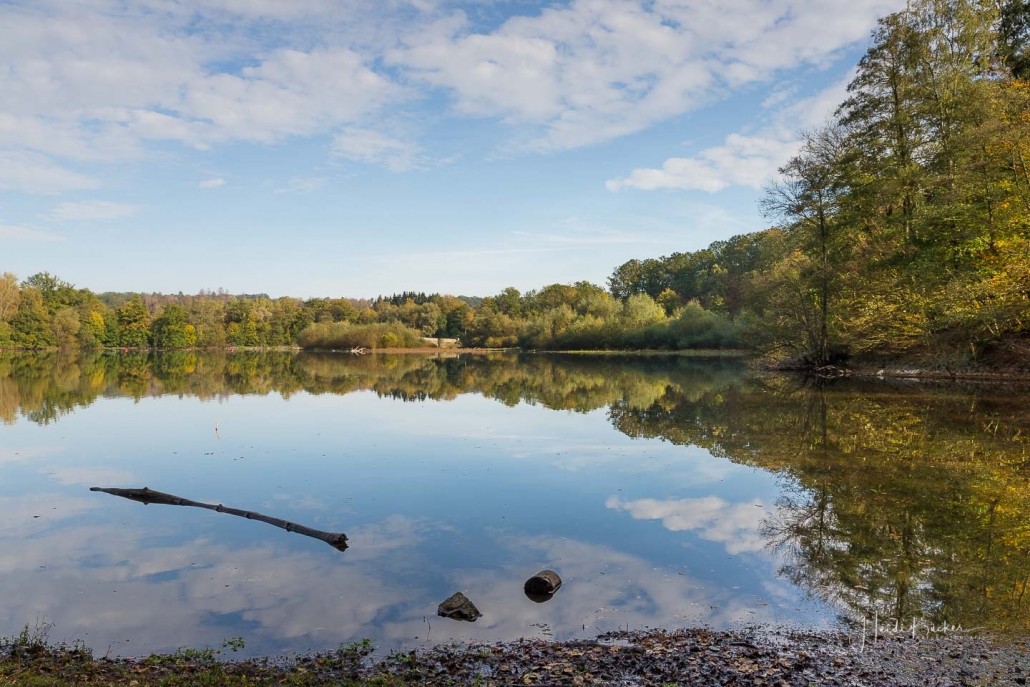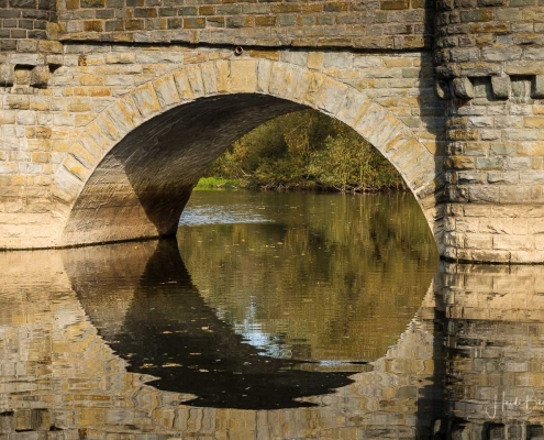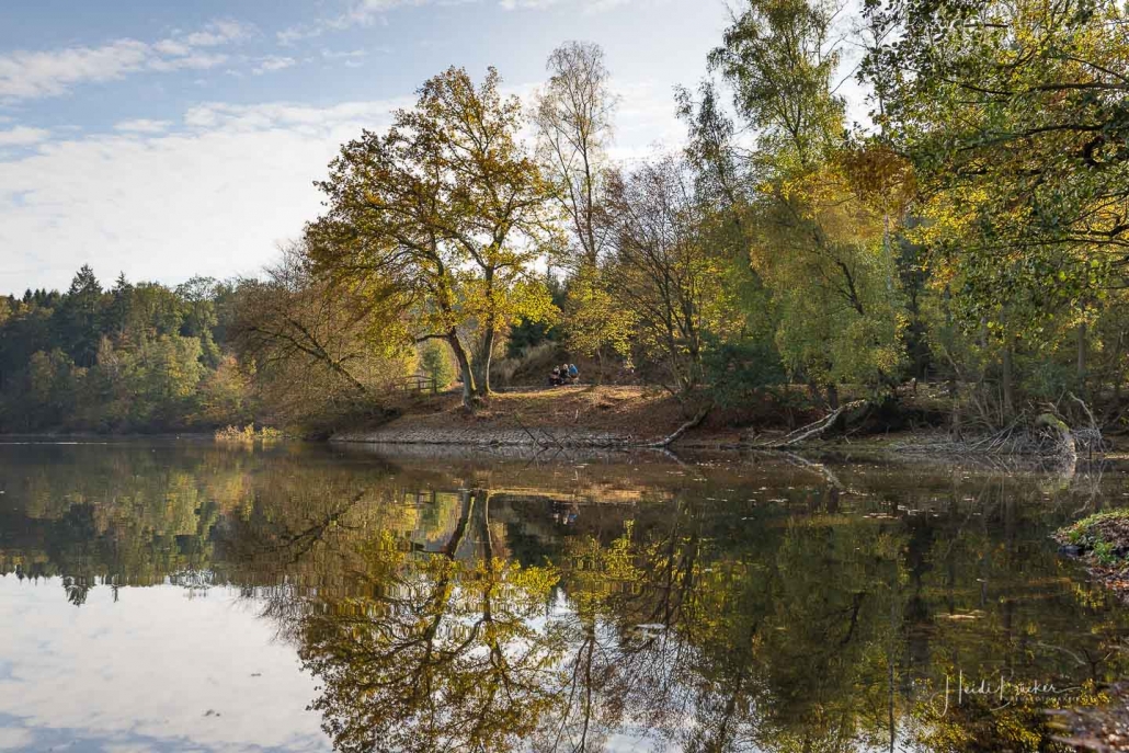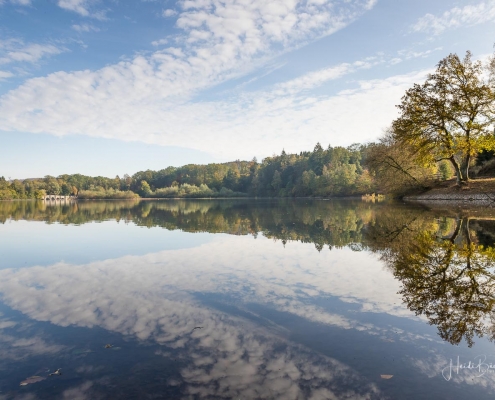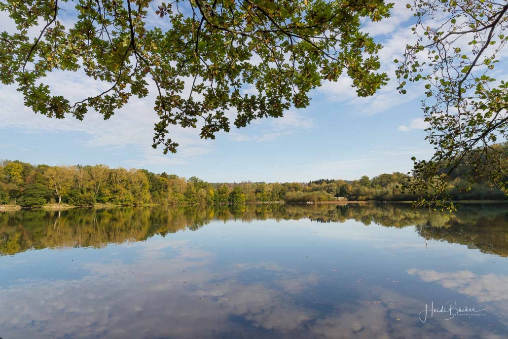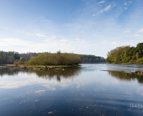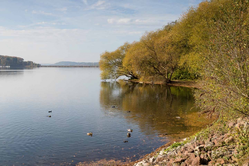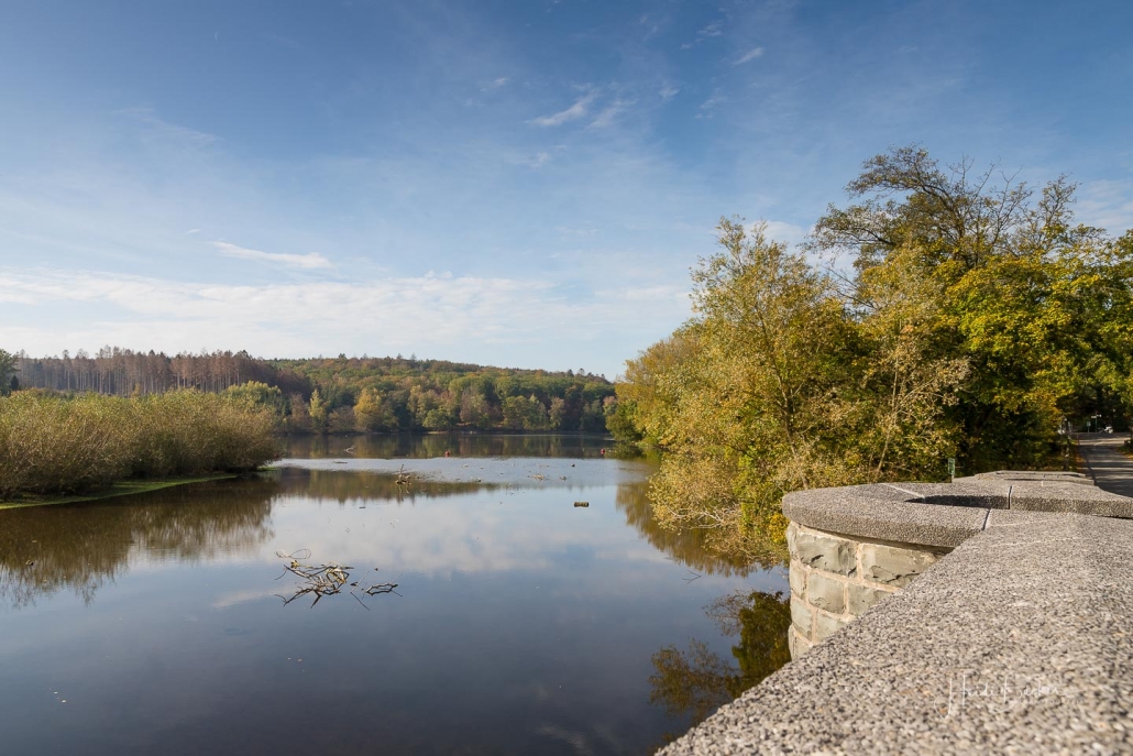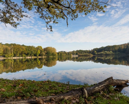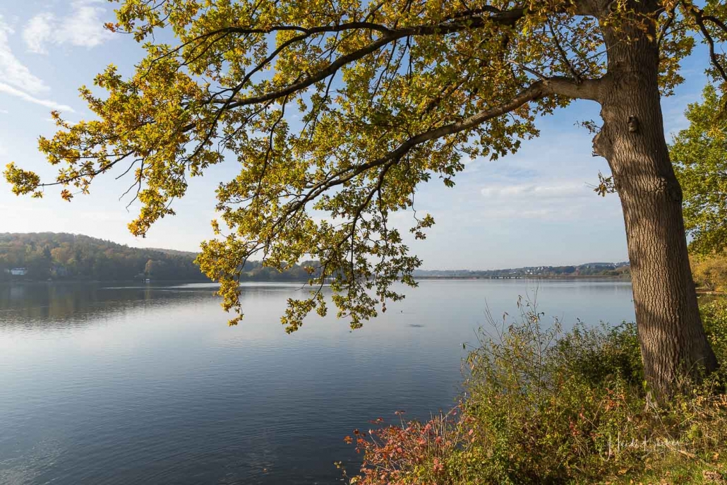 Vergangene Woche sind wir nochmal mit dem Rad um den Möhnesee gefahren. Der See war nur zu 65% gefüllt, was man im Uferbereich deutlich erkennen konnte. Auch in den Möhneauen war viel weniger Wasser, als im Frühjahr. Deshalb hatte ich die Möglichkeit, näher an die denkmalgeschützte Kanzelbrücke heranzukommen, um sie aus einer anderen Perspektive zu fotografieren. Außerdem war der See an diesem Tag besonders ruhig und die glatte Wasseroberfläche funktionierte wie ein Spiegel –optimale Bedingungen für Fotos.