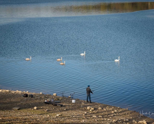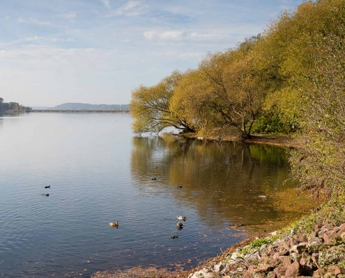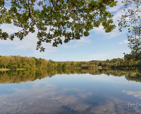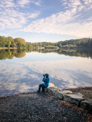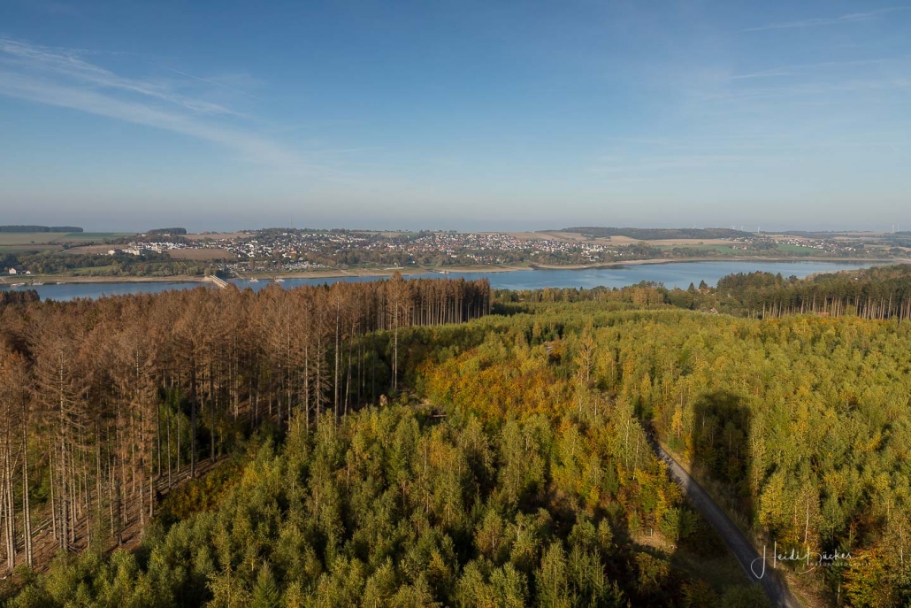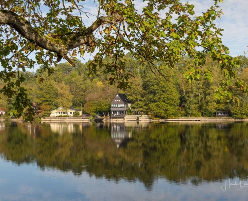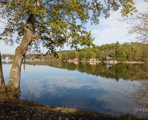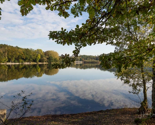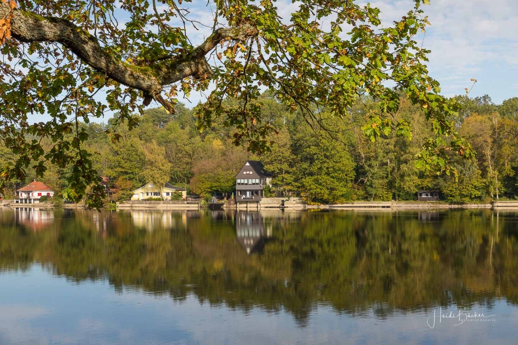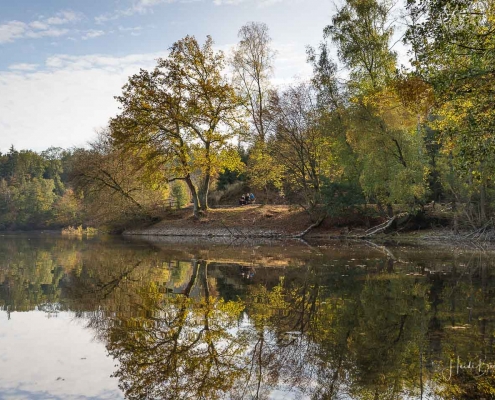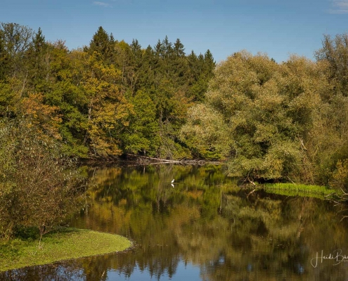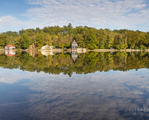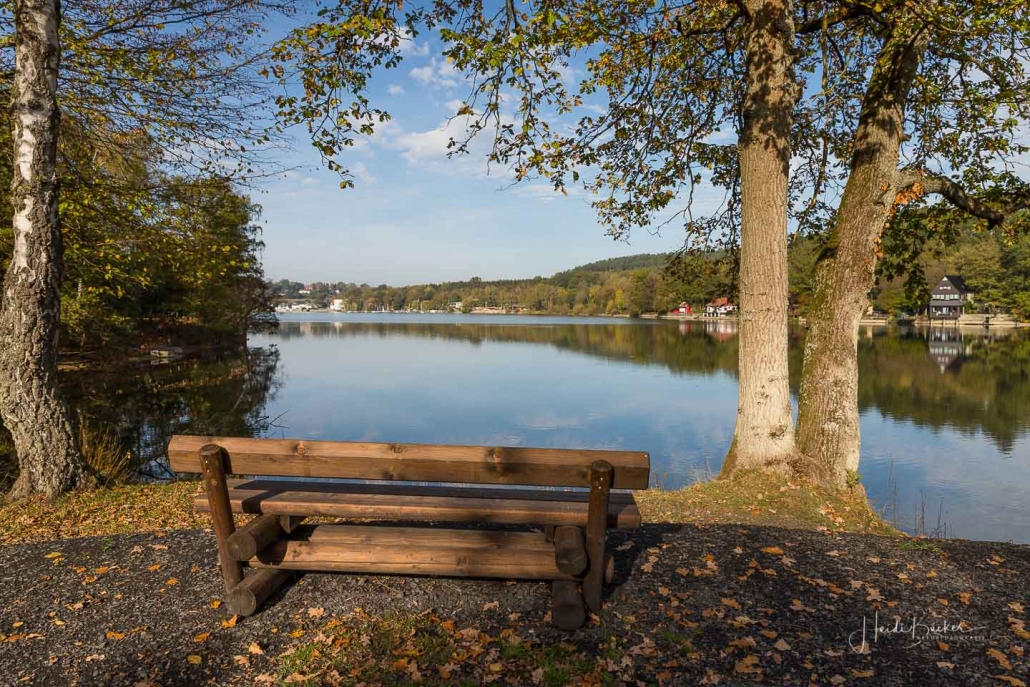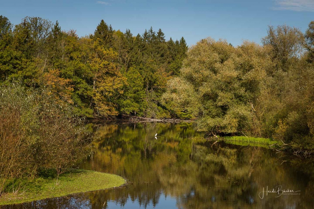 Vergangene Woche sind wir nochmal mit dem Rad um den Möhnesee gefahren. Der See war nur zu 65% gefüllt, was man im Uferbereich deutlich erkennen konnte. Auch in den Möhneauen war viel weniger Wasser, als im Frühjahr. Deshalb hatte ich die Möglichkeit, näher an die denkmalgeschützte Kanzelbrücke heranzukommen, um sie aus einer anderen Perspektive zu fotografieren. Außerdem war der See an diesem Tag besonders ruhig und die glatte Wasseroberfläche funktionierte wie ein Spiegel –optimale Bedingungen für Fotos.