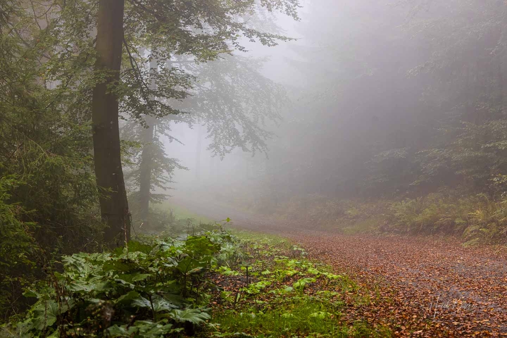 Beim Blick aus dem Fenster erschien das Wetter am gestrigen Tag zuerst wenig einladend. Dichter Nebel hing über dem Hohen Knochen, sowie dem nahe gelegenen Wesenberg und verschluckte die Bäume und angrenzenden Wiesen und Felder. Allerdings regnete es nicht, so dass ich doch noch die Gelegenheit nutzte und zu einer herbstlichen Motivjagd im Nebelwald aufbrach. Meine kleine Foto-Fahrradtour führte hinauf auf den Wesenberg. Hier gibt es noch schöne Buchenwälder, die zur Zeit von Tag zu Tag bunter werden. Noch dominiert das Grün an den Bäumen, doch langsam zeigen sich auch die herbstlichen Gelb- und Orangetöne.