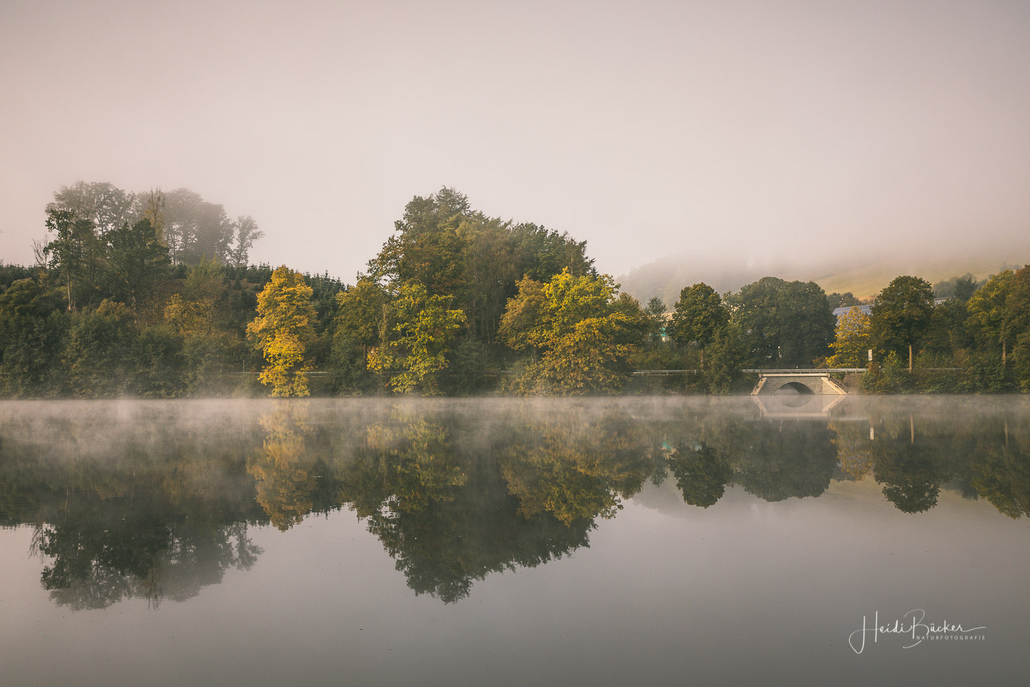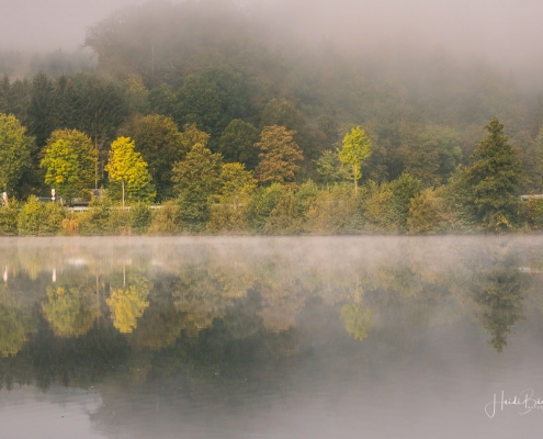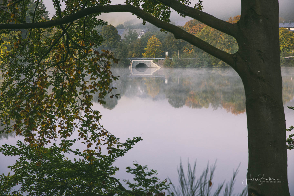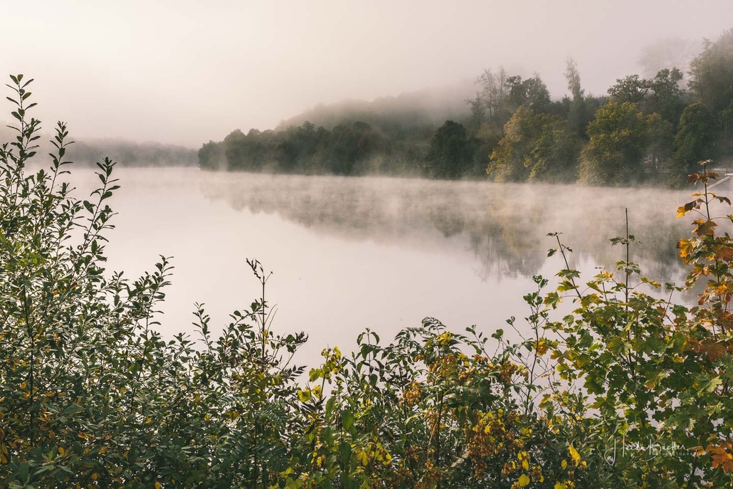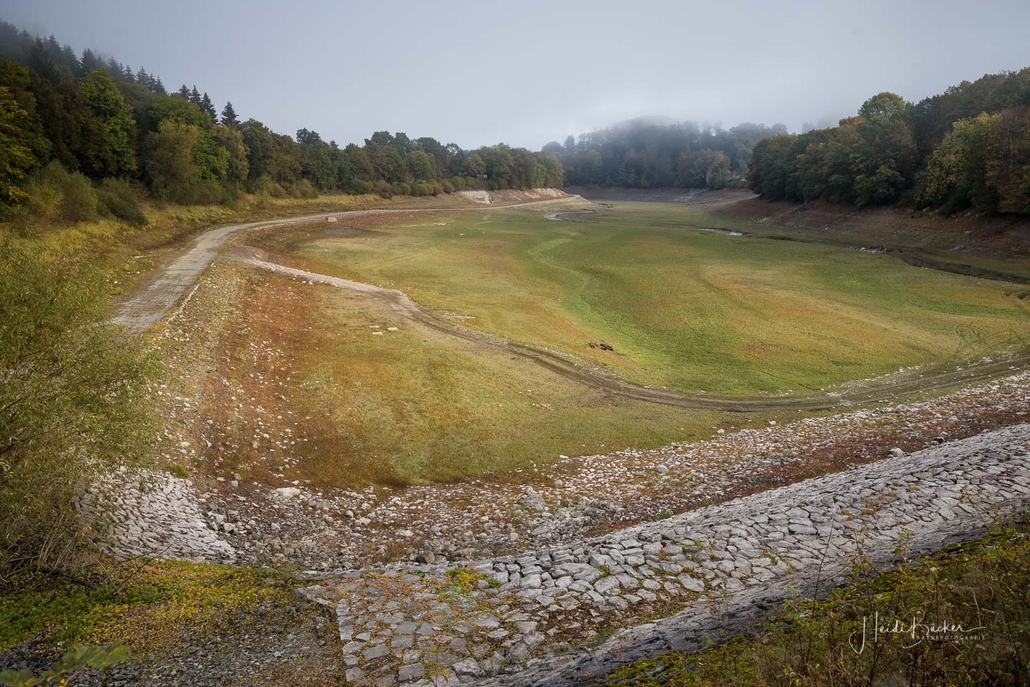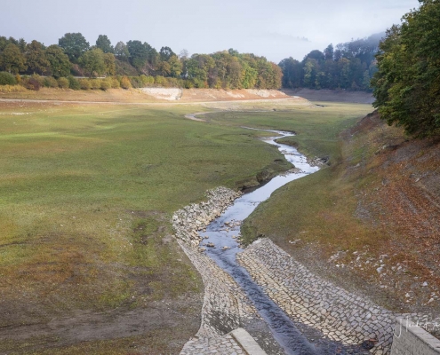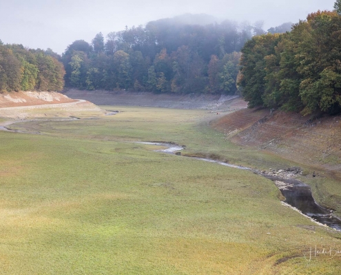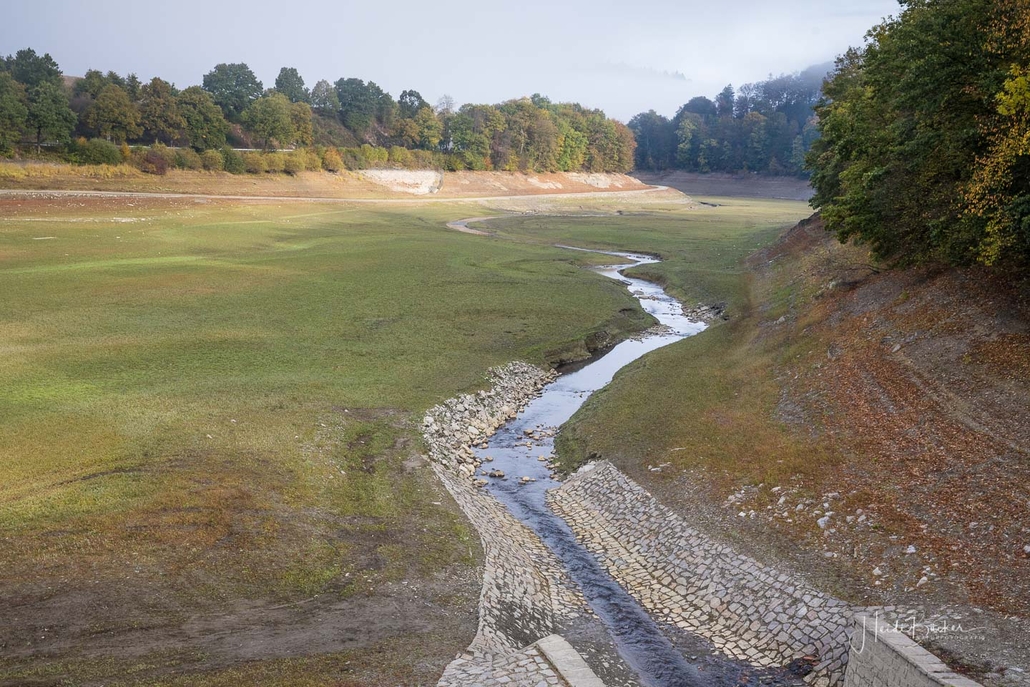 Im Herbst erlebt man oftmals an Seen mystische Morgenstimmungen. Der Nebel hält sich hartnäckig über der Wasseroberfläche und verdunstet nur langsam. Am vergangenen Dienstag konnte ich diese mystische Atmosphäre in Meschede-Mielinghausen am Hennesee-Vorstaubecken mit der Kamera einfangen. Auf der anderen Seite des Damms sah man allerdings kein Wasser, sondern nur die Henne „ohne See“, wie sie sich durch das leere Tal schlängelt. Aufgrund von Bauarbeiten am Hauptdamm wurde viel Wasser abgelassen.