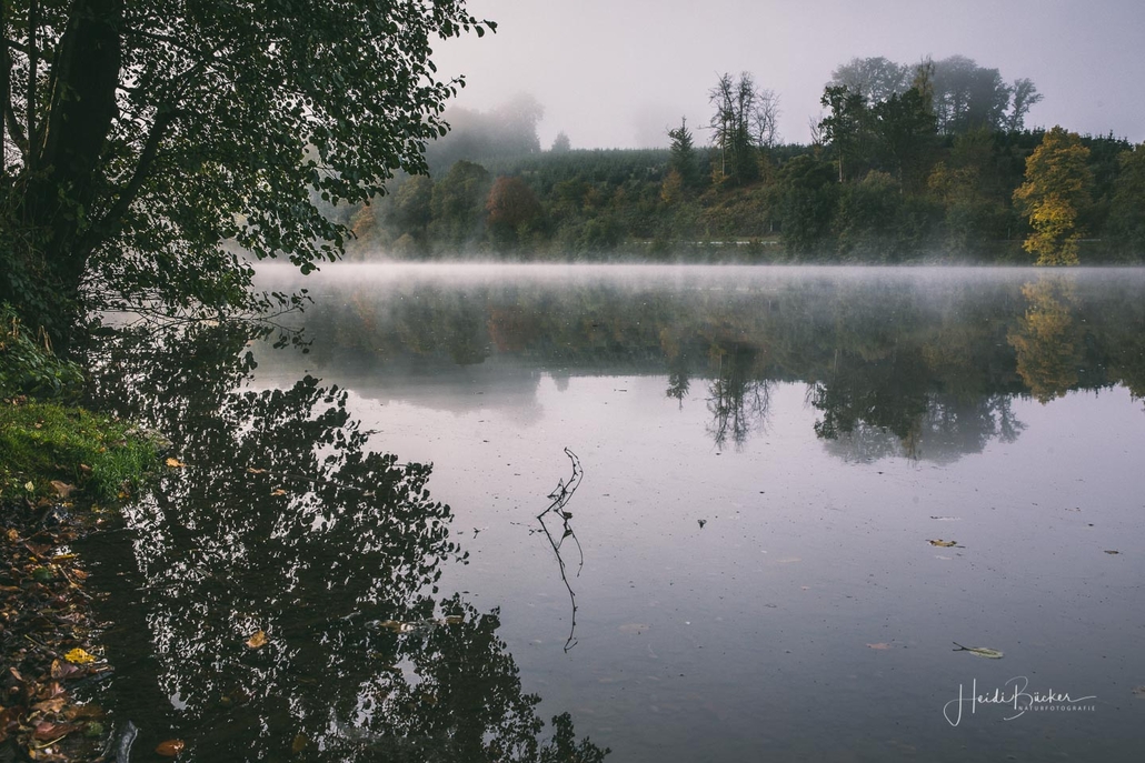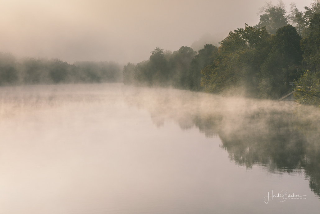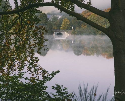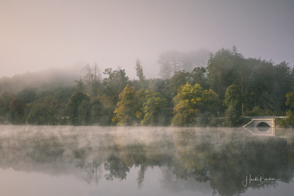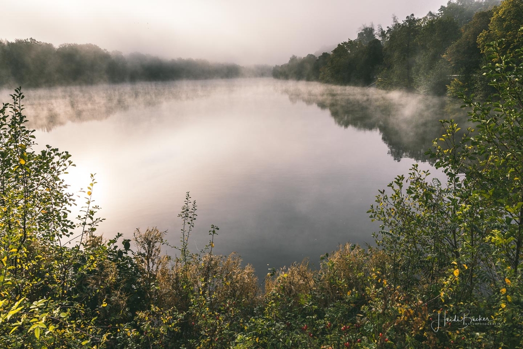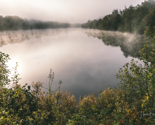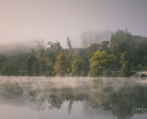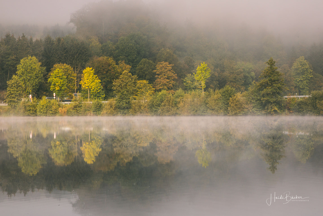 Im Herbst erlebt man oftmals an Seen mystische Morgenstimmungen. Der Nebel hält sich hartnäckig über der Wasseroberfläche und verdunstet nur langsam. Am vergangenen Dienstag konnte ich diese mystische Atmosphäre in Meschede-Mielinghausen am Hennesee-Vorstaubecken mit der Kamera einfangen. Auf der anderen Seite des Damms sah man allerdings kein Wasser, sondern nur die Henne „ohne See“, wie sie sich durch das leere Tal schlängelt. Aufgrund von Bauarbeiten am Hauptdamm wurde viel Wasser abgelassen.