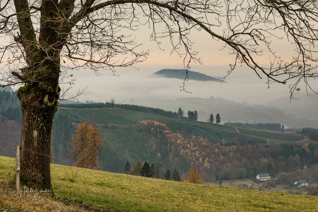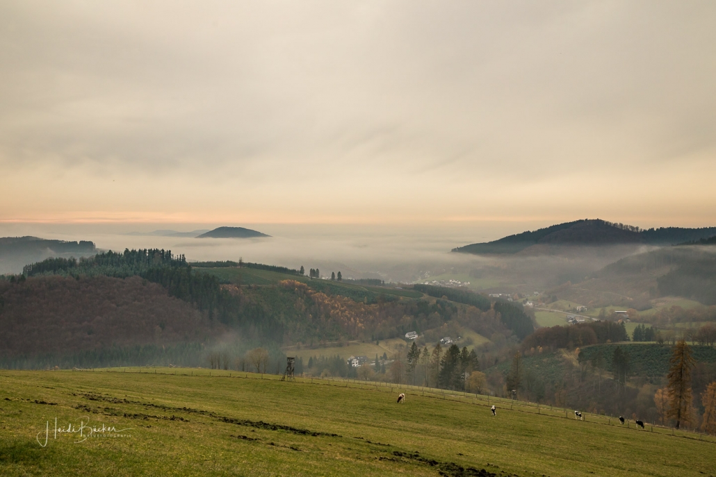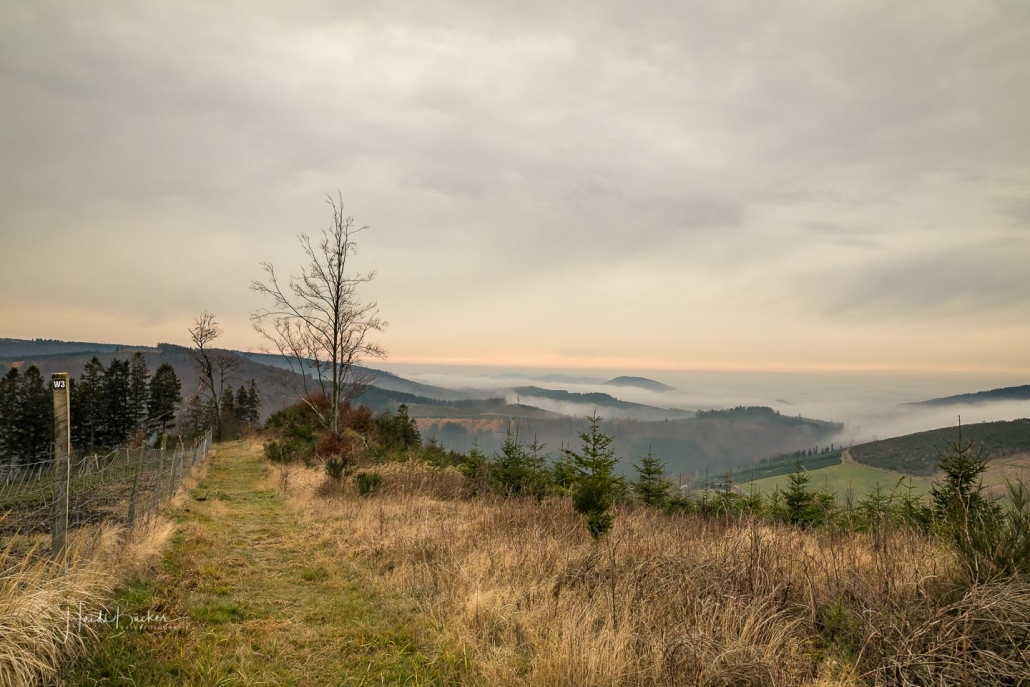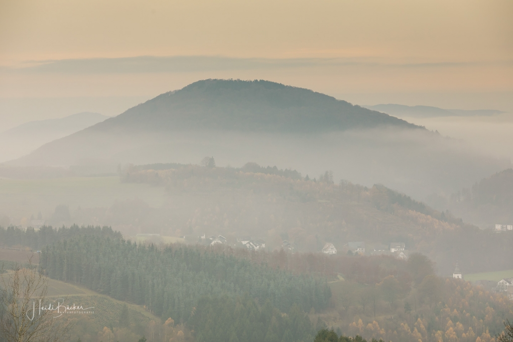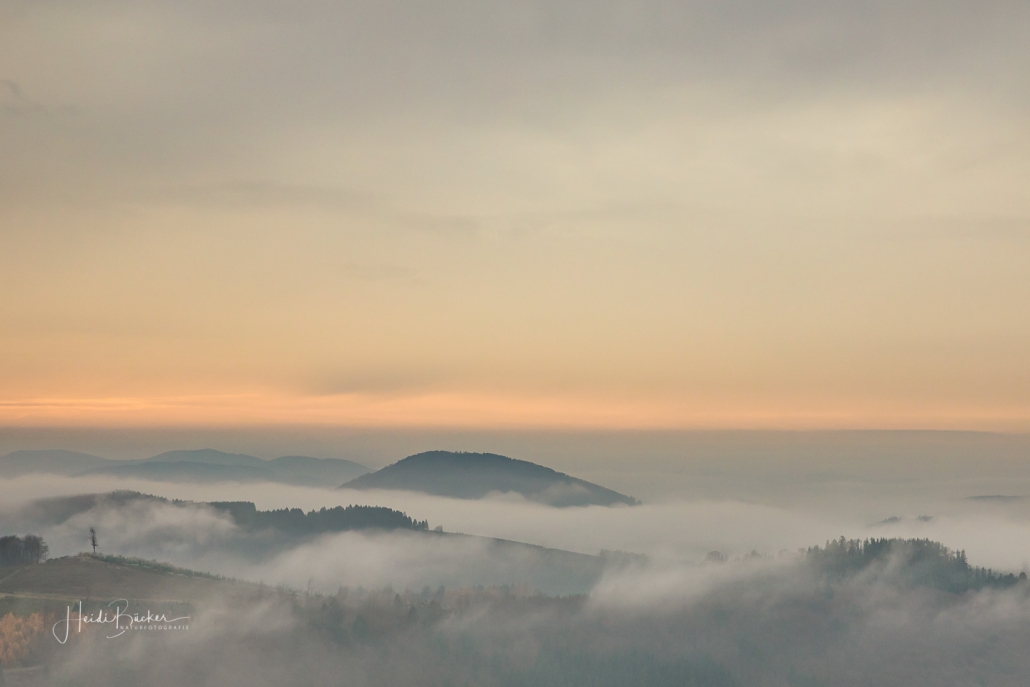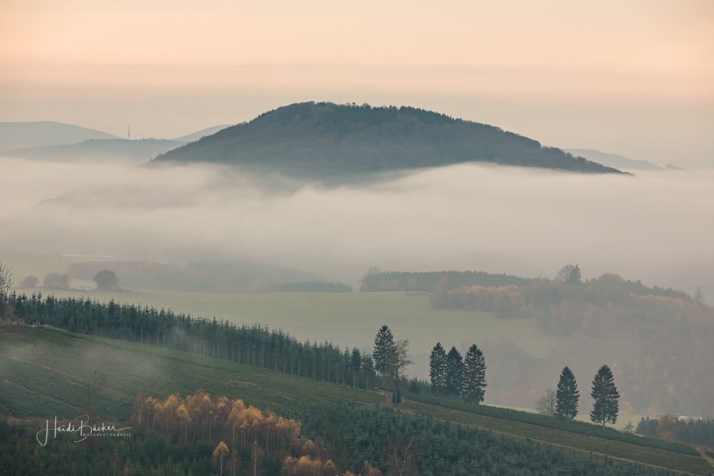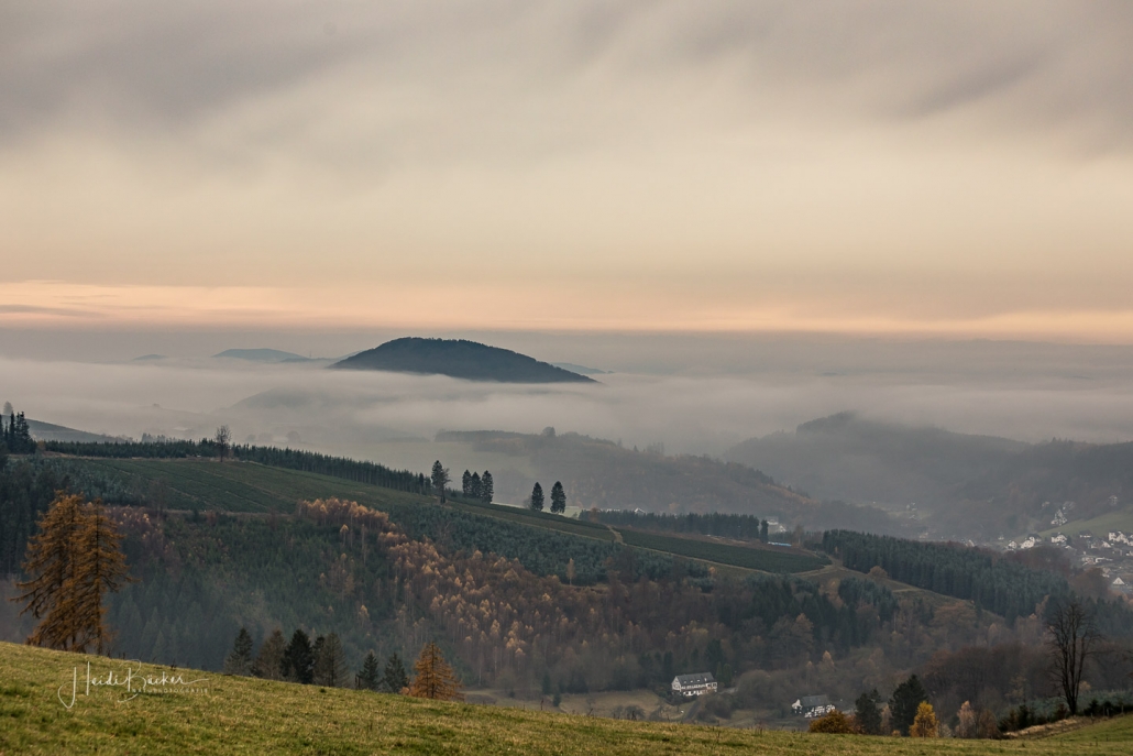 Der Herbst ist die Zeit der Inversionswetterlagen mit Nebel und Hochnebel und für mich jedes Jahr ein fotografisches Highlight. Heute bildete sich im Lennetal eine immer dichter werdende Nebeldecke, während es oben auf den Bergen noch klar war. Nur die Kuppe des Wilzenbergs ragte aus dem Nebel hervor.