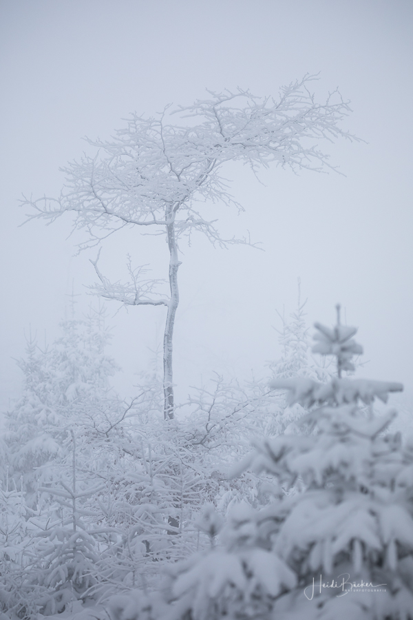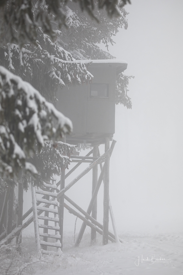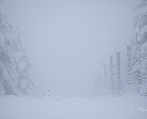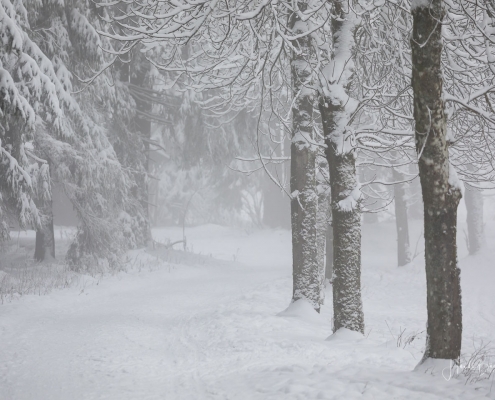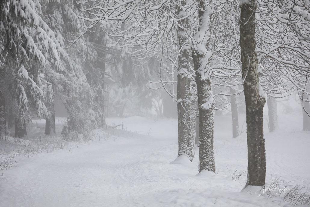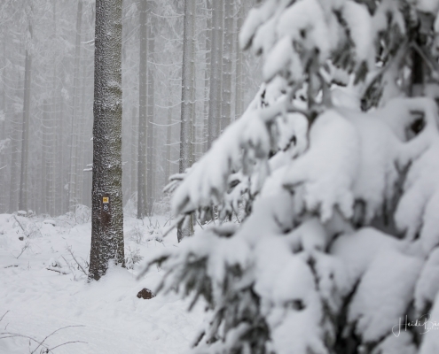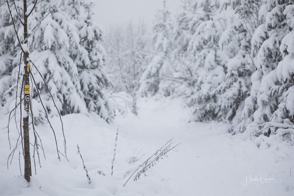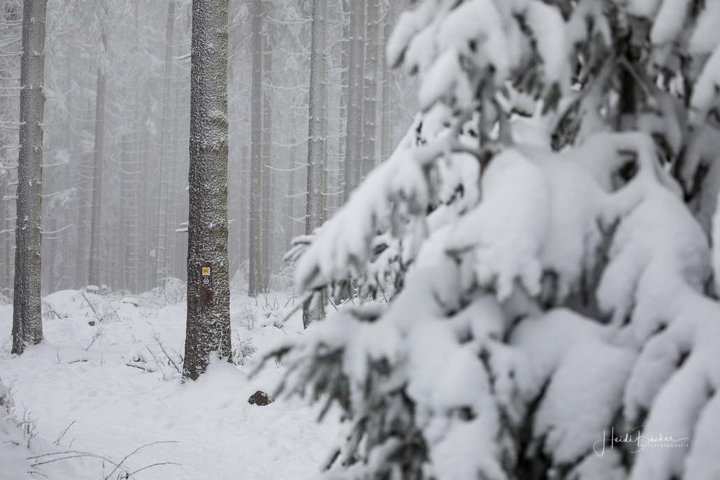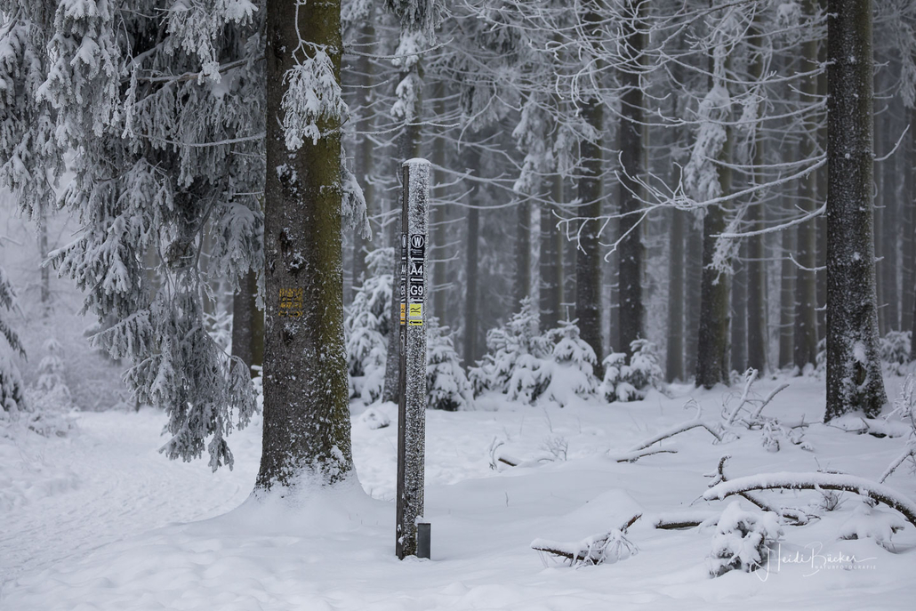 Tief winterlich präsentierten sich heute die Hochlagen des Sauerlandes. Die Wälder waren vom Nebel umhüllt und immer wieder gab es kurze Schneeschauer. Mystisch und etwas unheimlich erschien die Winterlandschaft auf dem Rothaarkamm. Von Weitem erkannte man nur die Silhouetten der wenigen Skilangläufer und Wanderer, die bei diesem usseligen Wetter draußen waren.