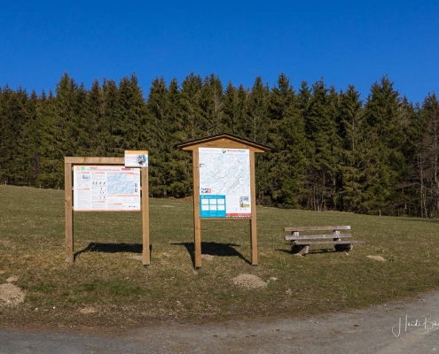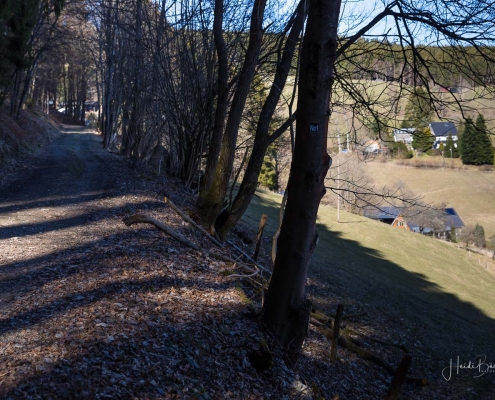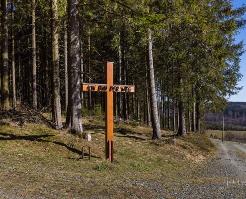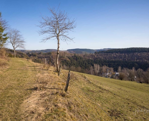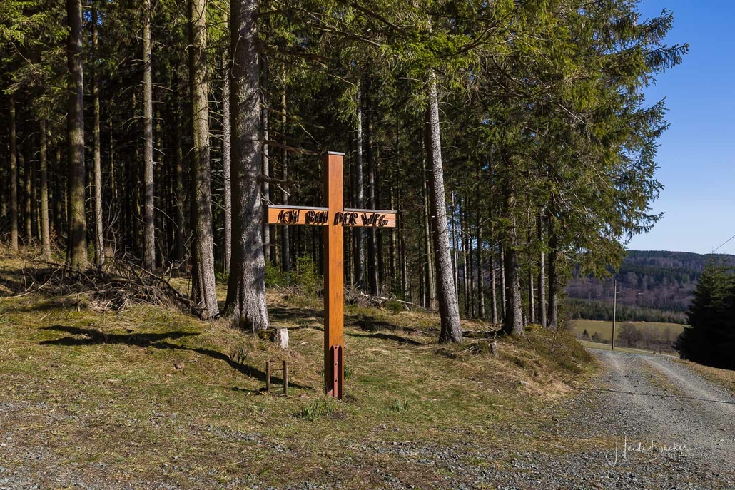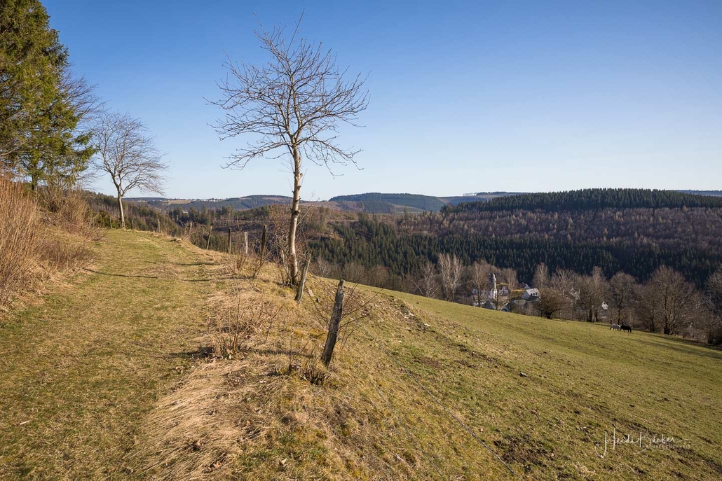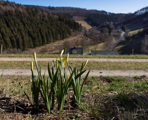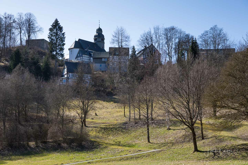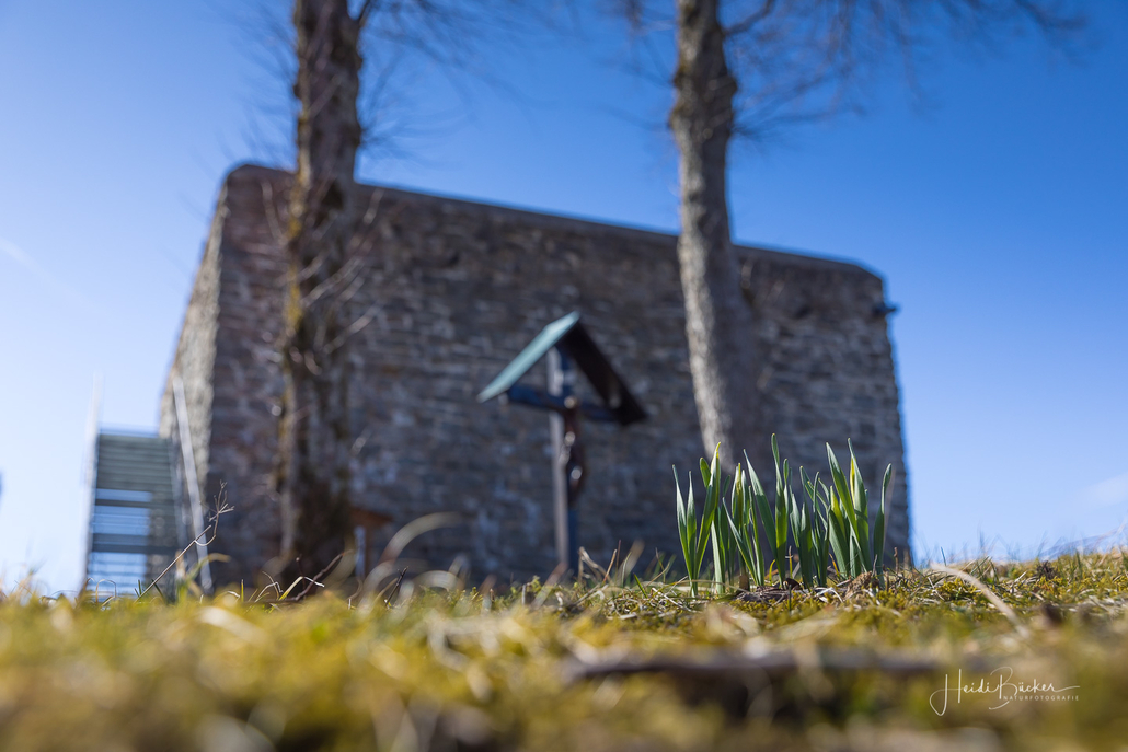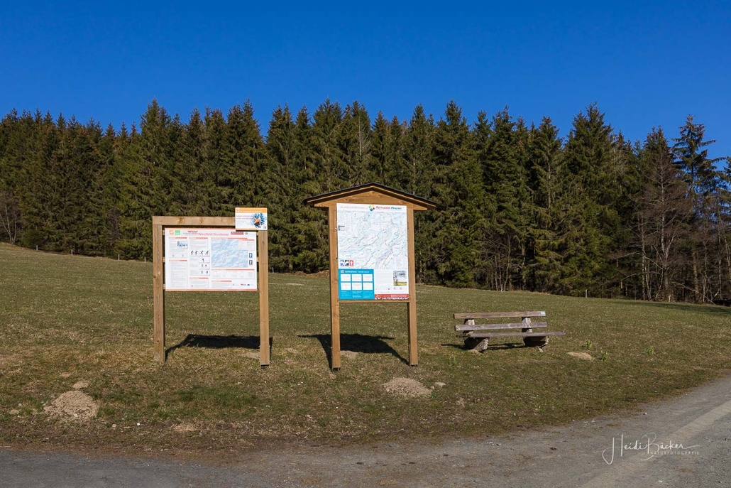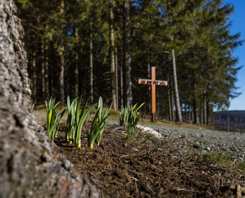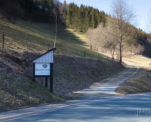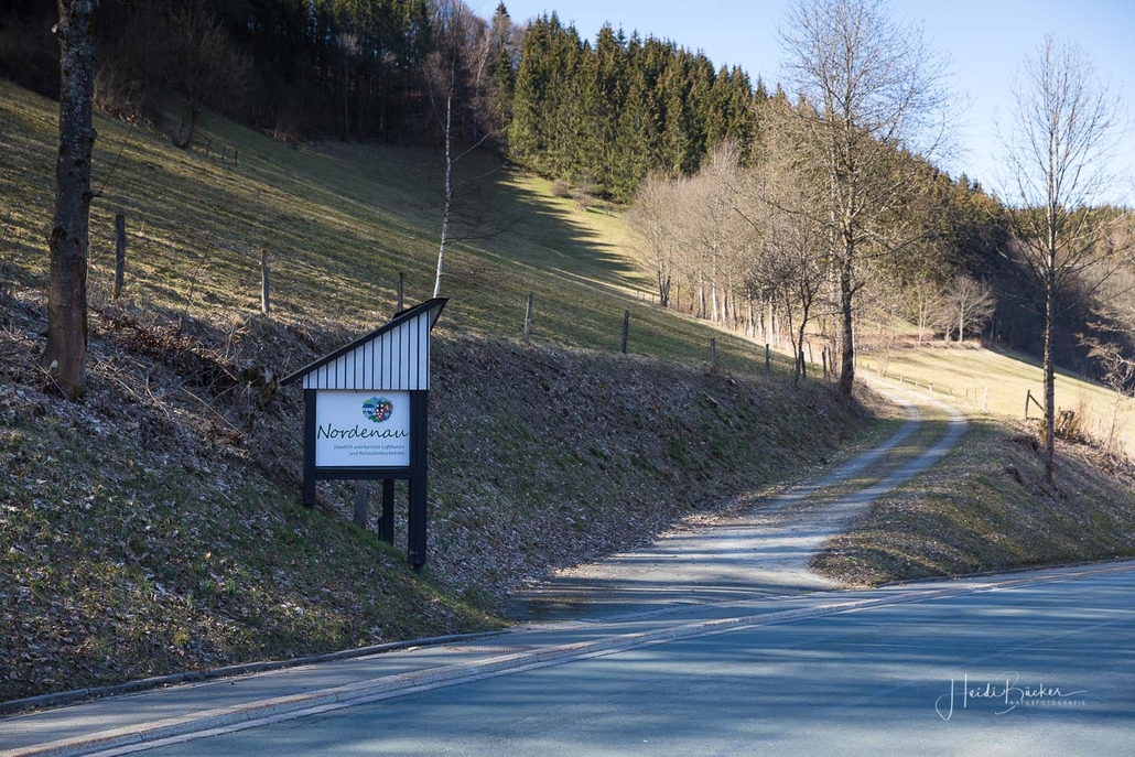 Vom Haus des Gastes geht es erstmal zur Dorfmitte und weiter über den Kirchplatz zur Burgruine Rappelstein. Auf dem Burgplateau leuchten bereits die ersten gelben Blümchen. Wer möchte, kann einen kurzen Abstecher auf die Aussichtsplattform der Ruine machen, um einen tollen Blick über Nordenau zu erhalten. Danach geht es hinunter in den Kurpark, vorbei an einem kleinen Ententeich und Hotel Tommes bis zur Kreisstraße. Diese überqueren wir und biegen auf der gegenüberliegenden Seite in den Grubenweg ein – der Weg heißt so, weil er die beiden ehemaligen Schiefergruben von Nordenau verbindet. Über den Grubenweg ( No1 ) geht es in das Nachbardörfchen Nesselbach. Mit schönen Ausblicken ins Nesselbachtal führt der Weg vorbei am Landgasthof Nesselbach bis zum Ingridkreuz. Neuerdings hat sich hier, durch die Abholzung des Waldes, eine vollkommen neue Sicht auf die Umgebung entwickelt.