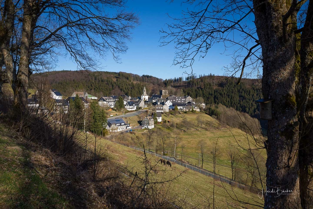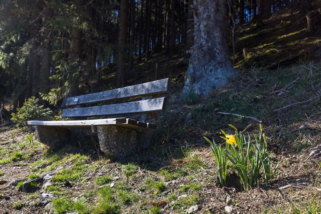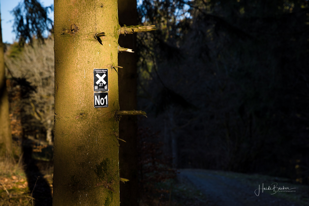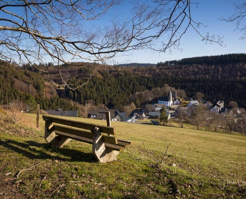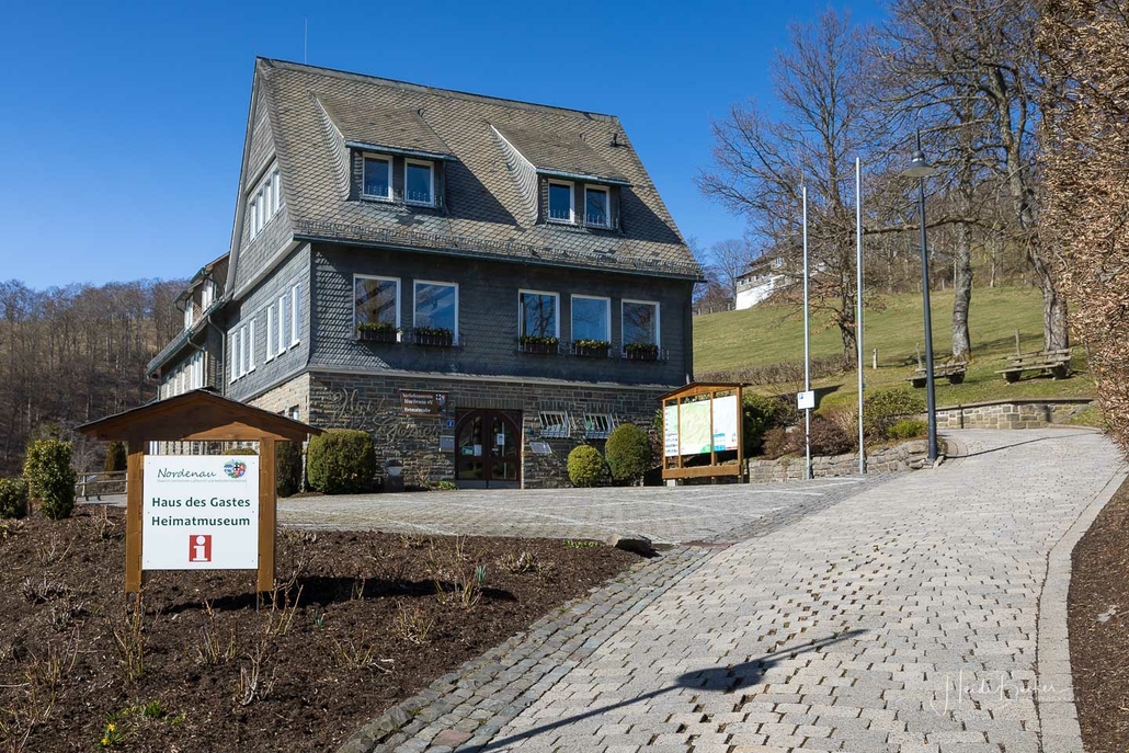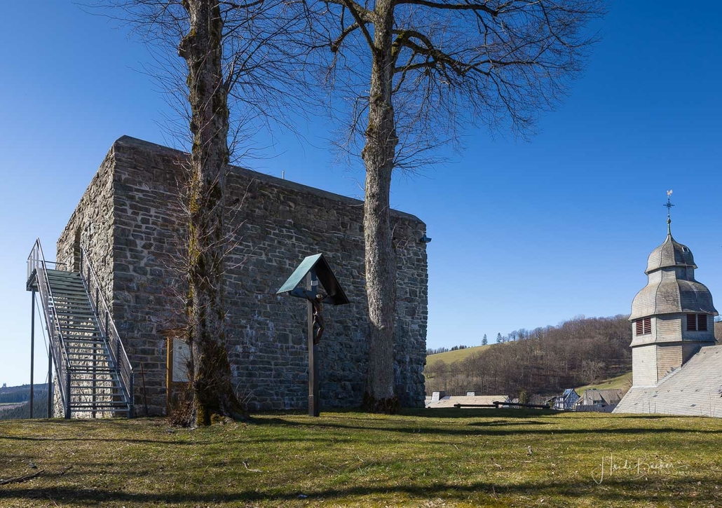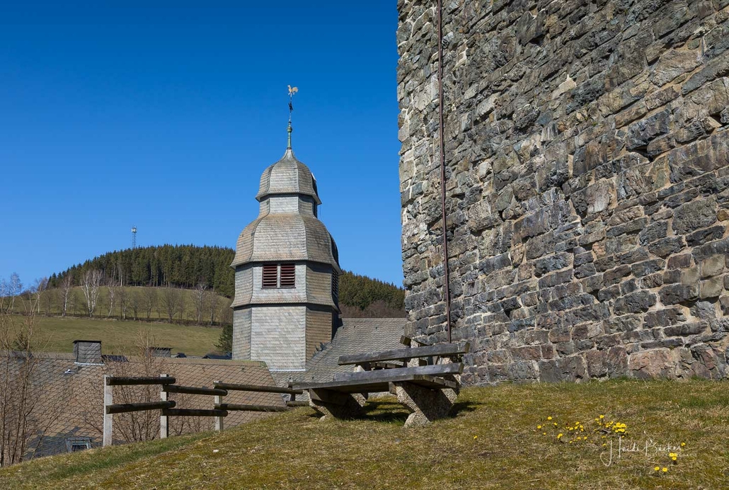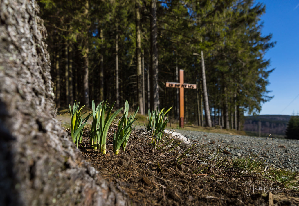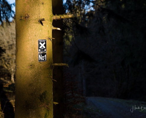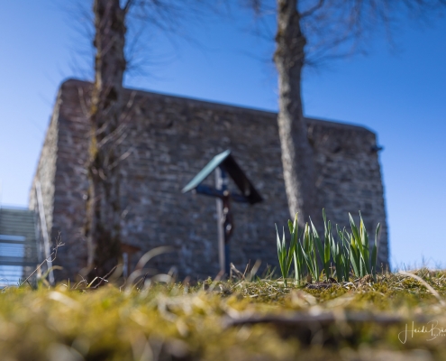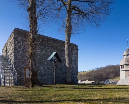 Vom Haus des Gastes geht es erstmal zur Dorfmitte und weiter über den Kirchplatz zur Burgruine Rappelstein. Auf dem Burgplateau leuchten bereits die ersten gelben Blümchen. Wer möchte, kann einen kurzen Abstecher auf die Aussichtsplattform der Ruine machen, um einen tollen Blick über Nordenau zu erhalten. Danach geht es hinunter in den Kurpark, vorbei an einem kleinen Ententeich und Hotel Tommes bis zur Kreisstraße. Diese überqueren wir und biegen auf der gegenüberliegenden Seite in den Grubenweg ein – der Weg heißt so, weil er die beiden ehemaligen Schiefergruben von Nordenau verbindet. Über den Grubenweg ( No1 ) geht es in das Nachbardörfchen Nesselbach. Mit schönen Ausblicken ins Nesselbachtal führt der Weg vorbei am Landgasthof Nesselbach bis zum Ingridkreuz. Neuerdings hat sich hier, durch die Abholzung des Waldes, eine vollkommen neue Sicht auf die Umgebung entwickelt.