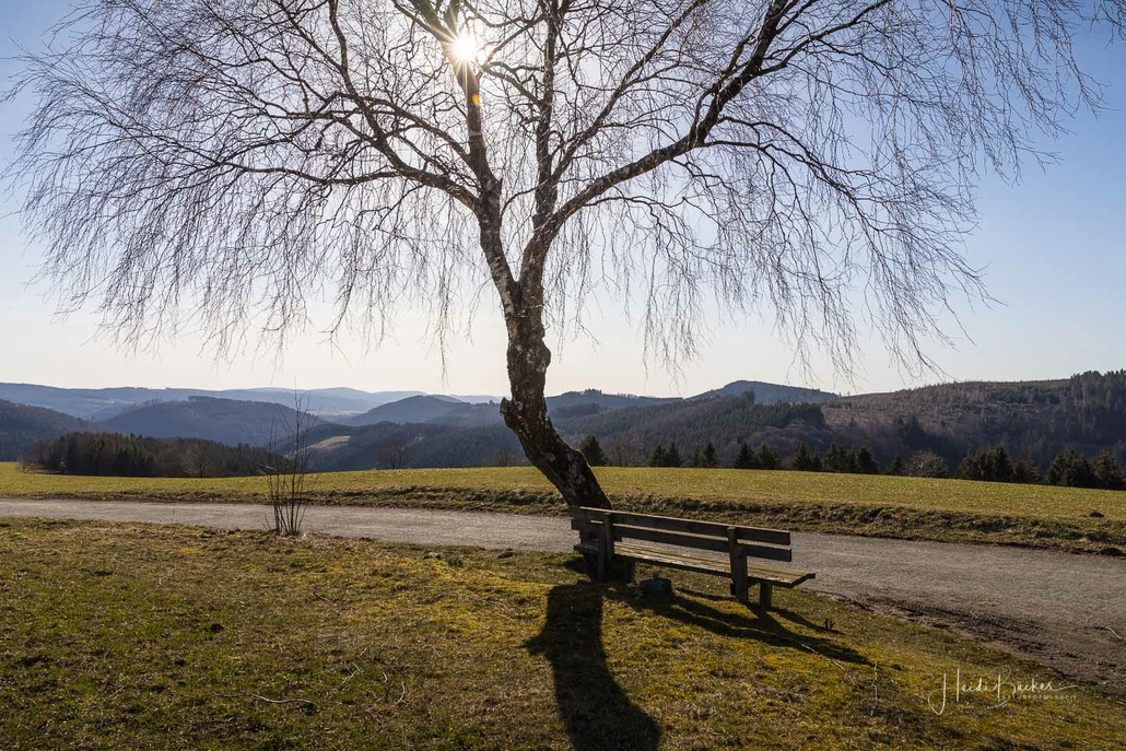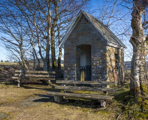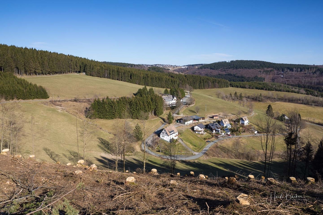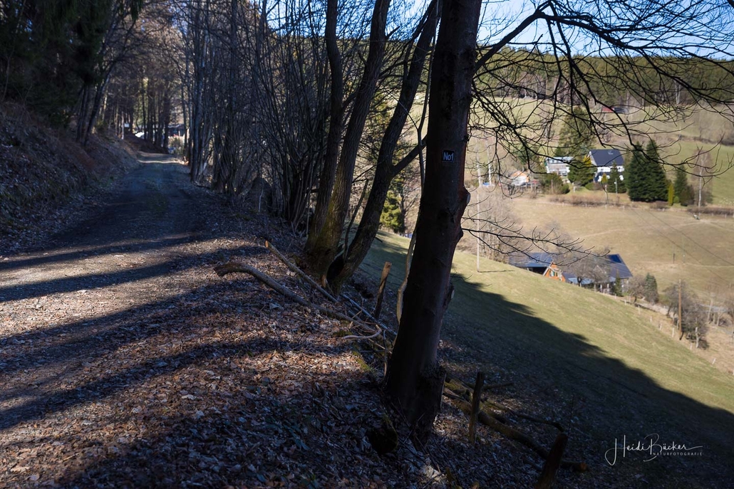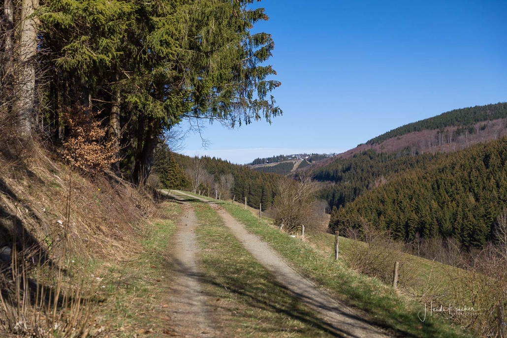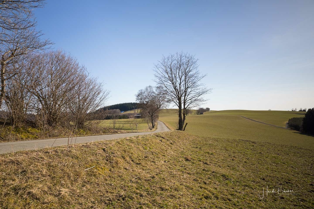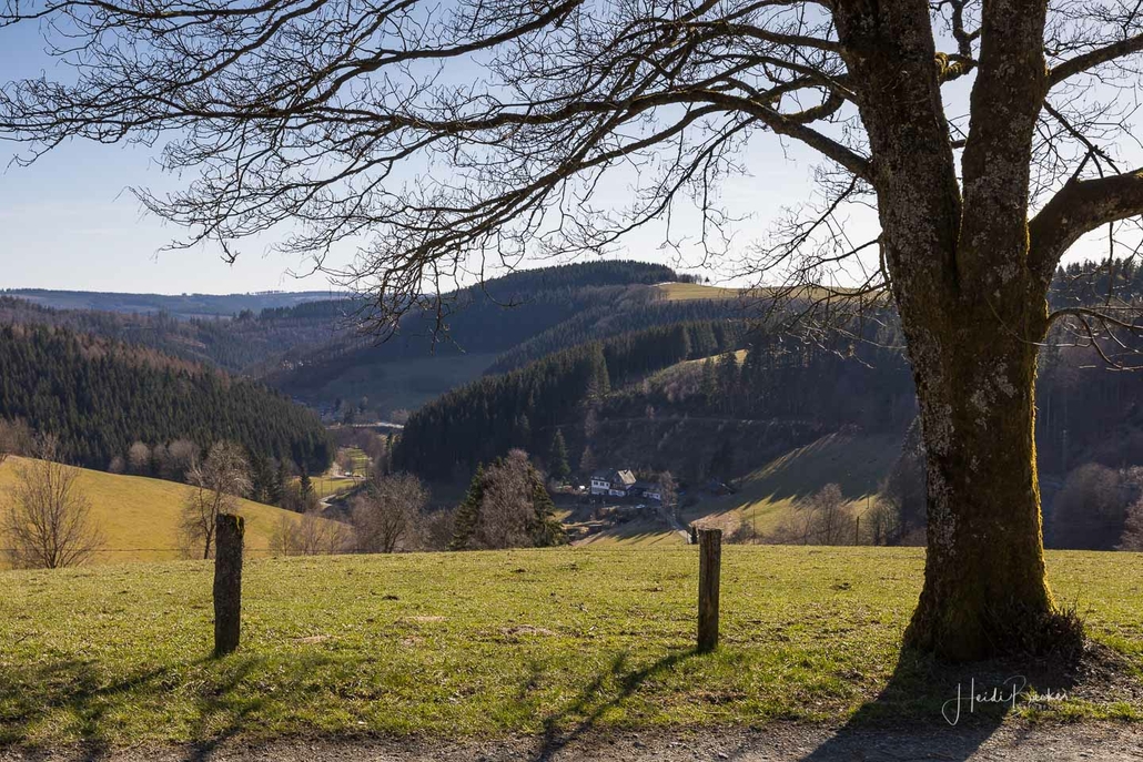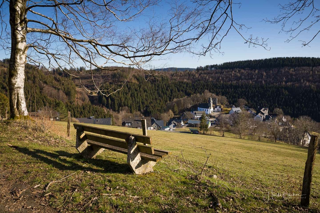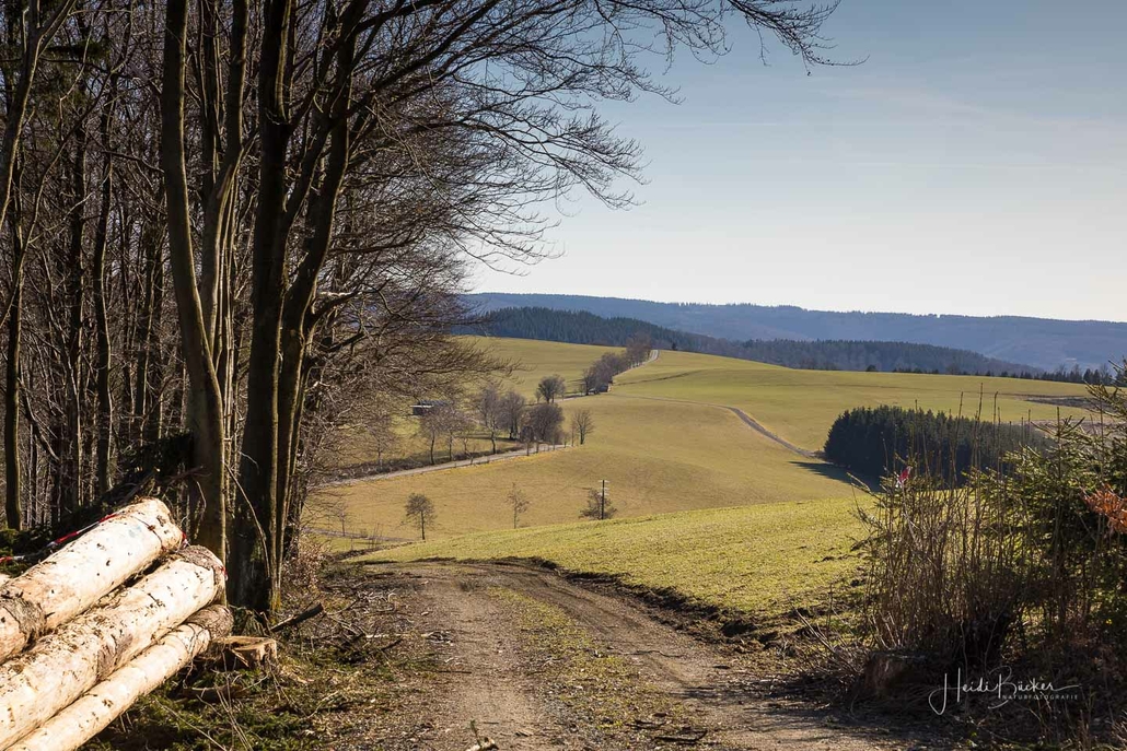 Vom Haus des Gastes geht es erstmal zur Dorfmitte und weiter über den Kirchplatz zur Burgruine Rappelstein. Auf dem Burgplateau leuchten bereits die ersten gelben Blümchen. Wer möchte, kann einen kurzen Abstecher auf die Aussichtsplattform der Ruine machen, um einen tollen Blick über Nordenau zu erhalten. Danach geht es hinunter in den Kurpark, vorbei an einem kleinen Ententeich und Hotel Tommes bis zur Kreisstraße. Diese überqueren wir und biegen auf der gegenüberliegenden Seite in den Grubenweg ein – der Weg heißt so, weil er die beiden ehemaligen Schiefergruben von Nordenau verbindet. Über den Grubenweg ( No1 ) geht es in das Nachbardörfchen Nesselbach. Mit schönen Ausblicken ins Nesselbachtal führt der Weg vorbei am Landgasthof Nesselbach bis zum Ingridkreuz. Neuerdings hat sich hier, durch die Abholzung des Waldes, eine vollkommen neue Sicht auf die Umgebung entwickelt.