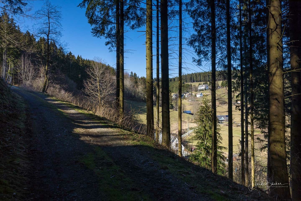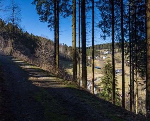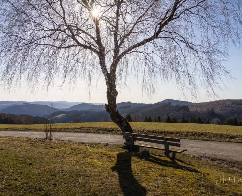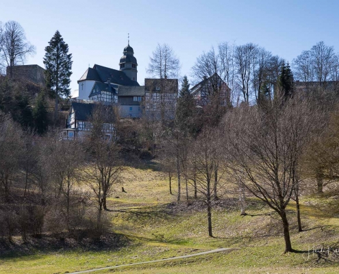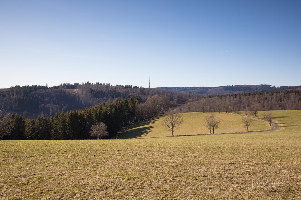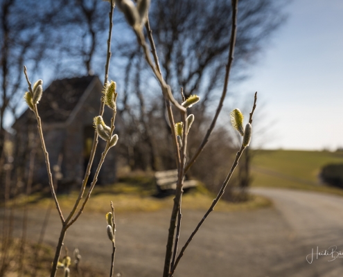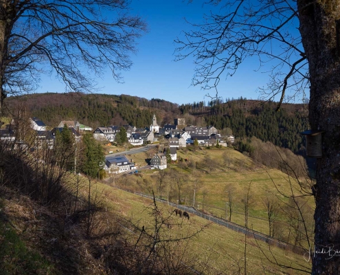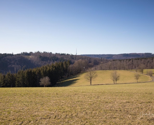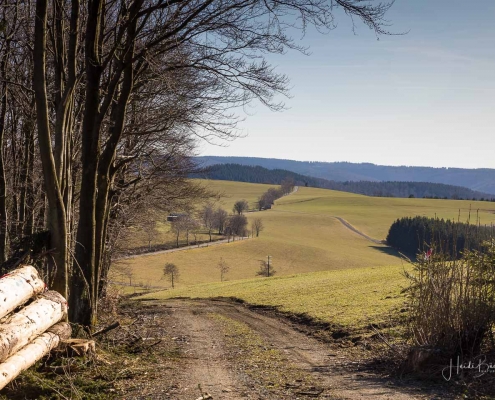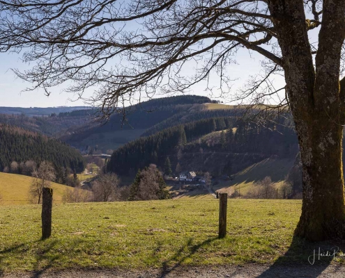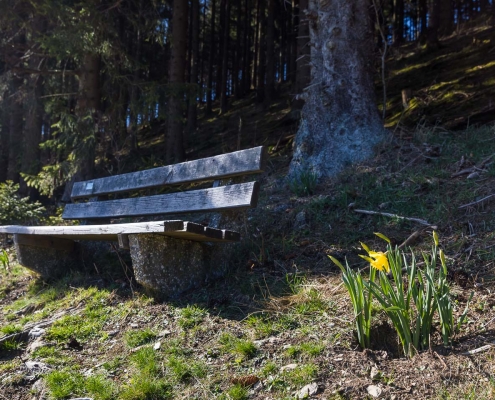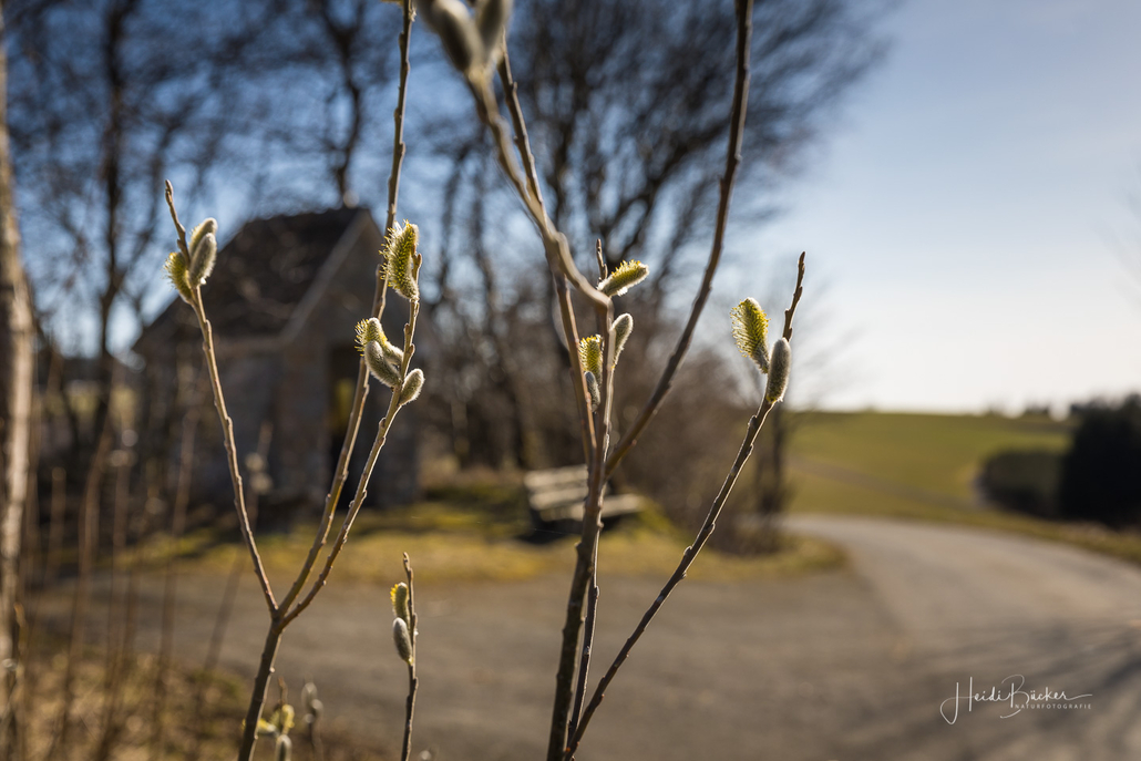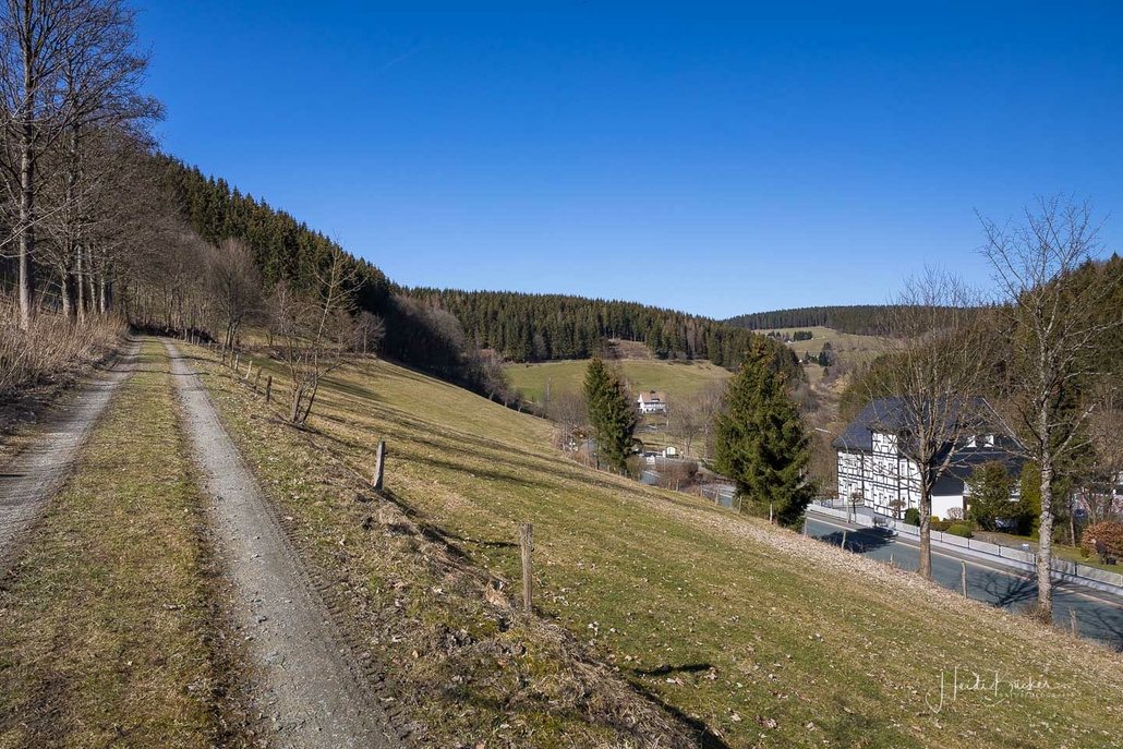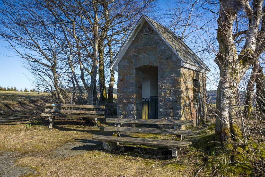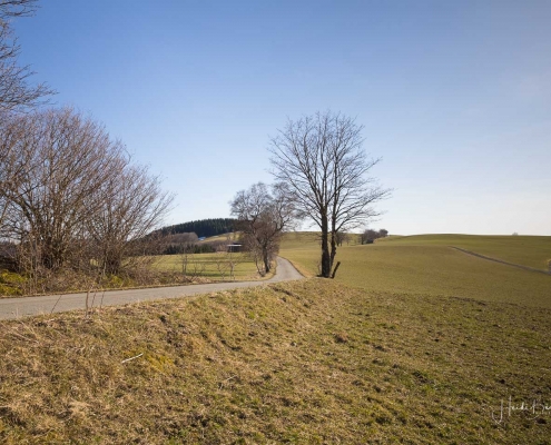 Vom Haus des Gastes geht es erstmal zur Dorfmitte und weiter über den Kirchplatz zur Burgruine Rappelstein. Auf dem Burgplateau leuchten bereits die ersten gelben Blümchen. Wer möchte, kann einen kurzen Abstecher auf die Aussichtsplattform der Ruine machen, um einen tollen Blick über Nordenau zu erhalten. Danach geht es hinunter in den Kurpark, vorbei an einem kleinen Ententeich und Hotel Tommes bis zur Kreisstraße. Diese überqueren wir und biegen auf der gegenüberliegenden Seite in den Grubenweg ein – der Weg heißt so, weil er die beiden ehemaligen Schiefergruben von Nordenau verbindet. Über den Grubenweg ( No1 ) geht es in das Nachbardörfchen Nesselbach. Mit schönen Ausblicken ins Nesselbachtal führt der Weg vorbei am Landgasthof Nesselbach bis zum Ingridkreuz. Neuerdings hat sich hier, durch die Abholzung des Waldes, eine vollkommen neue Sicht auf die Umgebung entwickelt.
