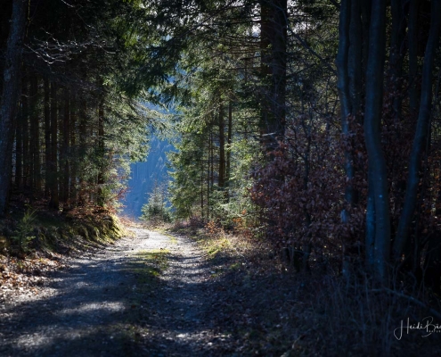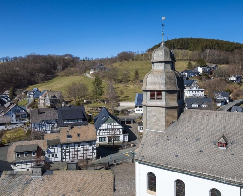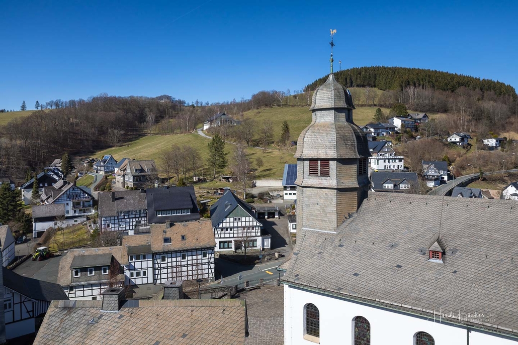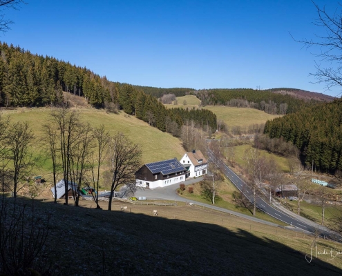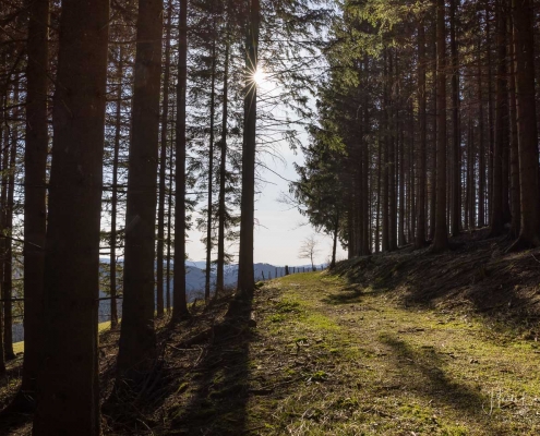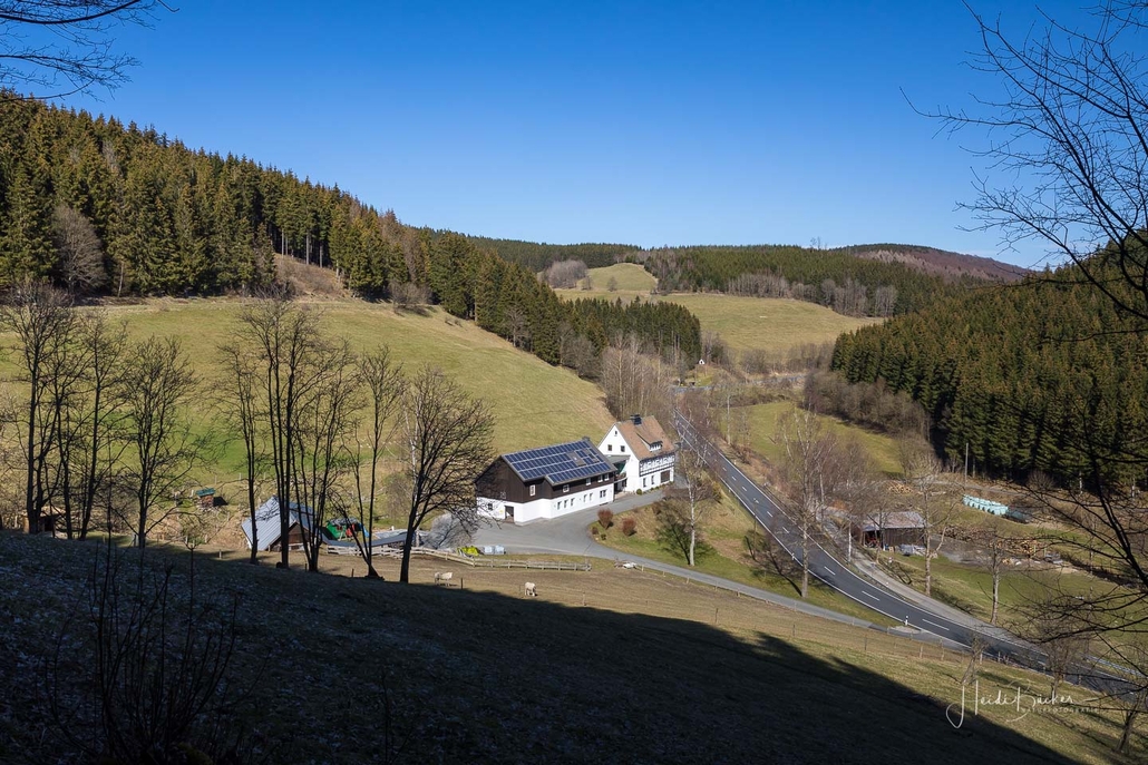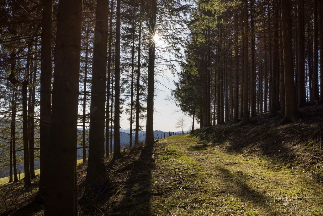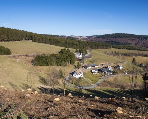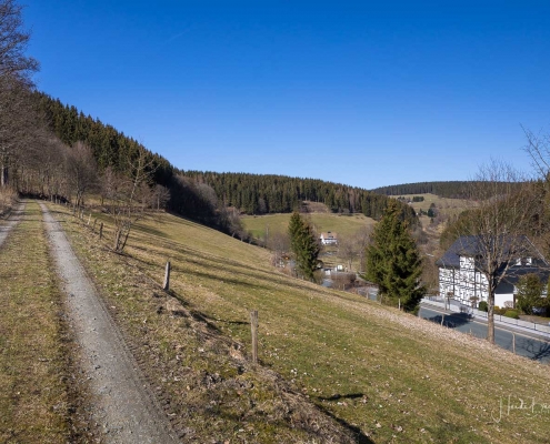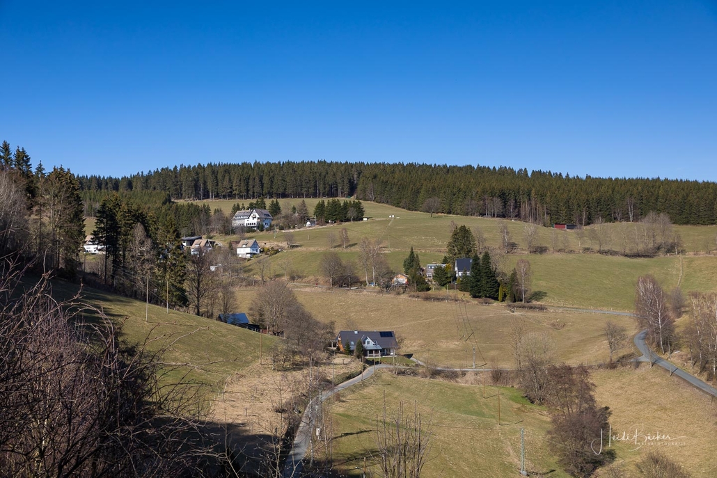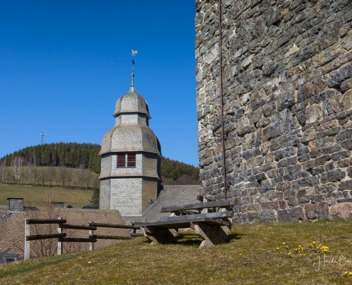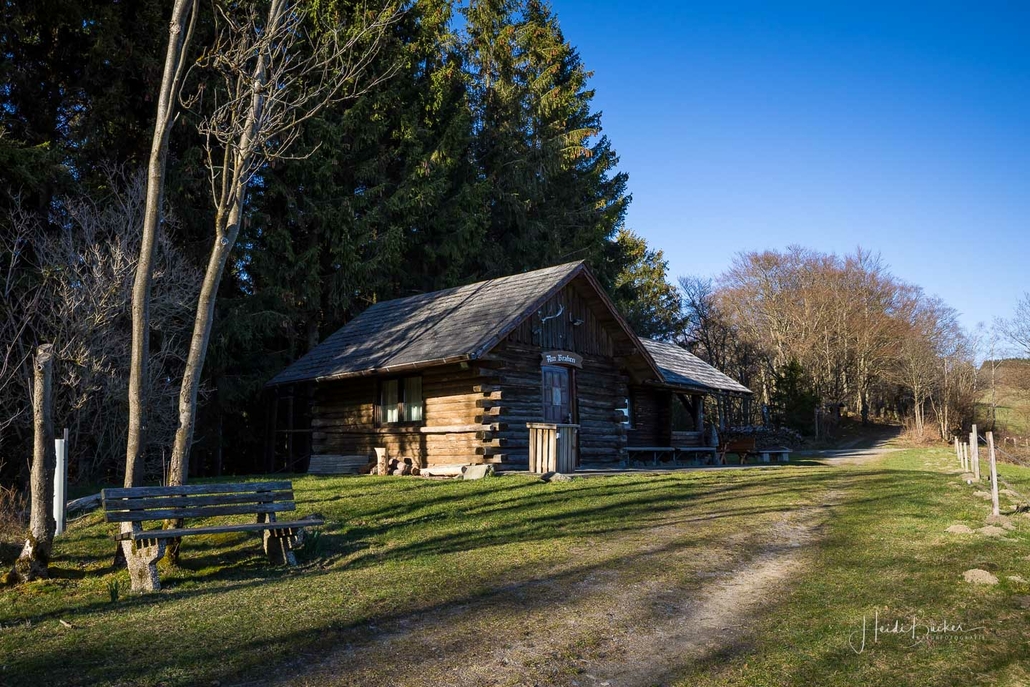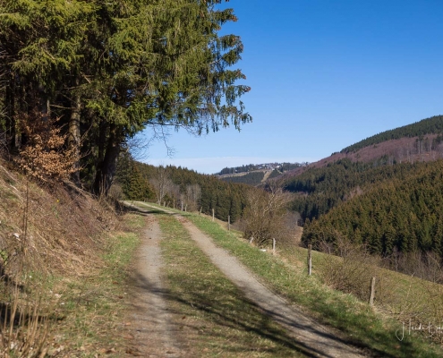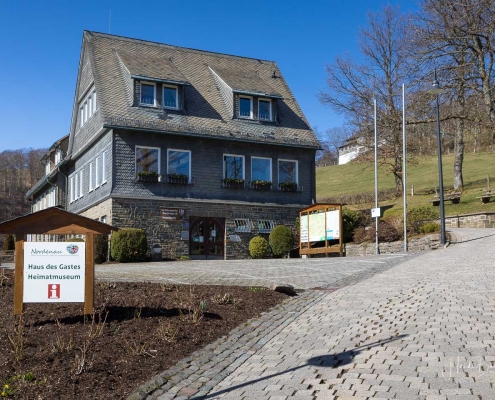 Vom Haus des Gastes geht es erstmal zur Dorfmitte und weiter über den Kirchplatz zur Burgruine Rappelstein. Auf dem Burgplateau leuchten bereits die ersten gelben Blümchen. Wer möchte, kann einen kurzen Abstecher auf die Aussichtsplattform der Ruine machen, um einen tollen Blick über Nordenau zu erhalten. Danach geht es hinunter in den Kurpark, vorbei an einem kleinen Ententeich und Hotel Tommes bis zur Kreisstraße. Diese überqueren wir und biegen auf der gegenüberliegenden Seite in den Grubenweg ein – der Weg heißt so, weil er die beiden ehemaligen Schiefergruben von Nordenau verbindet. Über den Grubenweg ( No1 ) geht es in das Nachbardörfchen Nesselbach. Mit schönen Ausblicken ins Nesselbachtal führt der Weg vorbei am Landgasthof Nesselbach bis zum Ingridkreuz. Neuerdings hat sich hier, durch die Abholzung des Waldes, eine vollkommen neue Sicht auf die Umgebung entwickelt.
