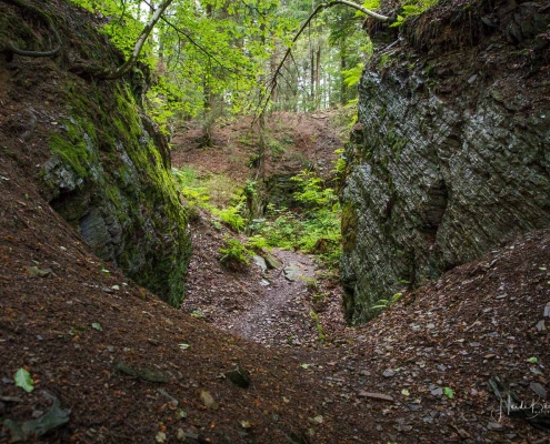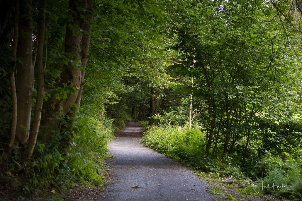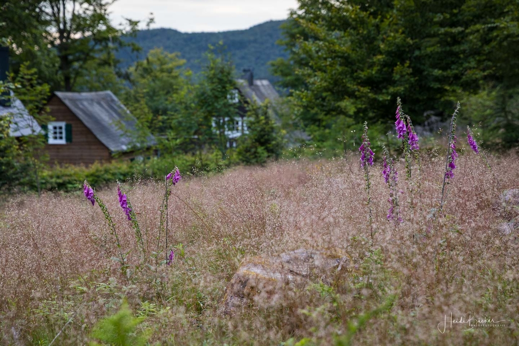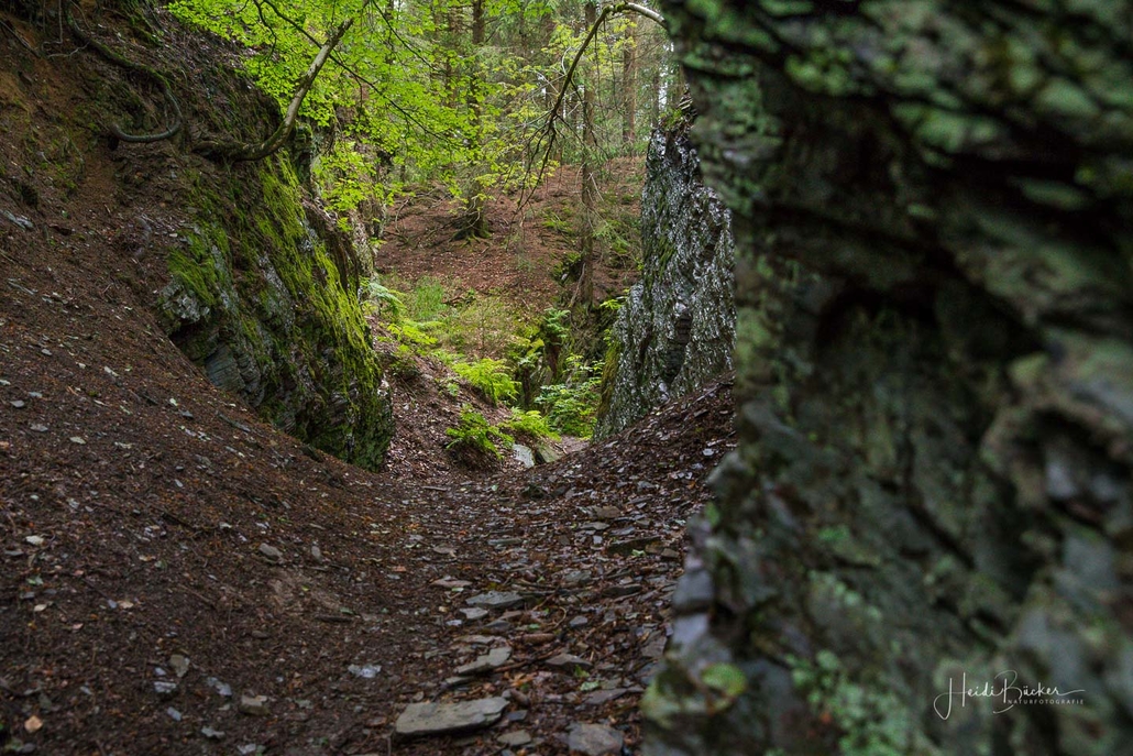 Von der Wandertafel geht es einen schmalen Pfad bergan zum Grillplatz der SGV-Abteilung des Ortes und weiter über den Talwanderweg nach Ohlenbach. Wir folgen hierbei der typischen Wegmarkierung „weißes liegendes R auf schwarzem Grund“, die sehr übersichtlich angebracht wurde, so dass keine Wanderkarte nötig ist. Von Ohlenbach führt der Steig über einen schmalen Pfad ins Tal des Schwarzen-Siepen, einem Naturschutzgebiet. Dort überqueren wir die neue Steigbrücke, die ein kleines Biotop überspannt. Anschließend geht es leicht bergan durch eine Kyrillfläche und über einen Pirschpfad zu den Jagdhütten.