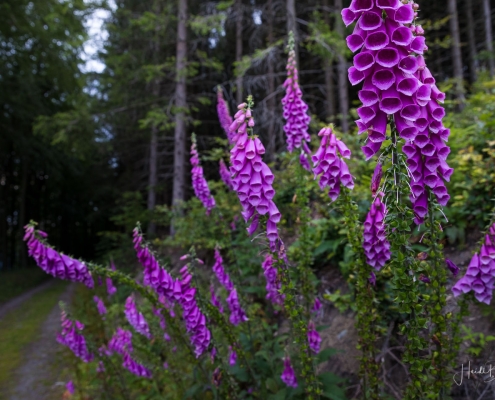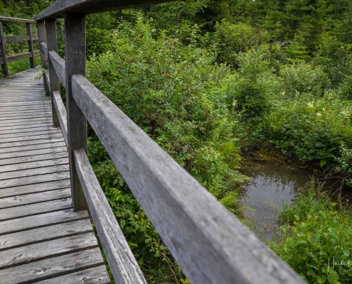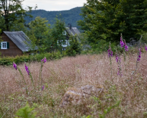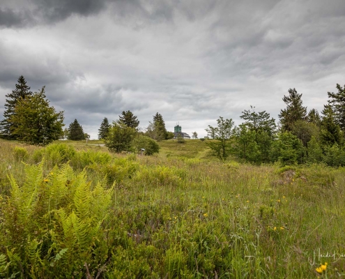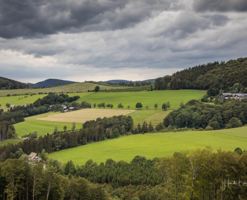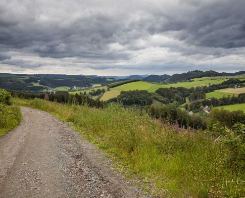 In halber Höhe zweigt der Weg hinter den Fischteichen ab in Richtung Hoher Knochen. Durch hohen Fichten- und Buchenwald geht es der Knochenspitze entgegen. Oben angekommen, bietet sich uns wieder ein herrlicher Ausblick über die Weiten des Schmallenberger Sauerlandes und auf den Rothaarkamm mit seinen Höhendörfern. Von hier geht es später über einen schmalen Pfad und einen Waldweg bergab zum Hotel Hoher Knochen mit St.Elisabeth Kapelle und weiter in Richtung Westfeld. Am Hömberg eröffnet sich uns nochmal ein wunderbarer Blick auf das Bundesgolddorf Westfeld, bevor es über einen schmalen Wurzelpfad, vorbei am Skilanglaufzentrum zurück zum Wanderportal geht.
