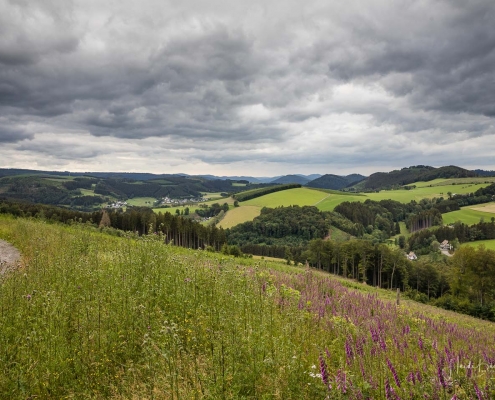 Ein alter Hohlweg (X27) führt uns nun steil den Berg hinauf, an einem kleinen Steinbruch – der Bärenschlucht – vorbei, bis zum Astenplateau, wo uns eine traumhafte Aussicht ins Land der 1000 Berge und manchmal sogar bis zum Brocken und Feldberg erwartet. Wir durchqueren die Hochheide, die im Herbst einige Wochen von einer Herde Heidschnucken beweidet wird, besichtigen den Astenturm und wandern dann an der Lennequelle vorbei, zurück ins Lennetal.
