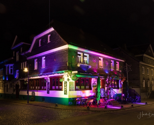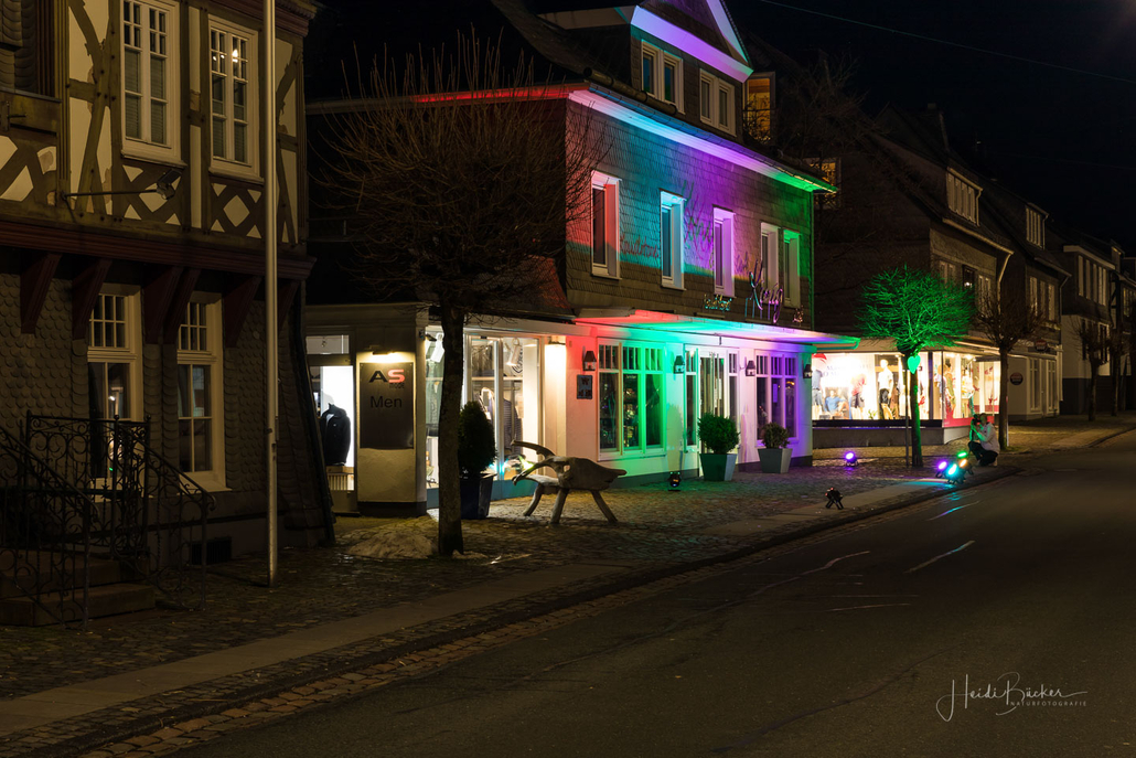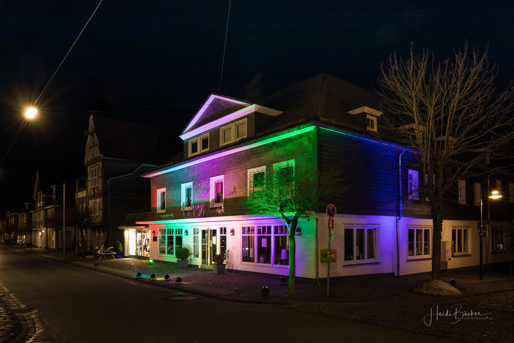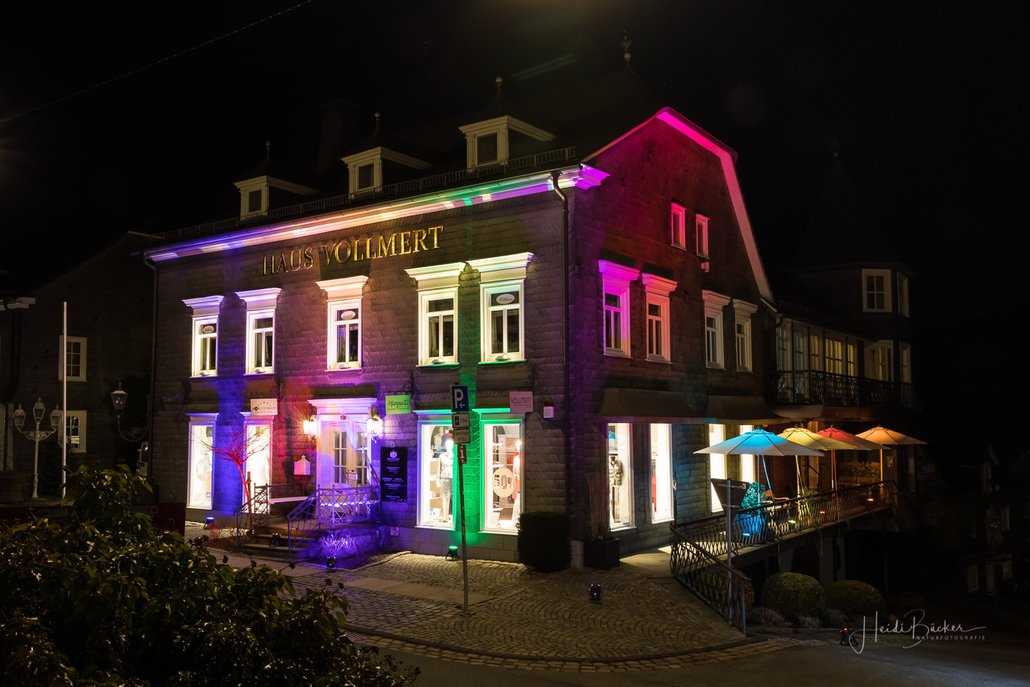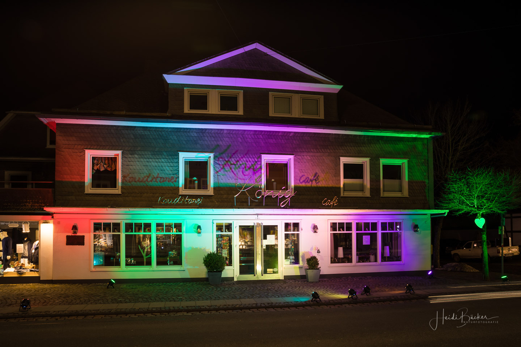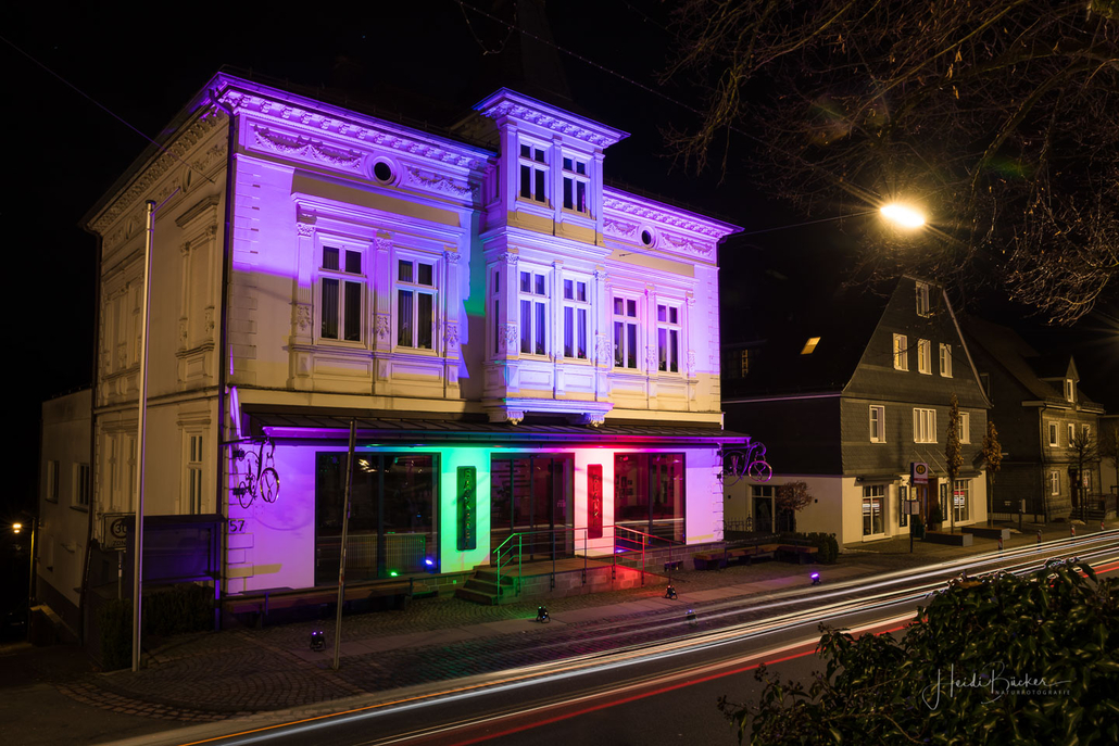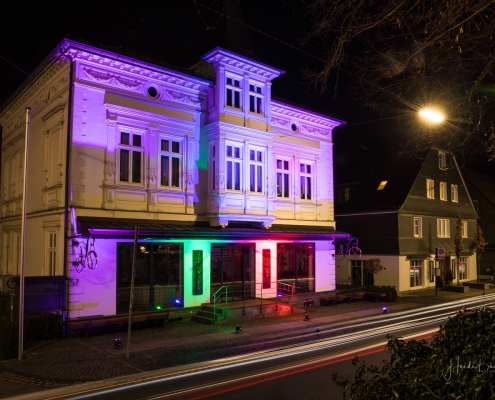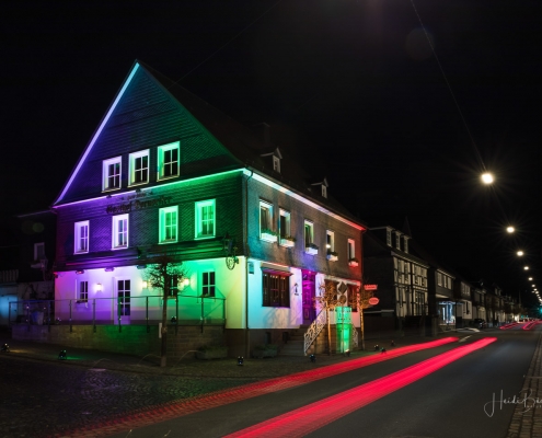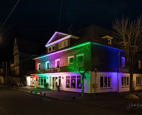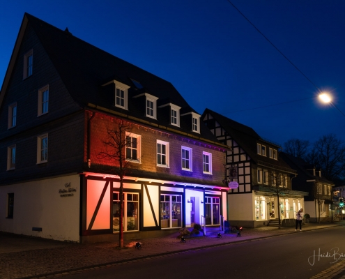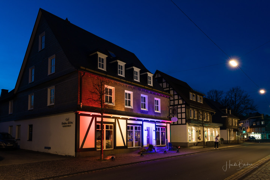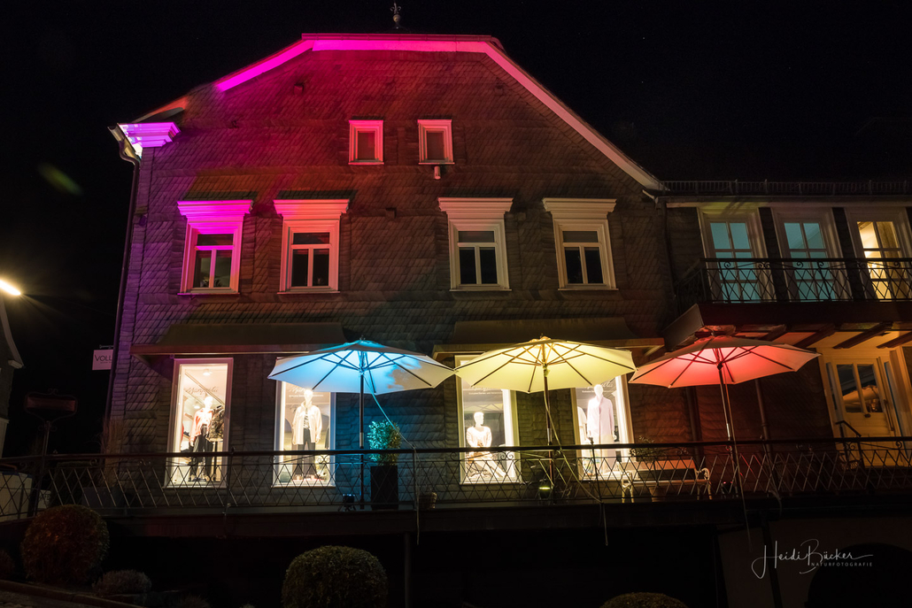 Gestern durfte ich, gemeinsam mit meinem Fotografen-Kollegen Stefan Schwope, den Verkehrsverein Schmallenberg e.V. und den WDR mit der Kamera bei einem Rundgang durch die Stadt Schmallenberg begleiten. Anlass war eine Aktion, die auf die prekäre Lage der Hotels und Gaststätten aufmerksam machen sollte. Dazu wurden einzelne Häuser bunt illuminiert. Schaute man durch die Fenster, war es dunkel, doch von Außen erstrahlten die Gebäude in bunten Farben und sahen sehr einladend aus. Die Idee kam von Mitgliedern des Schmallenberger Verkehrsvereins und von Fotograf Stefan Schwope, die bereits vor wenigen Wochen verschiedene Orte rund um Schmallenberg illuminiert hatten. Die Stadt sollte bunt leuchten und Lust auf einen Besuch „nach dem Lockdown“ machen. Stefan und ich durften diesen tollen Anblick in Bildern festhalten …es war einzigartig und schön! Meine Bilder findet Ihr hier im Blog und auf meiner Facebookseite. Die Bilder von Stefan findet Ihr auf der Facebookseite von Schmallenberg und seiner eigenen.