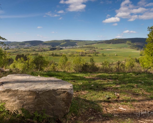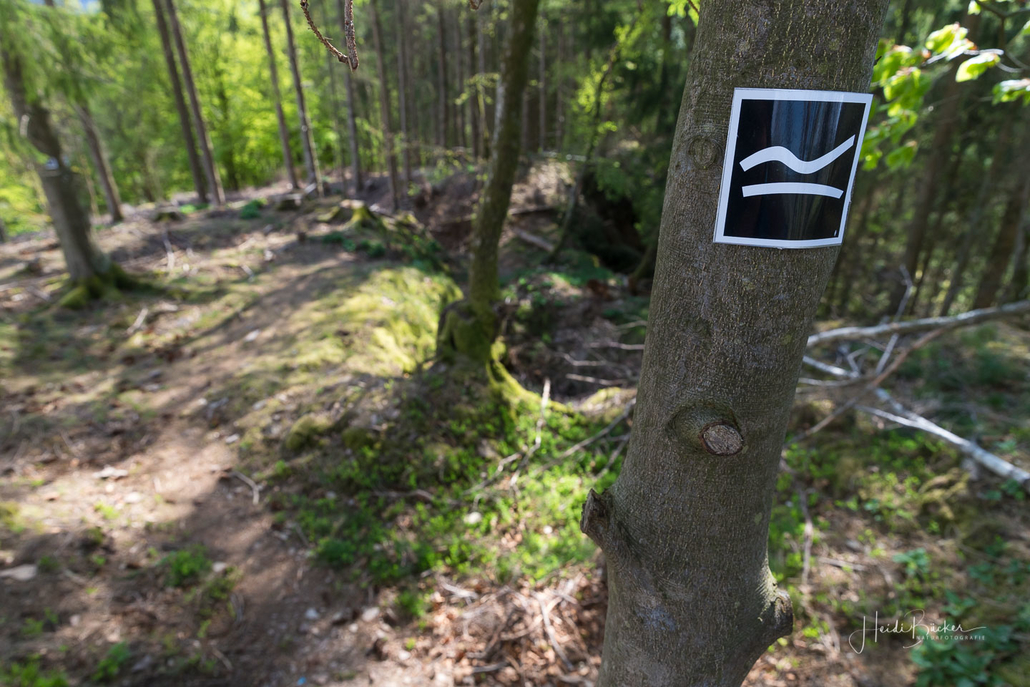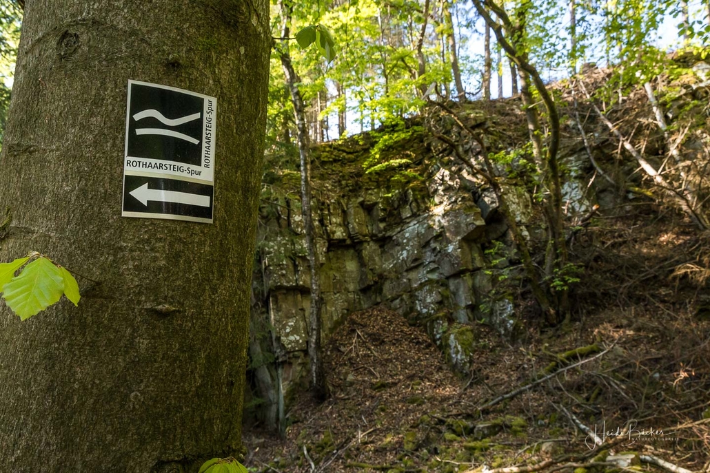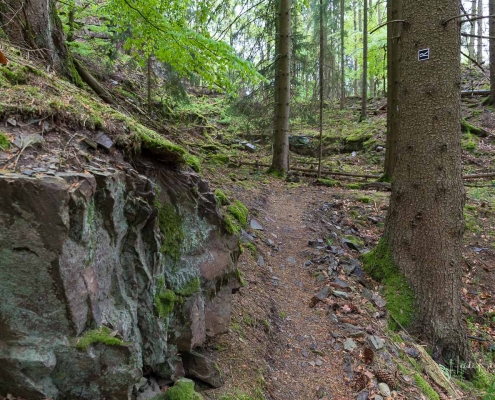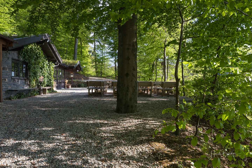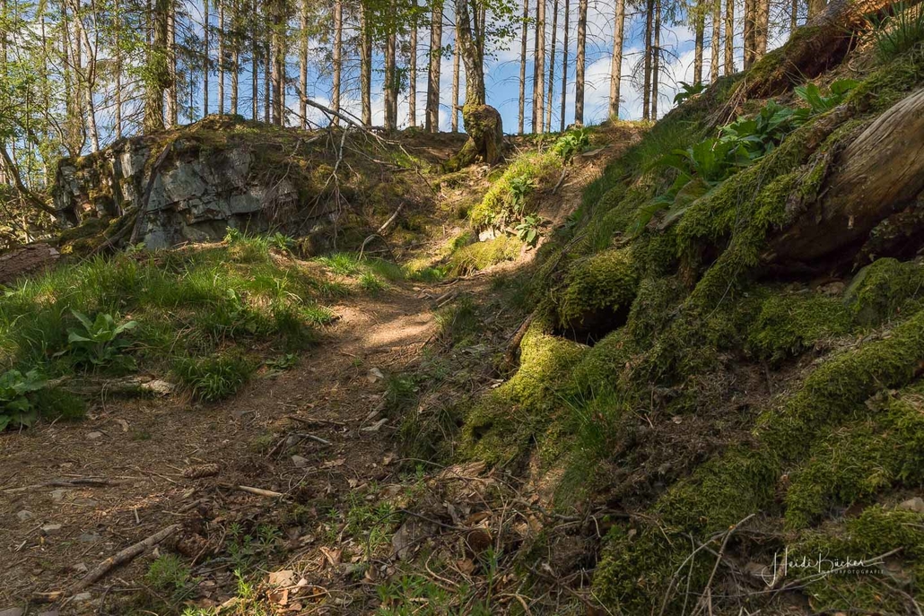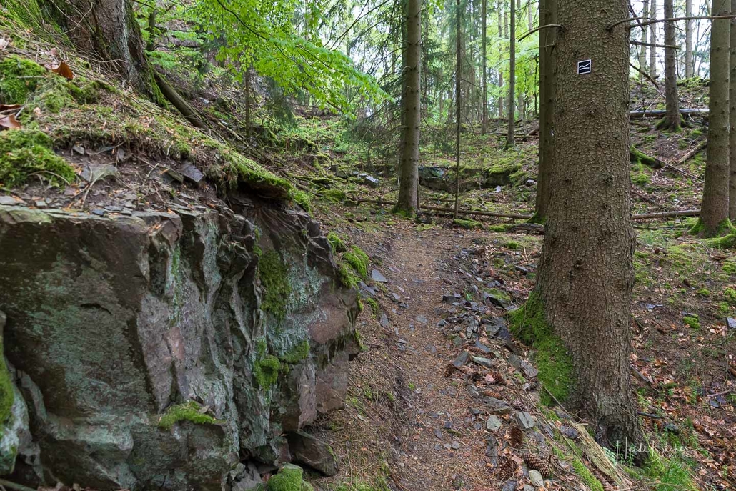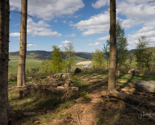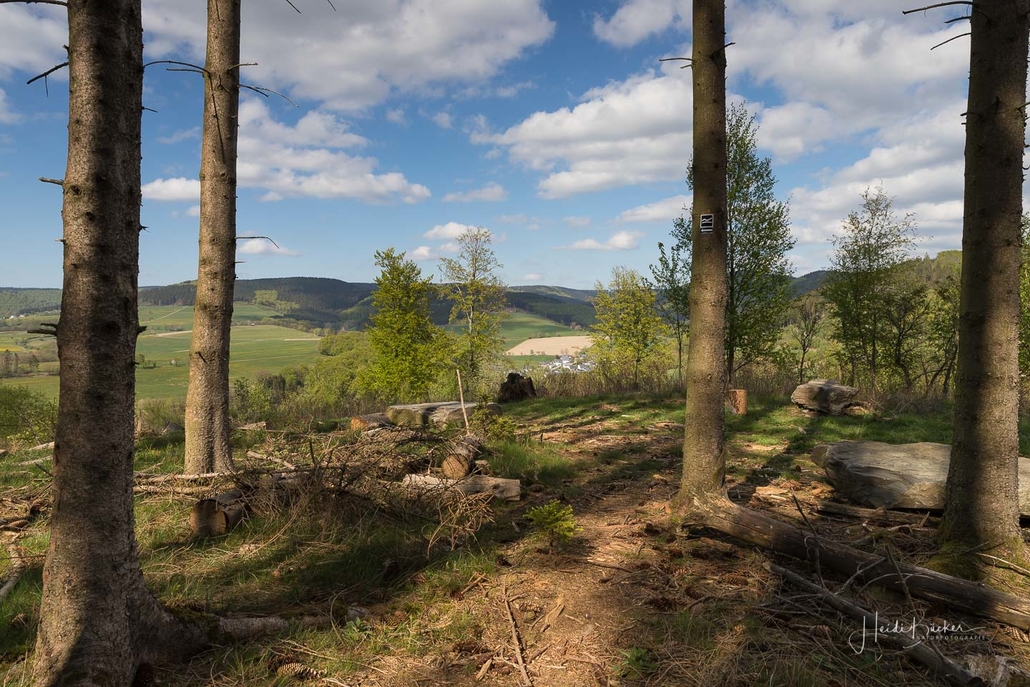 Es geht hinunter in Deimann´s Hotelpark, wo wir einmal den Ententeich umrunden und danach die Sorpe über eine Brücke queren, um anschließend zur Knollenhütte zu gelangen. Am Wochenende bietet sich hier die Möglichkeit zu einer gemütlichen Einkehr mit einer deftigen Mahlzeit oder dem Genuss einer Erfrischung auf der Außenterrasse. Nach dem Einkehrschwung führt uns der nächste kurze Anstieg direkt zum Steinbruch im Knollen. Ab hier sind Trittsicherheit und festes Schuhwerk gefragt. Zudem findet sich hier der Grund dafür, dass wir unsere Rundtour entgegen dem Uhrzeigersinn wandern: Es ist nämlich angenehmer, den Steinbruch bergauf anstatt bergab zu durchqueren. Im Zickzack geht es durch das geschichtsträchtige Gelände in Richtung „Weißes Kreuz“. Spätestens beim Austritt aus dem Steinbruch weiß dann auch jeder Wanderer, warum diese Rundtour den Namen „Panoramapfad“ trägt, denn auch hier bieten sich wieder grandiose Panorama-Aussichten ins Schmallenberger Sauerland.