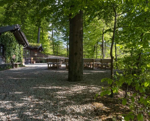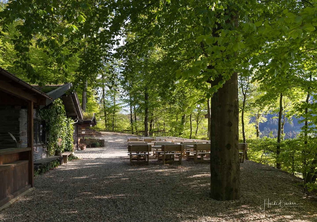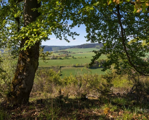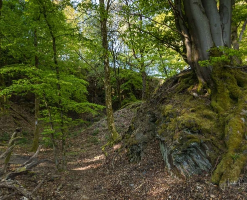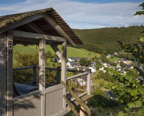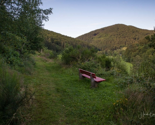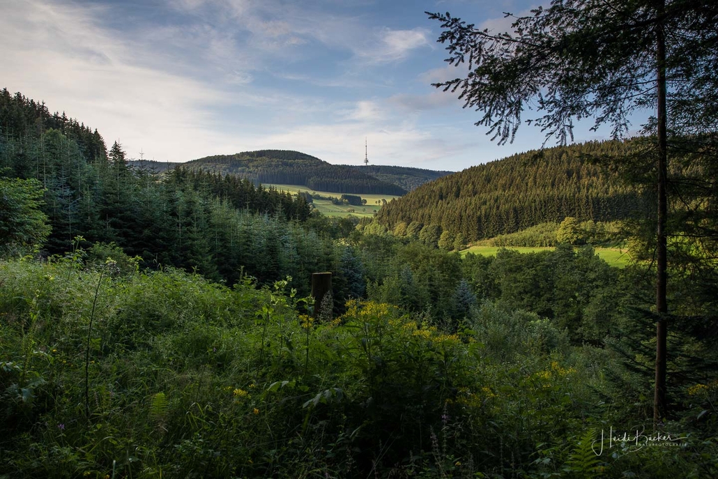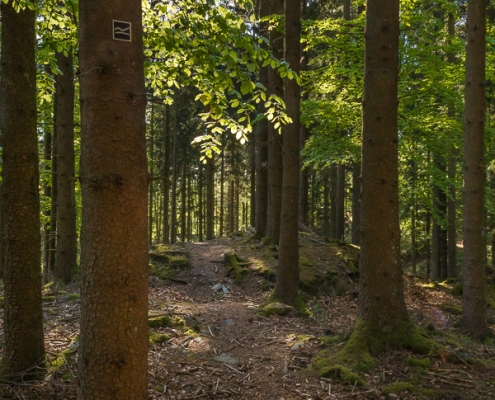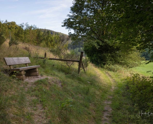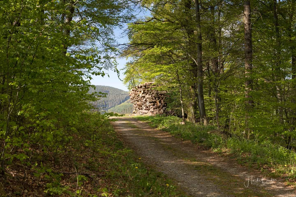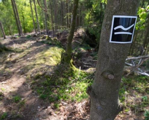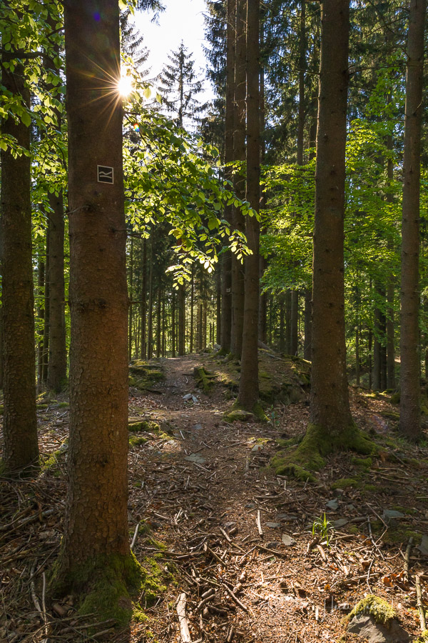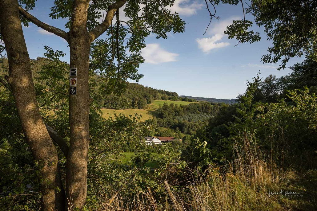Es geht hinunter in Deimann´s Hotelpark, wo wir einmal den Ententeich umrunden und danach die Sorpe über eine Brücke queren, um anschließend zur Knollenhütte zu gelangen. Am Wochenende bietet sich hier die Möglichkeit zu einer gemütlichen Einkehr mit einer deftigen Mahlzeit oder dem Genuss einer Erfrischung auf der Außenterrasse. Nach dem Einkehrschwung führt uns der nächste kurze Anstieg direkt zum Steinbruch im Knollen. Ab hier sind Trittsicherheit und festes Schuhwerk gefragt. Zudem findet sich hier der Grund dafür, dass wir unsere Rundtour entgegen dem Uhrzeigersinn wandern: Es ist nämlich angenehmer, den Steinbruch bergauf anstatt bergab zu durchqueren. Im Zickzack geht es durch das geschichtsträchtige Gelände in Richtung „Weißes Kreuz“. Spätestens beim Austritt aus dem Steinbruch weiß dann auch jeder Wanderer, warum diese Rundtour den Namen „Panoramapfad“ trägt, denn auch hier bieten sich wieder grandiose Panorama-Aussichten ins Schmallenberger Sauerland.