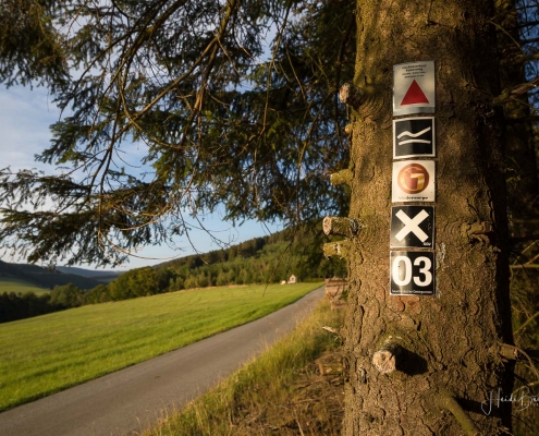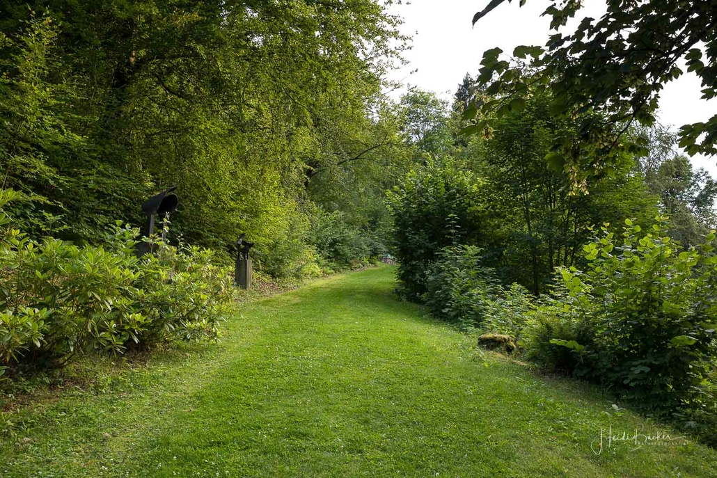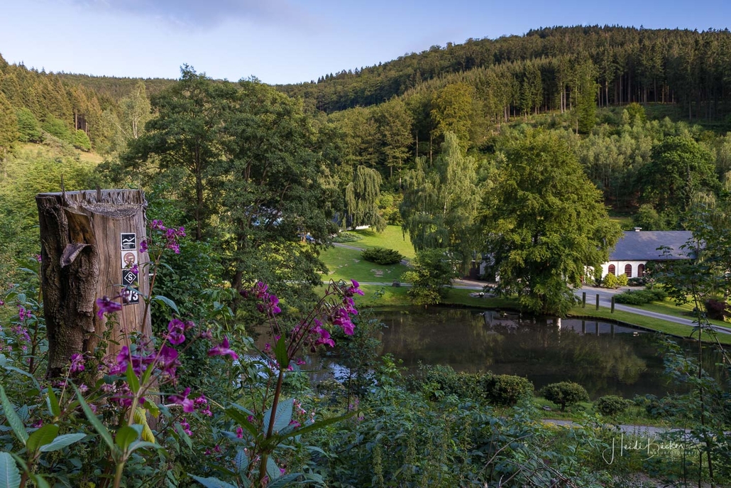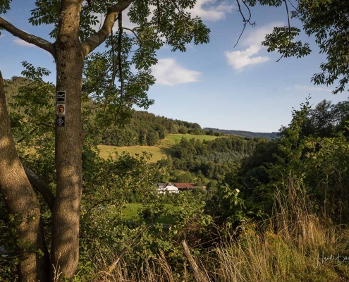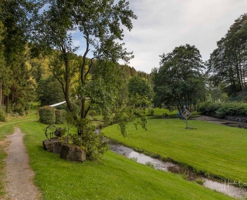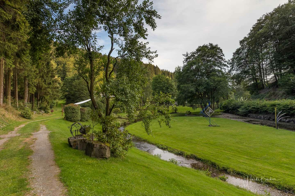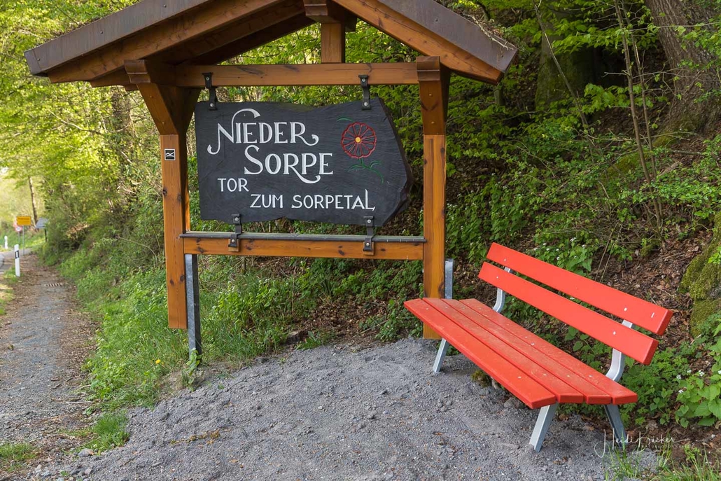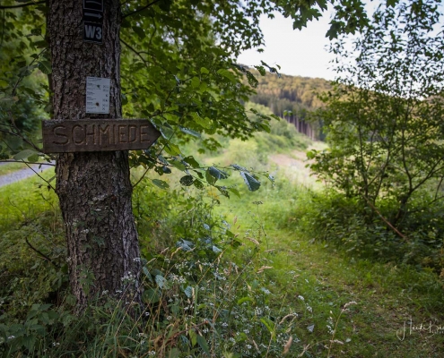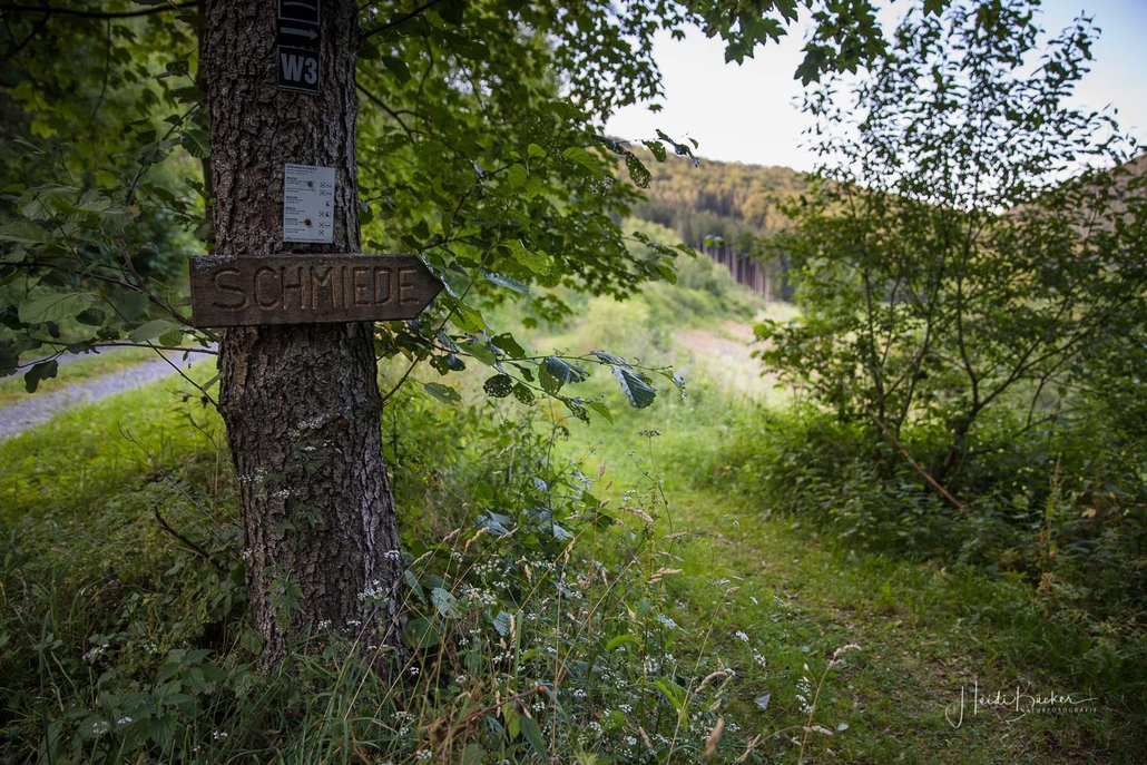 Vom Weißen Kreuz geht es weiter über einen urigen Wurzelpfad zurück nach Niedersorpe. Allerdings ist unsere Tour hier noch lange nicht zu Ende, denn wir lassen das Dorf links liegen und folgen den Wegweisern in Richtung Waldemei, wo sich die Kunstschmiede Klute befindet. Der Wanderweg führt mitten durch den beeindruckenden Ausstellungsgarten, wo wir einen Einblick in die Schmiedekunst erhalten. Das Gleiche erwartet uns nochmal in der Rellmecke, wo sich die Schmiedewelten Dünnebacke mit ihrer Handwerkskunst präsentieren. In der Rellmecke überqueren wir die Straße und gehen bei Dünnebacke hinterm Haus über eine Wiese, bis wir wieder auf einen Waldweg treffen. Ab hier wandern wir über naturnahe Pfade und Wege mit weiteren schönen und abwechslungsreichen Aussichten – diesmal auf der gegenüberliegenden Talseite der Sorpe – zurück zum Ausgangspunkt unserer Wanderung nach Niedersorpe.